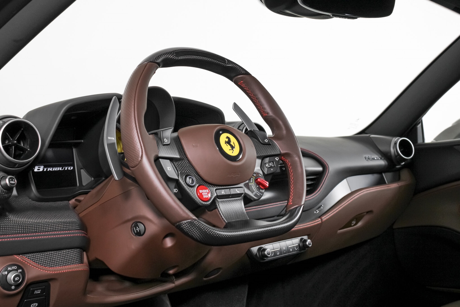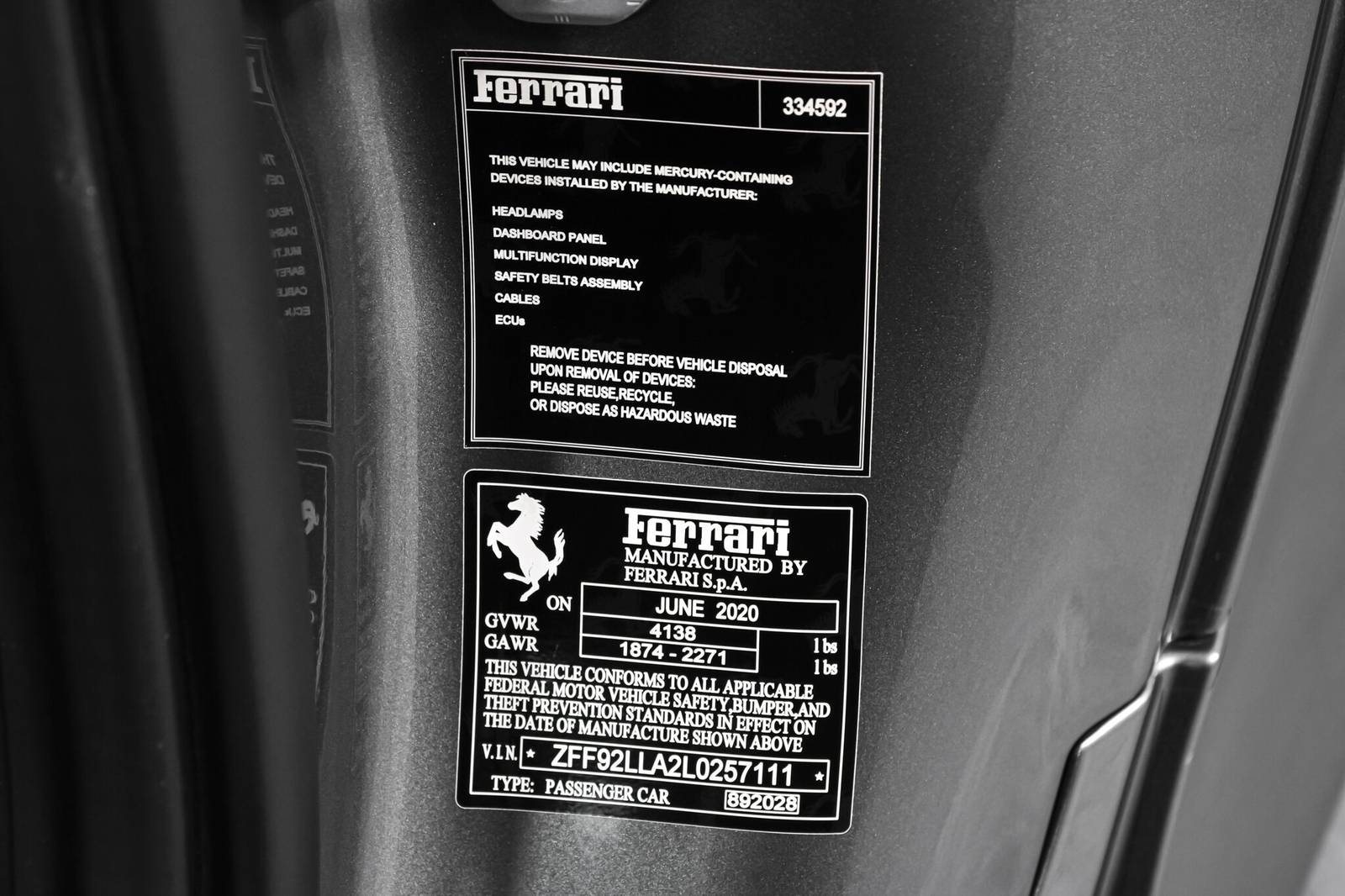 Ferrari South Bay is proud to offer this gorgeous, low-mileage, 2020 F8 Tributo finished in Ferrari's Historic Grigio Ferro with Cioccolato Leather stitched in Red. It is a Ferrari Certified Pre-Owned car, perfect for a cruise up the coast or a day running your favorite canyons. Sporting an original MSRP of $423,177 - this is one very special Tributo!Designed to slice through the air, the F8 Tributo boasts a sleek and aerodynamic profile that not only enhances performance but also exudes an aura of sheer elegance. Every curve is meticulously crafted to optimize both form and function. The Grigio Ferro exterior sports Forged Wheels in Grigio Corsa with Diamond finish framing Carbon Ceramic Brakes with Black brake calipers. Scuderia Ferrari shields adorn the front fenders. The car boasts many exterior carbon fiber upgrades, including the Front and Side Air Splitters, S-Duct and Rear Diffuser. The beautifully purposeful look is capped with Titanium Exhaust tips.The heart of any Ferrari is its engine, and the F8 Tributo is no exception. A roaring 710-horsepower Twin Turbocharged 3.9 Liter V8 delivers power through a 7-speed dual-clutch transmission, and propels you from 0 to 60 mph in just 2.9 seconds!Inside, you'll find Cioccolato Leather with Specific Design Full Electric seats with Rosso stitching (including Cavalinos embroidered into the headrests). The steering wheel is Carbon Fiber accented with Cioccolato Leather, complete with Ferrari's signature LED shift lights, in front of a tachometer finished in yellow. The Instrument Cluster, Central Bridge, Upper Tunnel, and Inner Door Handles are all finished in rare Matt Carbon Fiber (and so is the trim in the boot). Advanced Front Driving Camera and Front Parking Sensors assist when maneuvering in tight spaces, and the suspension lifter assists with steep driveways. If the car itself doesn't keep your passenger entertained (and it will), there's a passenger display that keeps them in the action, as well as Apple Carplay to handle the music. Other desirable equipment include Electrochromic Rearview Mirrors, Homelink Garage Door openers, and Ferrari Telemetry. The cabin of this Tributo is truly a wonderful place to be!The car is complete with two keys, original books and toolkit, as well as the original car cover and battery tender. The Ferrari Complimentary Genuine Maintenance is in effect until 8/11/2027 and the Power15 Warranty is in effect until 2/11/2025.