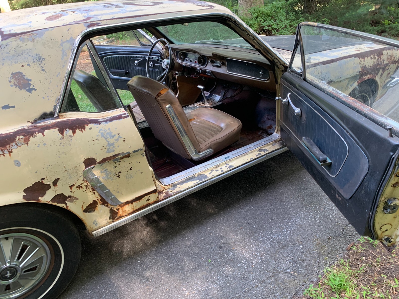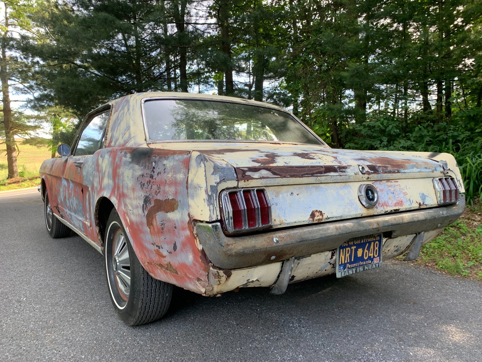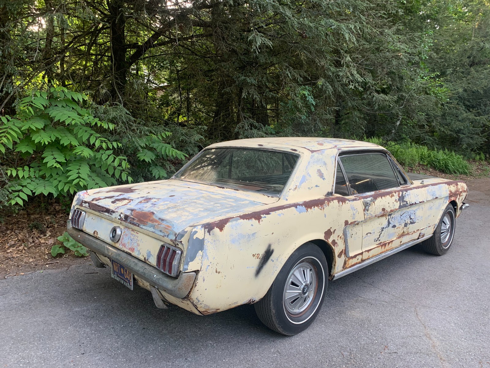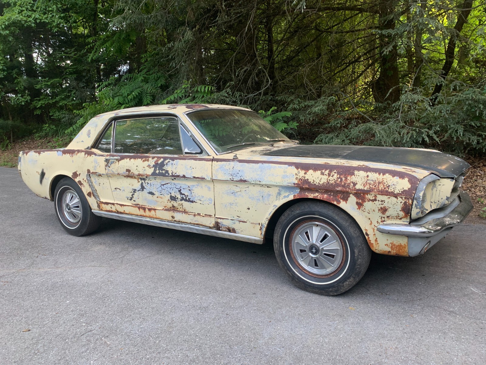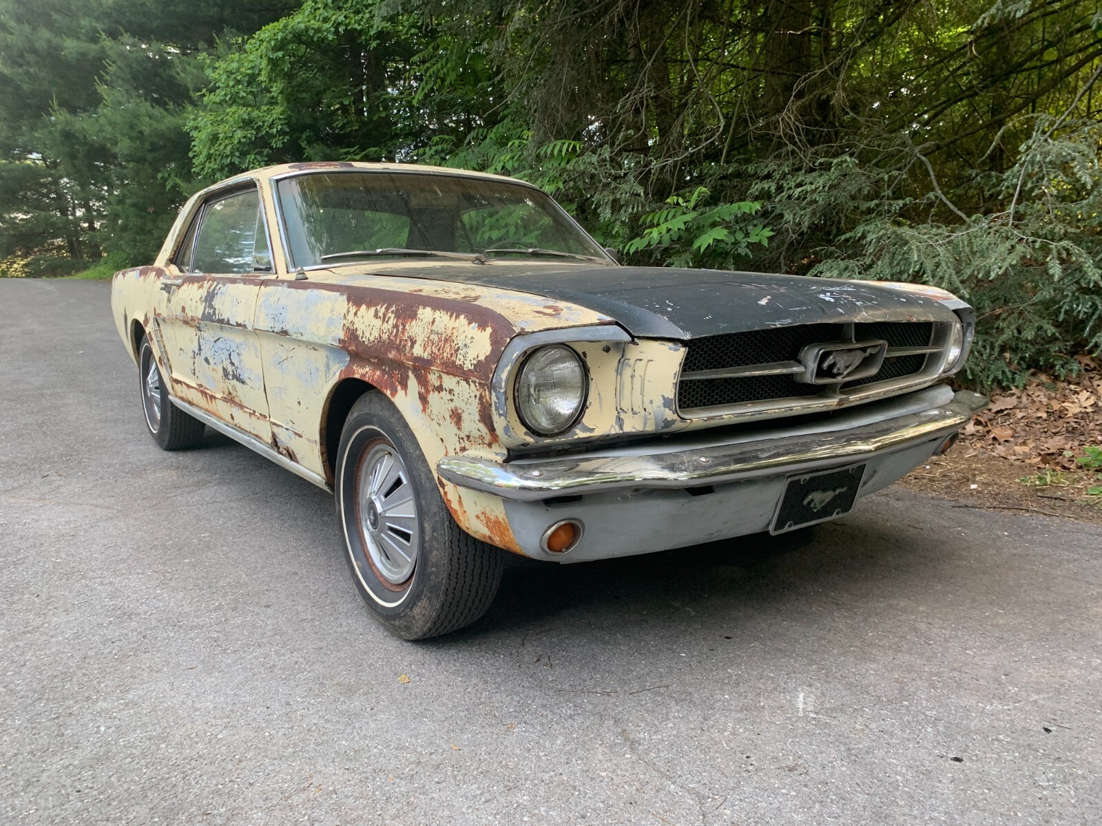 1964.5 mustang coupe V8 project for restoration. D code, power steering car from the factory, with burgundy exterior. Now has a running 302 motor and was painted yellow many years ago. Starts easily with key, motor sounds strong running off fuel tank. Has brakes with many new parts to all 4 wheels. Car runs and drives in yard, it takes trans a while to shift into forward, you have to play with it, reverse still works, trans needs a rebuild. Complete interior to restore with a nice dash pad. Car looks a little rough on the outside but has good engine bay, solid frames and Tork boxes, floors can be patched, and a new battery apron has been bolted in. Power steering pump and some parts in trunk. See pictures for work needed there is always more to do. clear PA title on hand from last owner, it matches apron vin. and door tag. We always help load and have machine on hand. Deposits are non-refundable. Bidders with less than 10 positive feedback contact us before bidding. We reserve the right to cancel any bid.