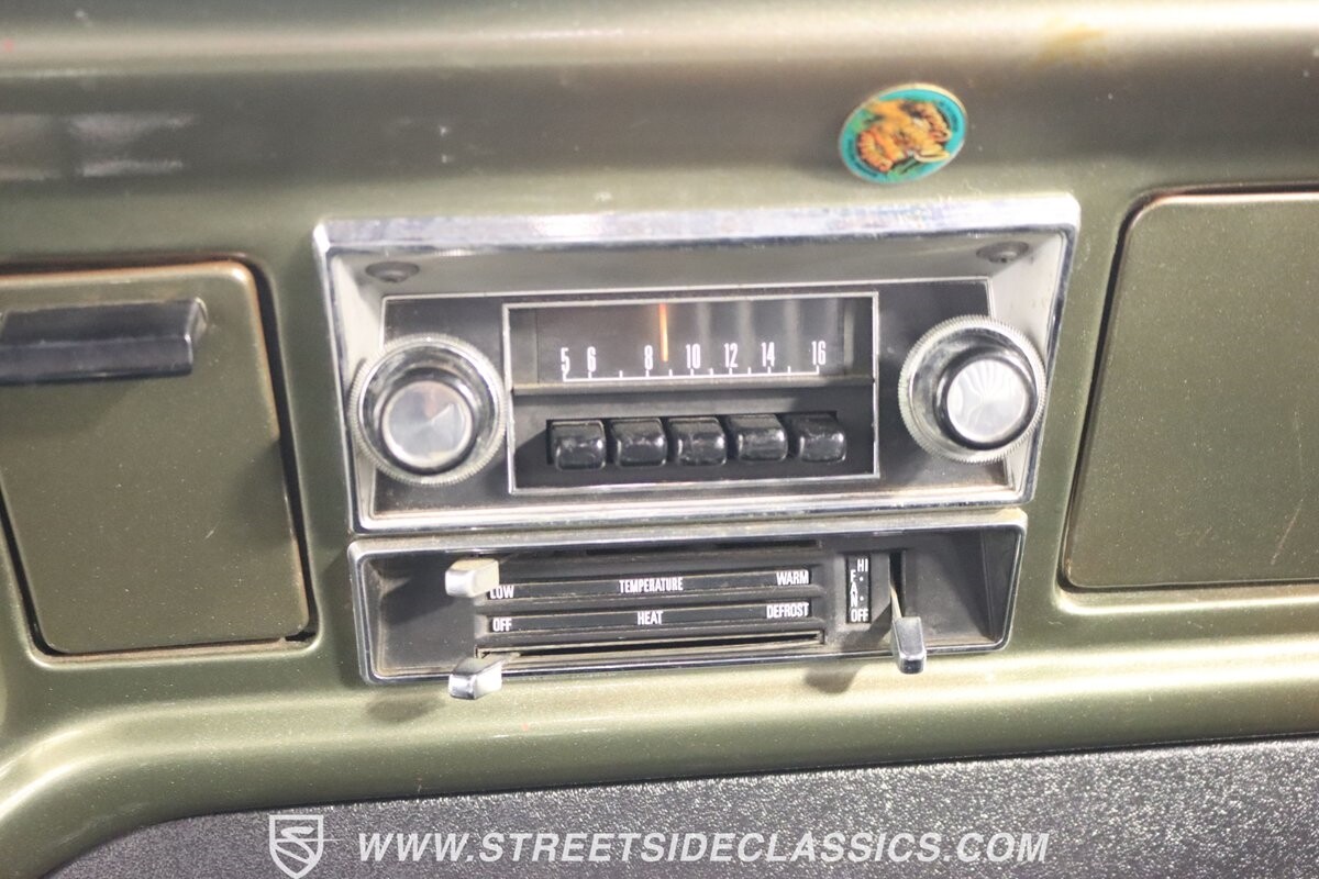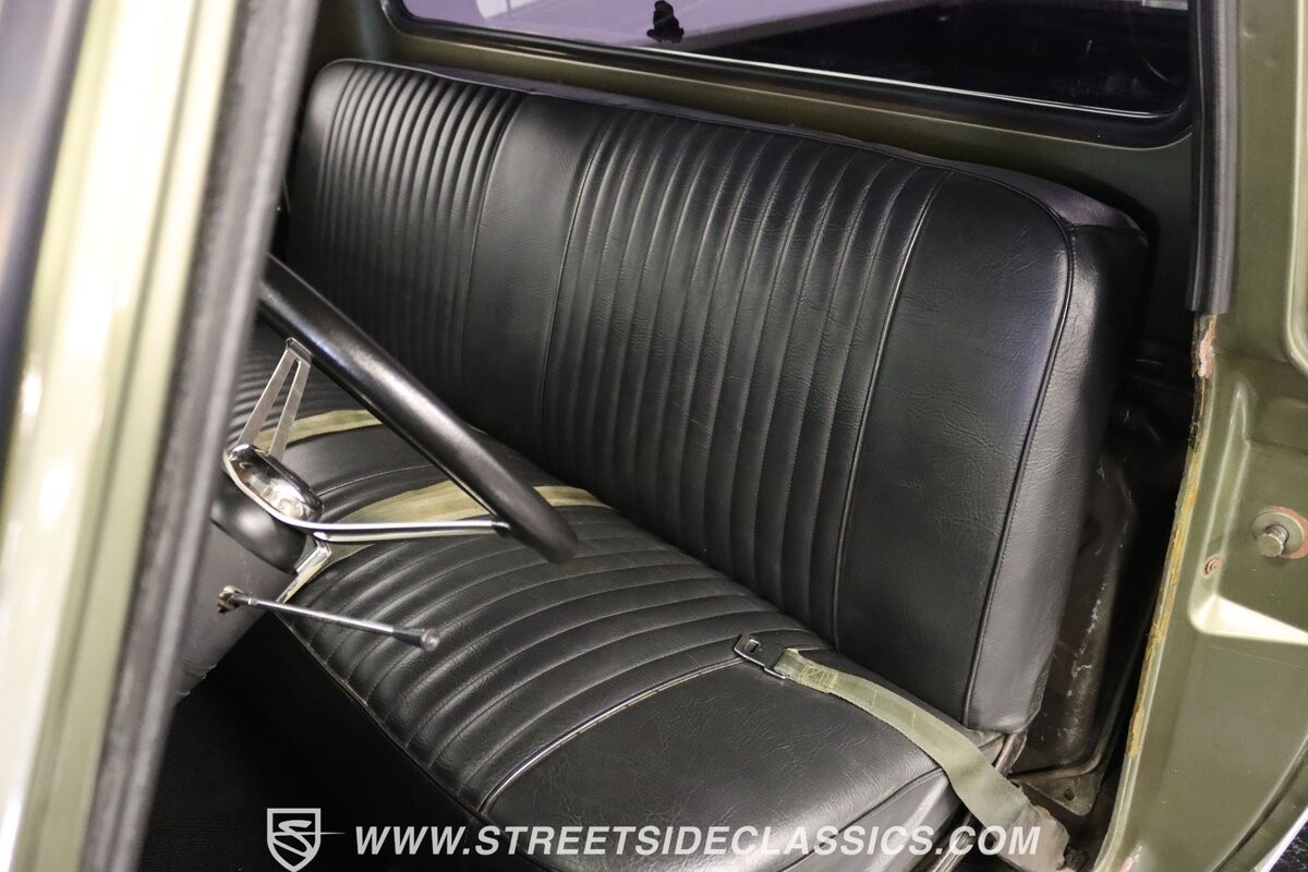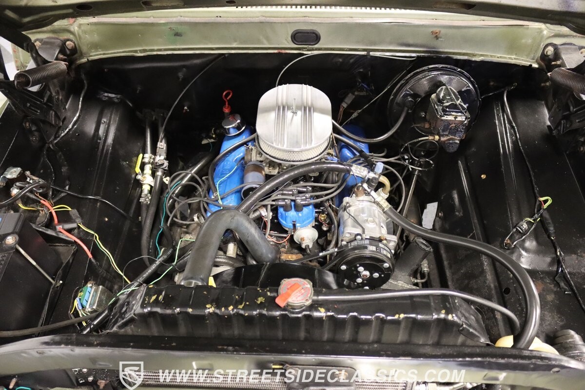 Inside the cab is clean with a black bench seat, upgraded steering wheel and a set of gauges under the dash that monitor volts, oil pressure and temperature. A custom molded black headliner holds an AM/FM/CD/AUX Bluetooth stereo and speakers. The original Ford AM radio is still in the dash. Additionally, this truck is fitted with cold air conditioning charged with modern 134a freon.