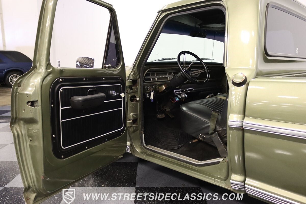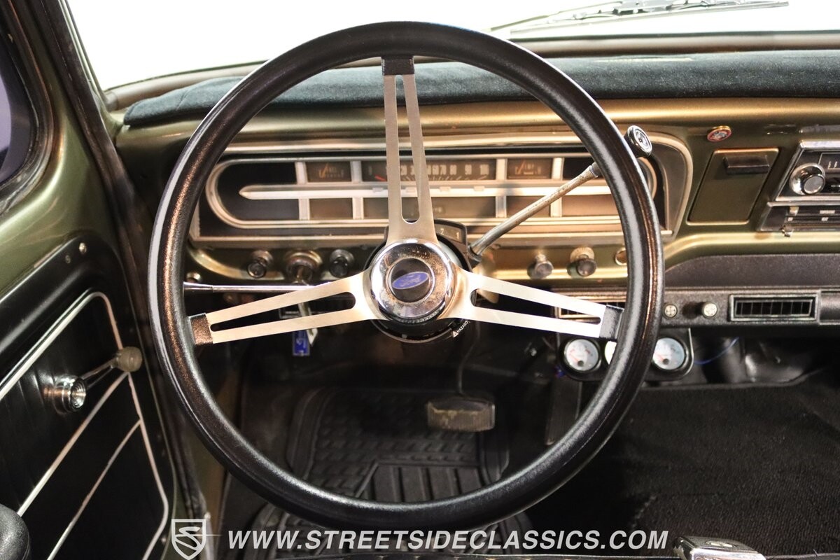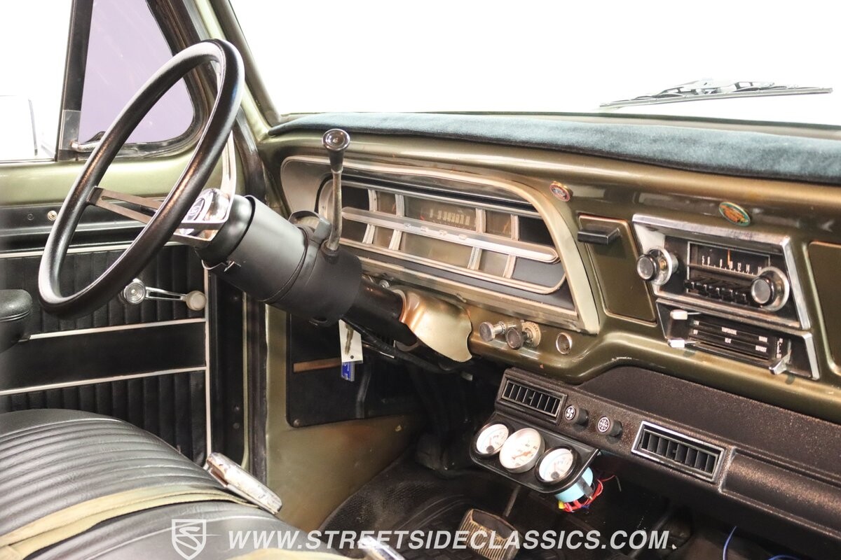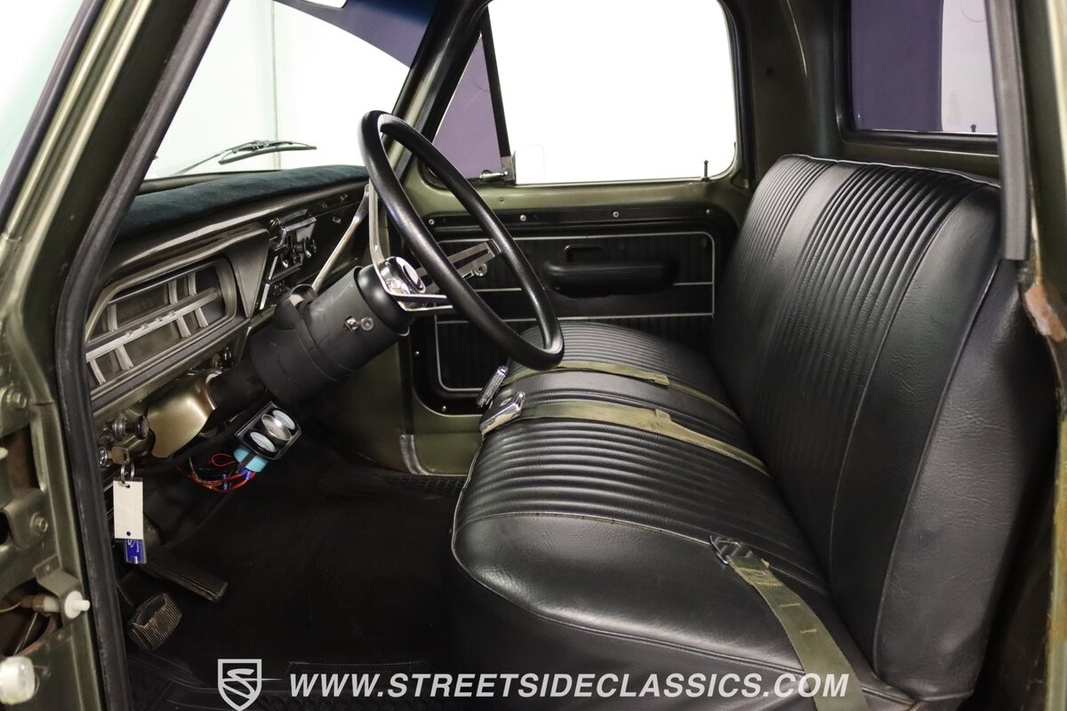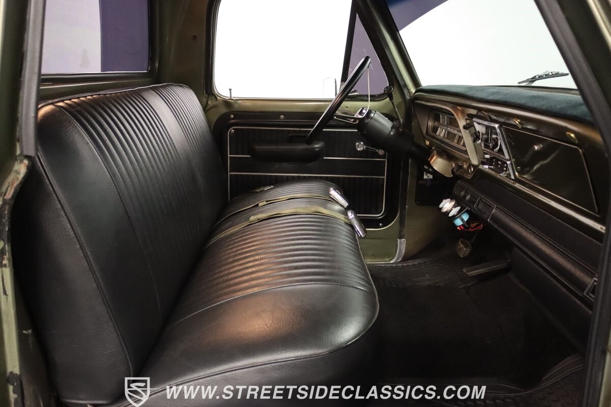 Powering this classic F-100 is a smooth-running 302 V8 engine mated to a column shifted 3-speed automatic transmission that sends power back to a 9-inch rear end. The engine bay is clean and tidy with an Edelbrock carburetor topped with an upgraded open element air cleaner, power steering, power front disc brakes and dual Flowmaster exhaust.