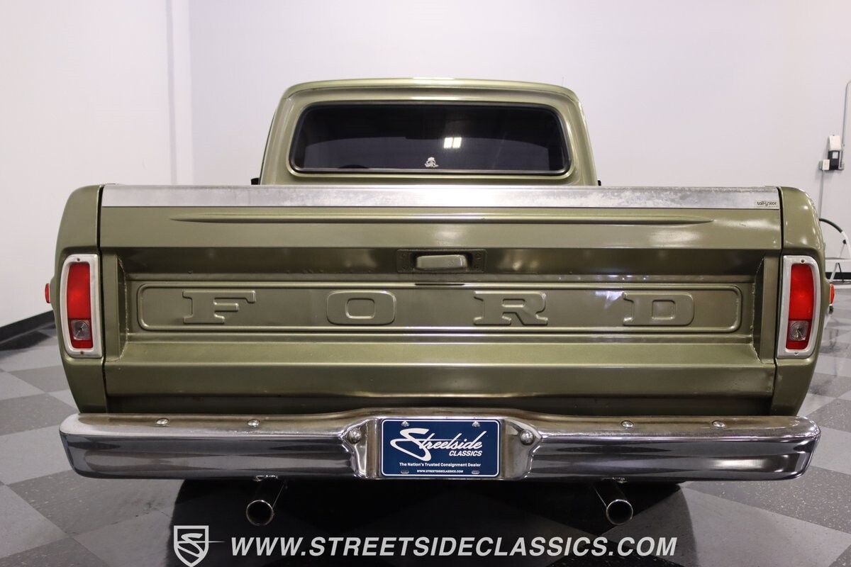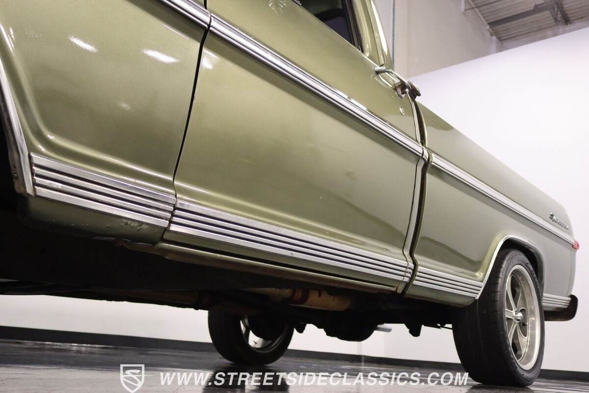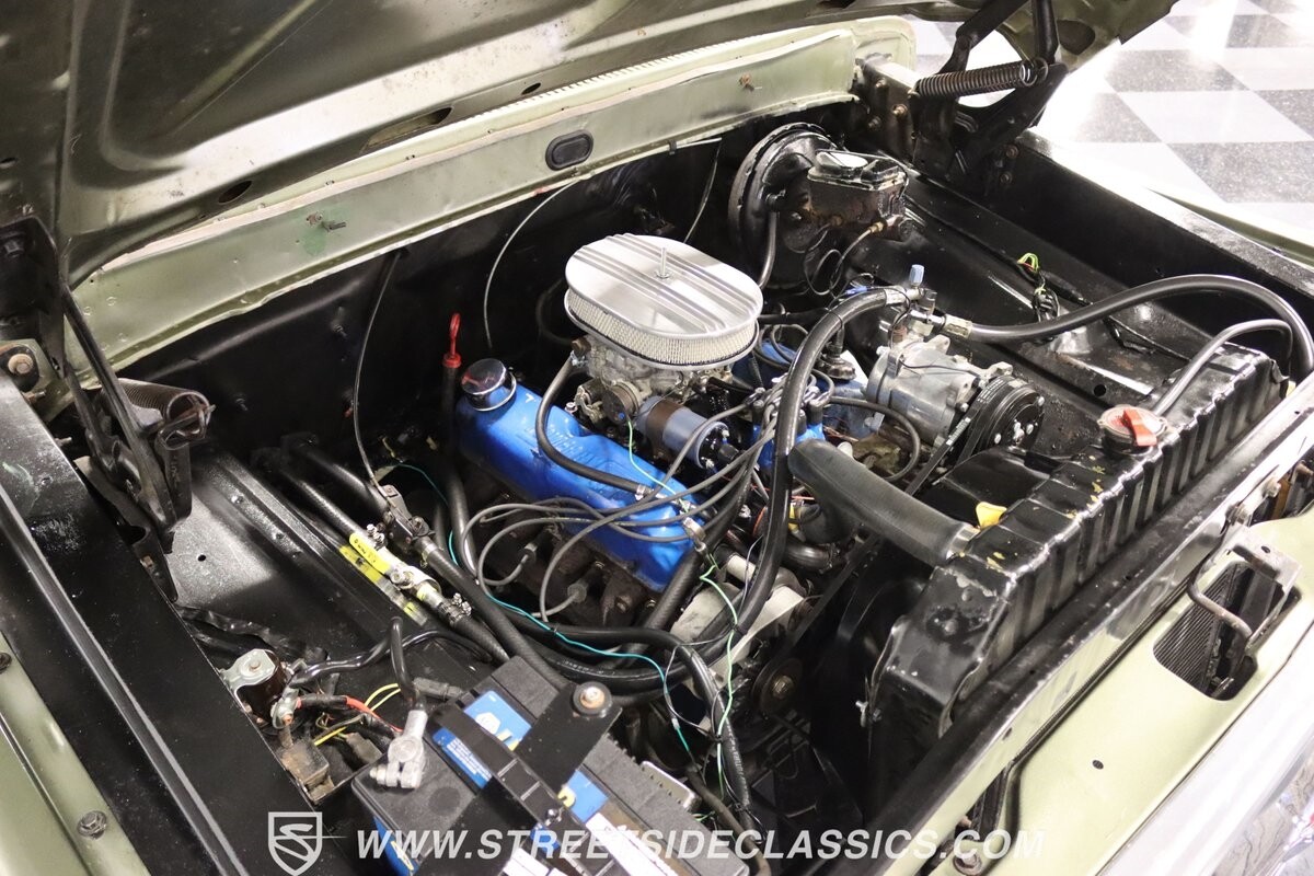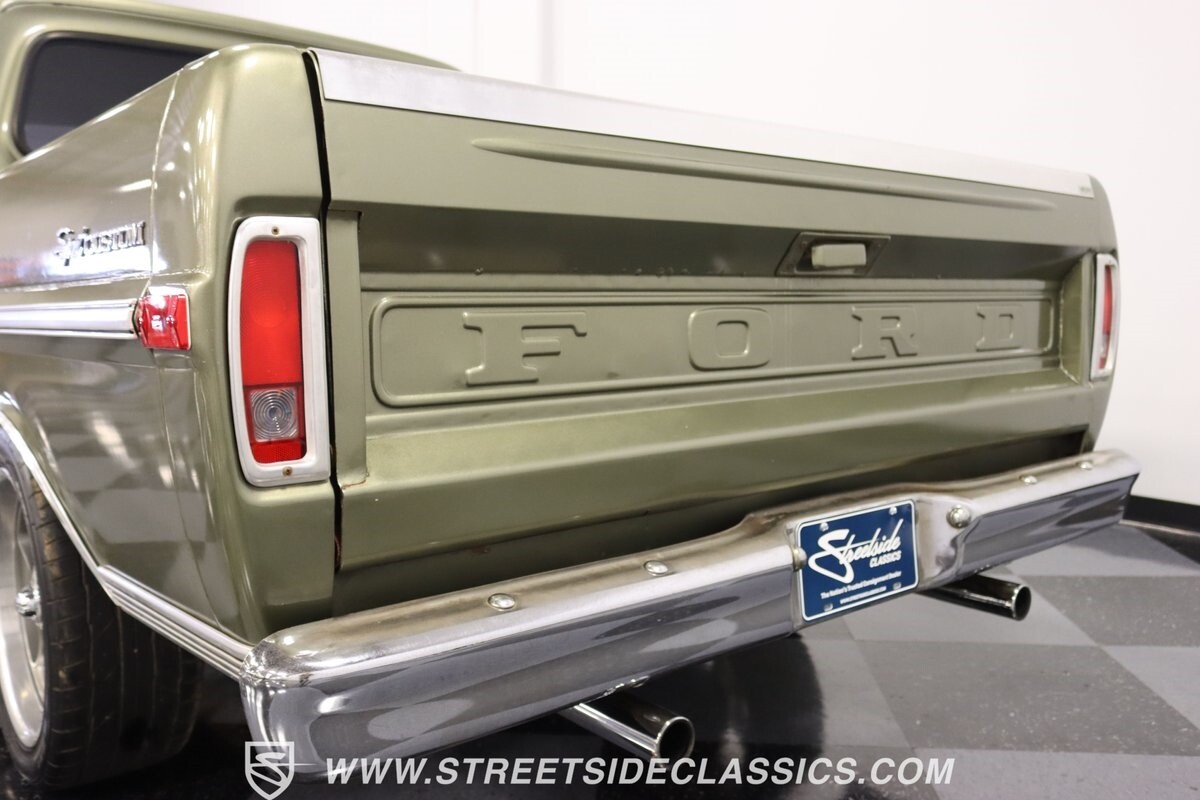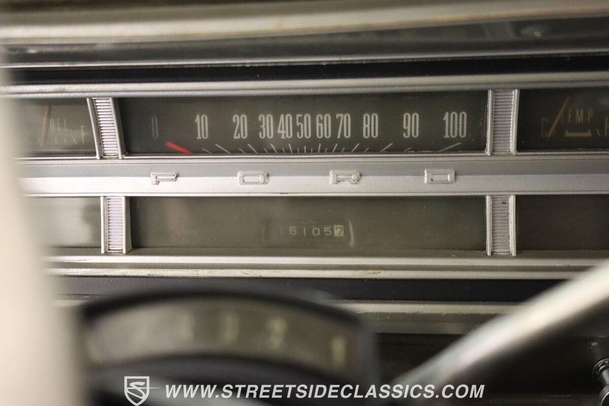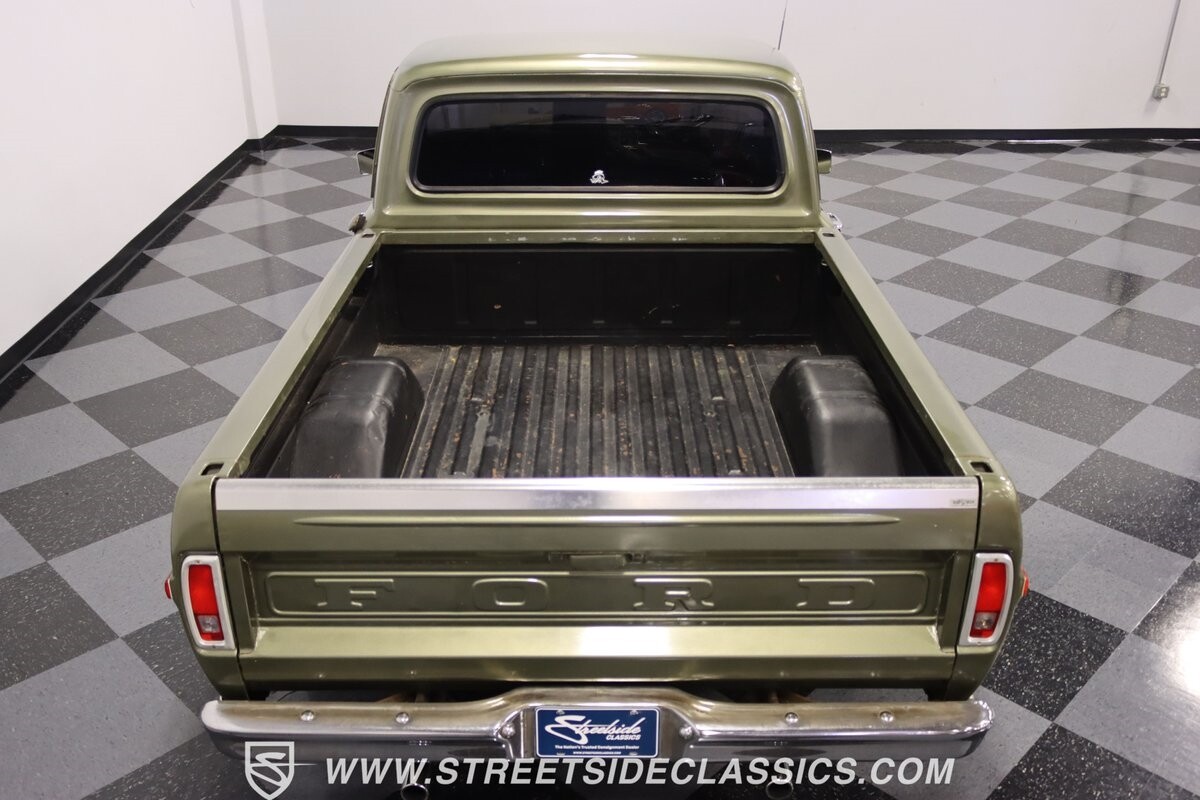 Powering this classic F-100 is a smooth-running 302 V8 engine mated to a column shifted 3-speed automatic transmission that sends power back to a 9-inch rear end. The engine bay is clean and tidy with an Edelbrock carburetor topped with an upgraded open element air cleaner, power steering, power front disc brakes and dual Flowmaster exhaust.