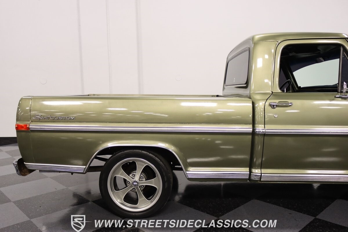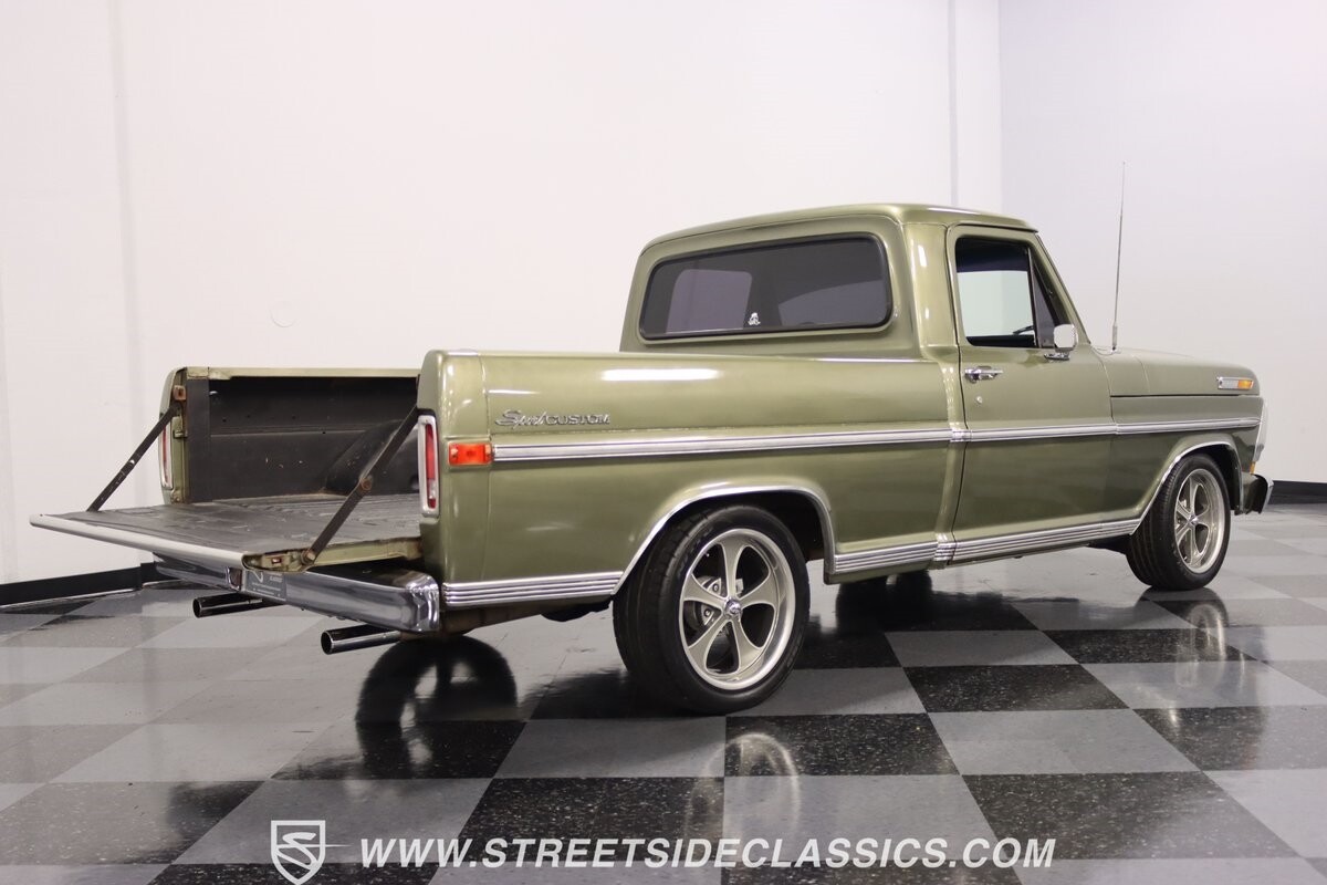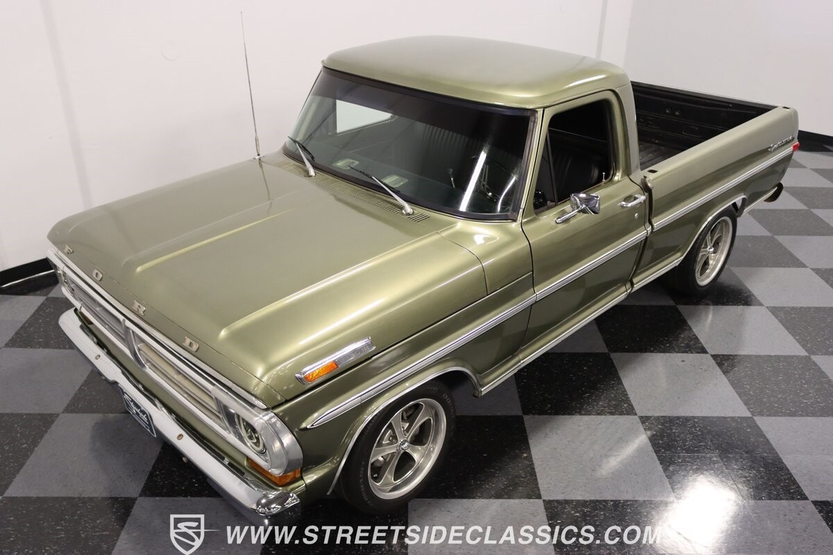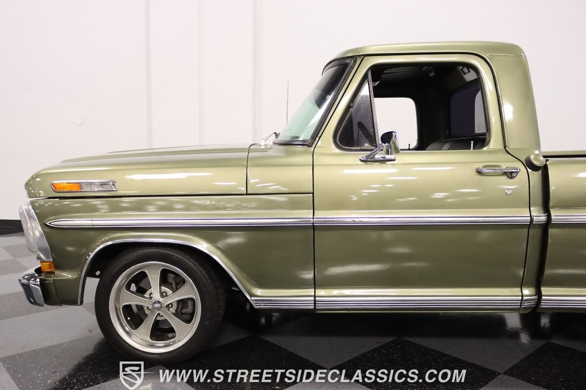 One of the most popular trucks of all time is the Ford F-100 and looking at this handsome 1972 Ford F-100 Sport Custom short bed pickup truck it is easy to understand why. The Sport Custom package comes with deluxe trim that includes side moldings, wheel opening moldings, rocker panel trim and chrome bumpers. This truck is painted in the factory color of Light Metallic Ginger (code R) that is showing a patina and a character that looks great on this truck's very straight body. A set of staggered Ridler wheels 17 inch front and 18 inch rear, enhance the look of this classic truck immensely.