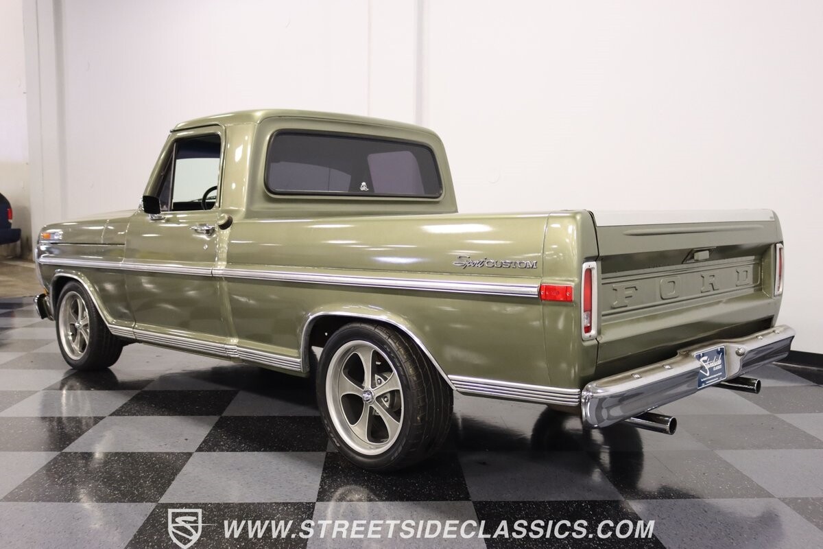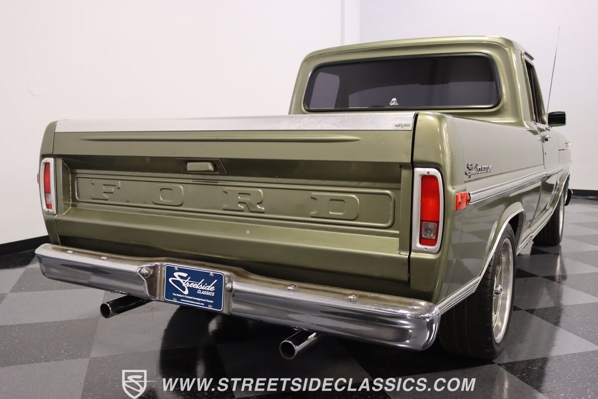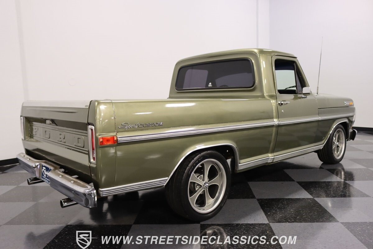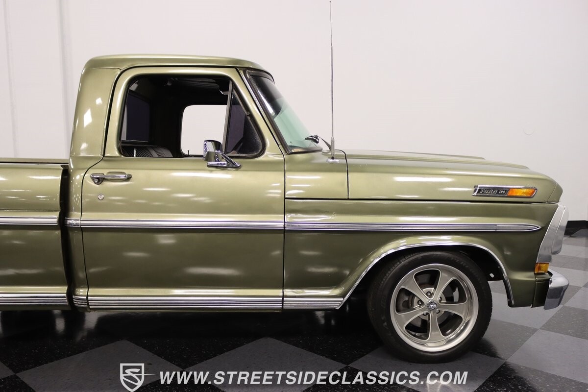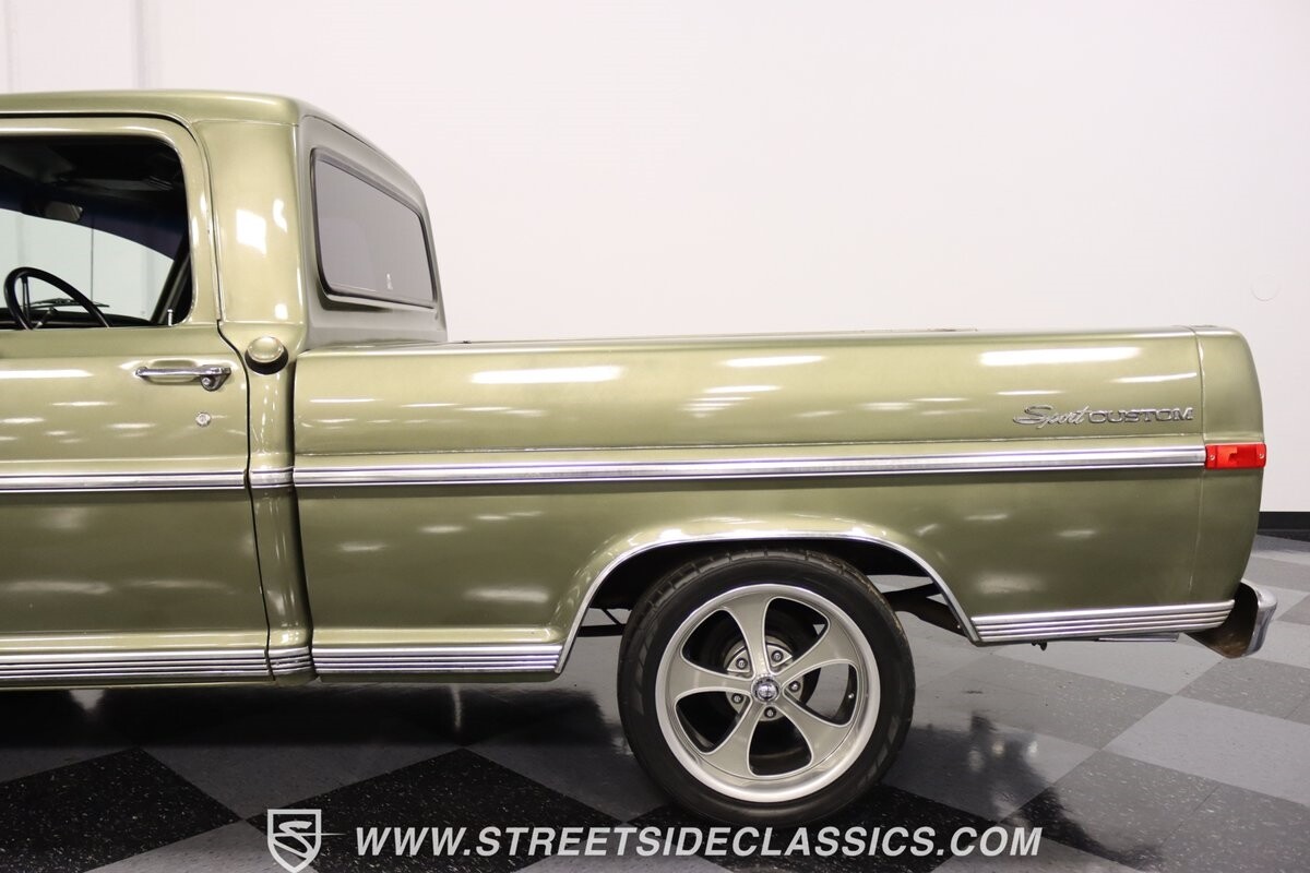 One of the most popular trucks of all time is the Ford F-100 and looking at this handsome 1972 Ford F-100 Sport Custom short bed pickup truck it is easy to understand why. The Sport Custom package comes with deluxe trim that includes side moldings, wheel opening moldings, rocker panel trim and chrome bumpers. This truck is painted in the factory color of Light Metallic Ginger (code R) that is showing a patina and a character that looks great on this truck's very straight body. A set of staggered Ridler wheels 17 inch front and 18 inch rear, enhance the look of this classic truck immensely.
