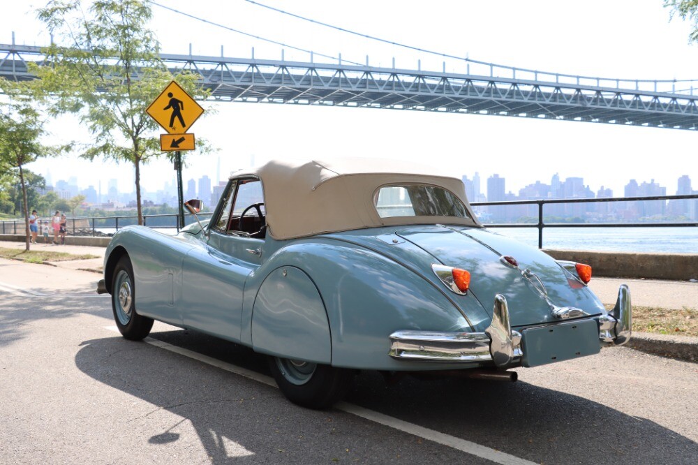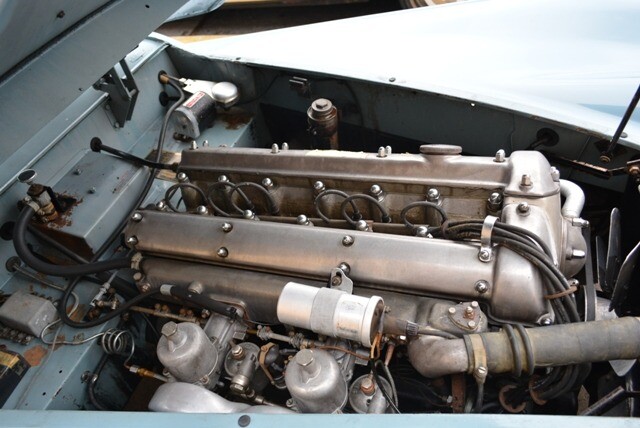 This survivor condition 1956 Jaguar XK140 Drophead Coupe is a matching numbers example and a two owner car with 16k original miles from new. Light blue with original red leather interior. It's had just one repaint in its original color and is a solid rust free car. Mechanically strong, it starts right up, runs, and drives well. We would still recommend servicing at this time including brakes and tires. This highly original XK140 Drophead Coupe is elegance personified and represents a fantastic investment in today's market. A wonderful opportunity to acquire Jaguars iconic mid-1950s sports car with incredibly low mileage.