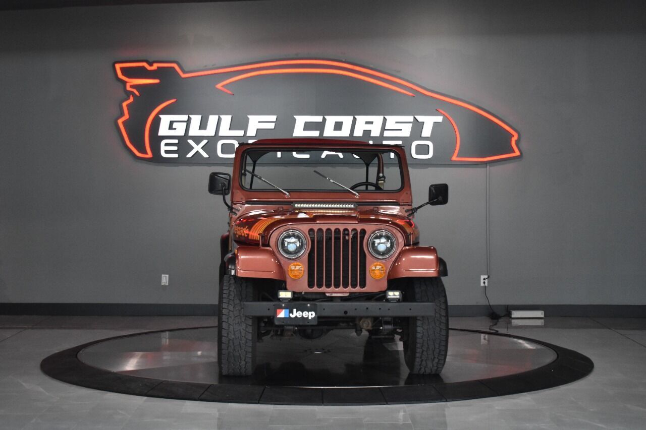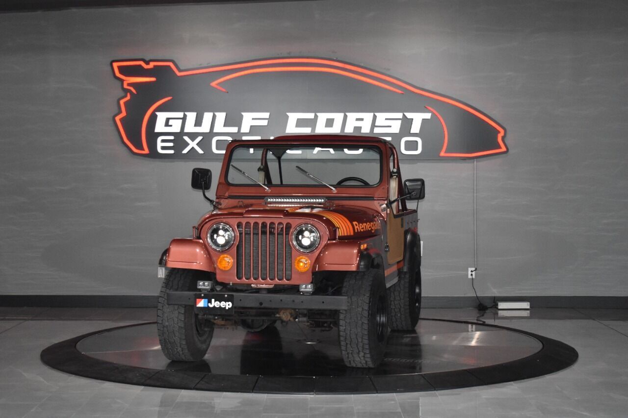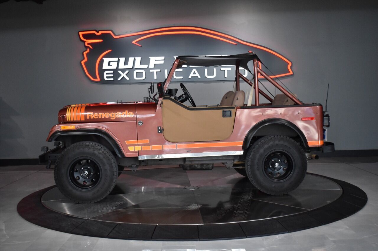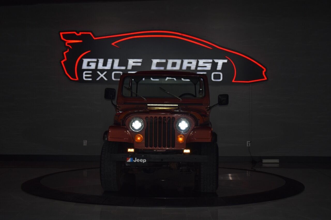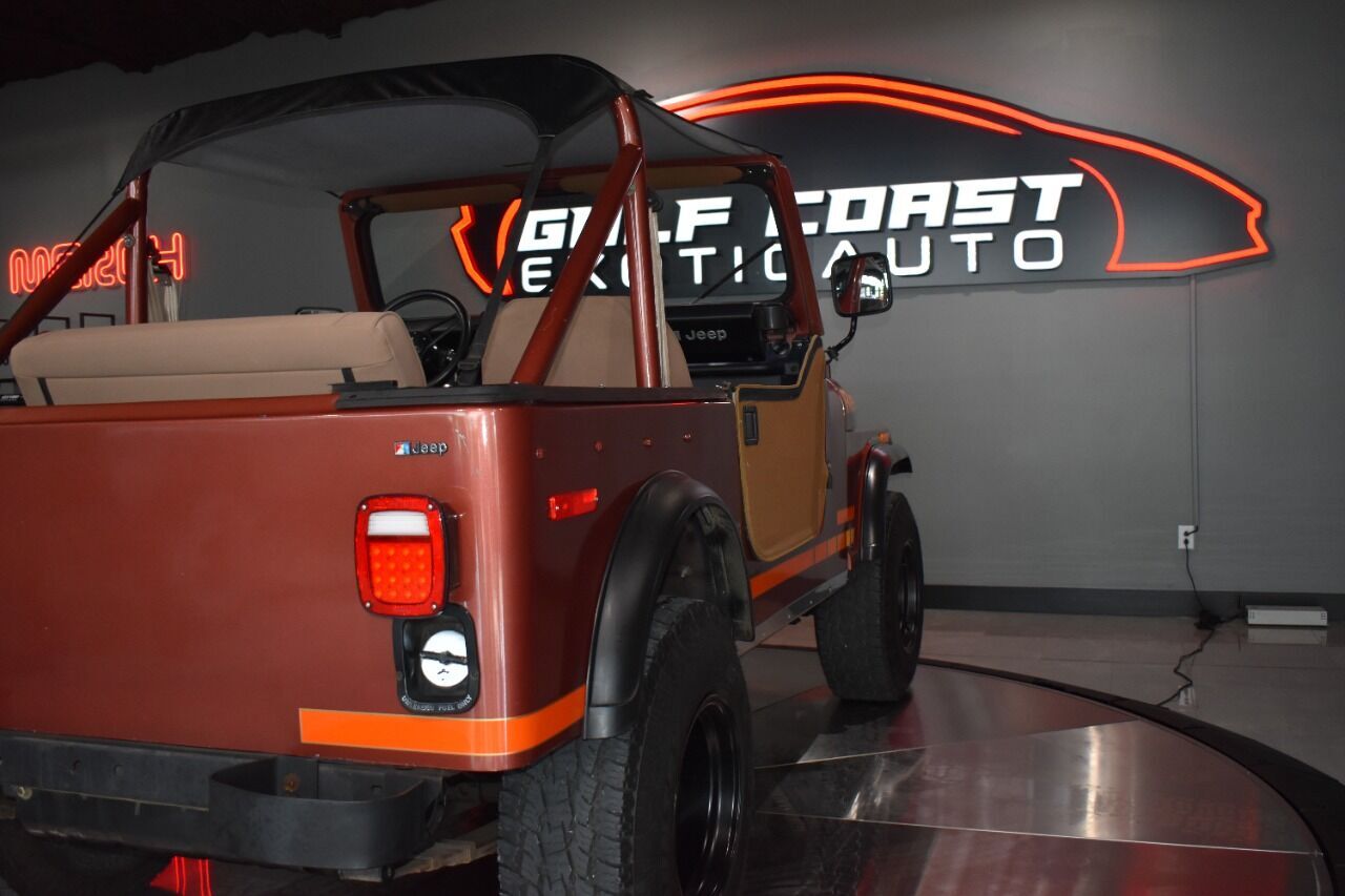1979 Jeep CJ7 Renegade now available at Gulf Coast Exotic Auto. ** Air Condition **4.2 Inline 6 ** Automatic Transmission ** Fiberglass Tub ** This CJ-7 is powered by a 4.2 liter Inline 6 engine mated to an automatic transmission and utilizing Quadra-Trac 4x4 system. This CJ has a 2 suspension lift making room for the 31 Toyo All Terrains with Black 15 American Racing Wheels. The Root beer exterior paint is paired with black wheels. The headlights have already been upgraded to LED. The clean Tan interior is furnished with A/C, Rugged Ridge vinyl seats, Black leather wrapped steering wheel and color matching roll bar. It only has a Tuffy locking glove box and locking center console. Everything works as it should. Runs and drives GREAT! The odometer show 75,228 on the odometer but true miles are unknown. This turn-key Jeep is ready to cruise on a road trip or off road to the trails in style! The CJ7 Jeeps are only going up in value and there become less available every year. Comes with a full tan soft top, 2 sets of full soft doors, and a bikini top For more information please call Jonathan228-220-0298 or Chris228-220-0298. We Offer Finance Options, Trade-Ins, Extended Warranties, and World Wide Shipping.
