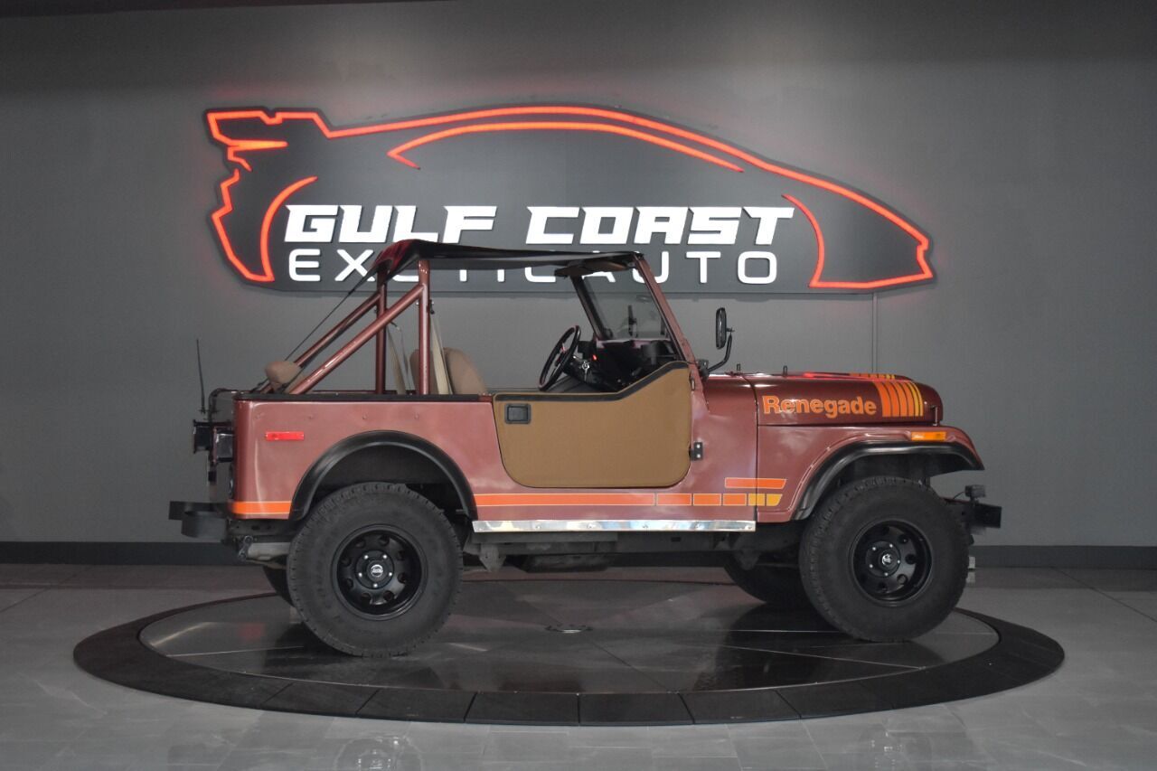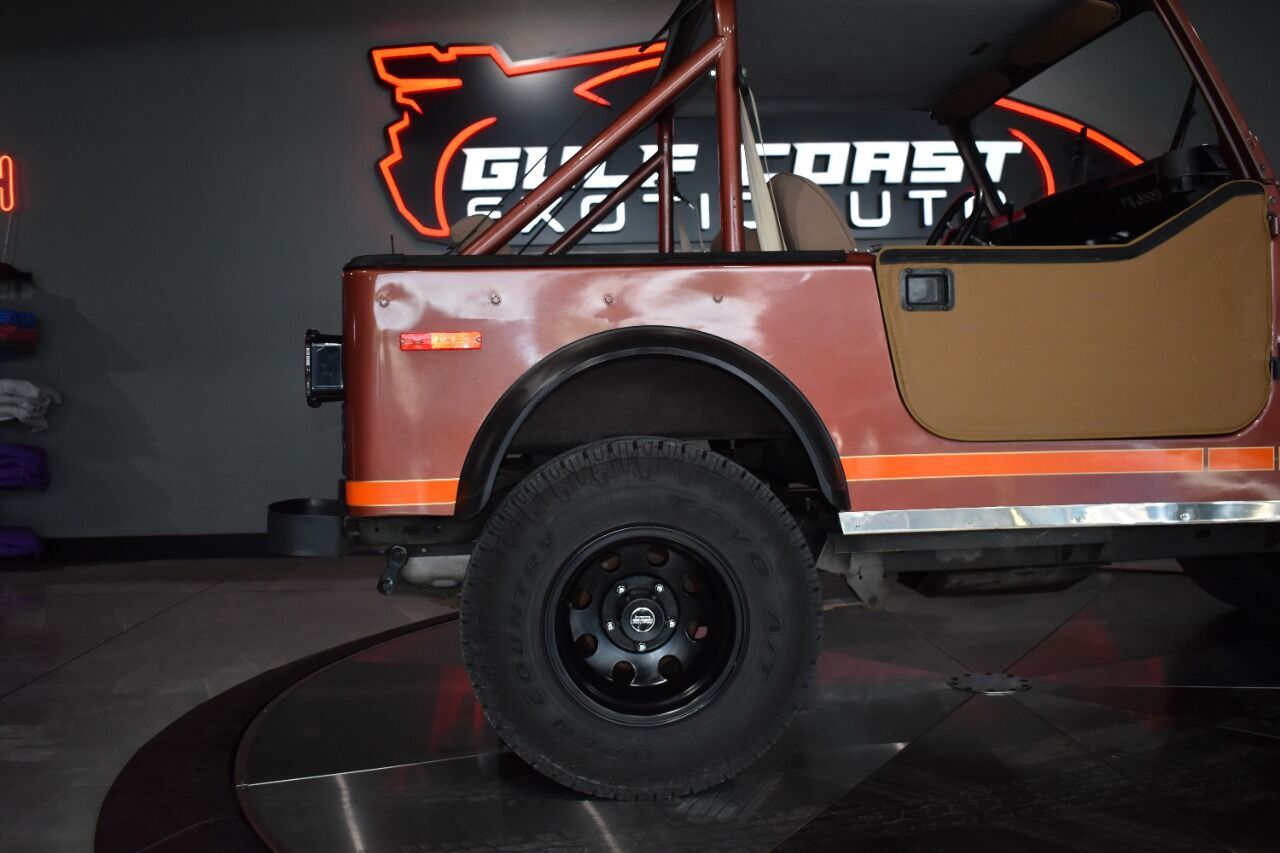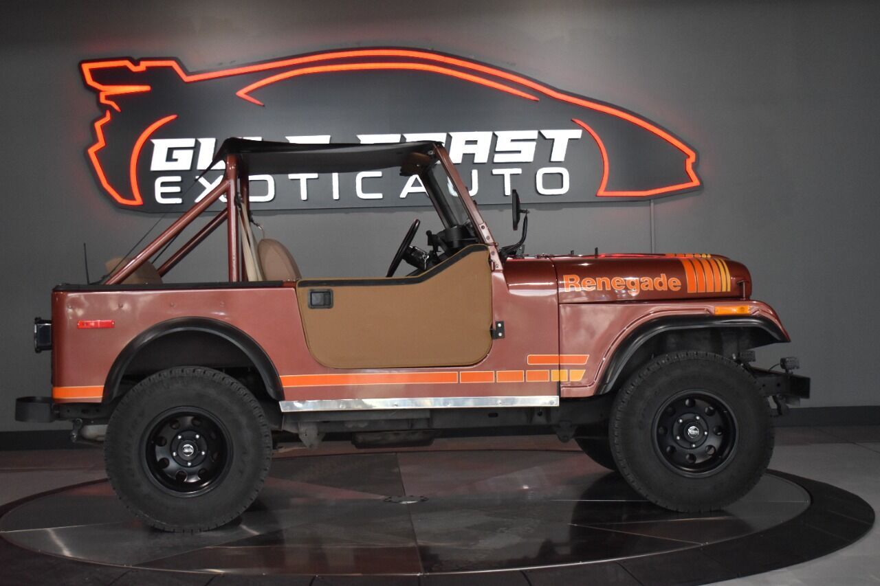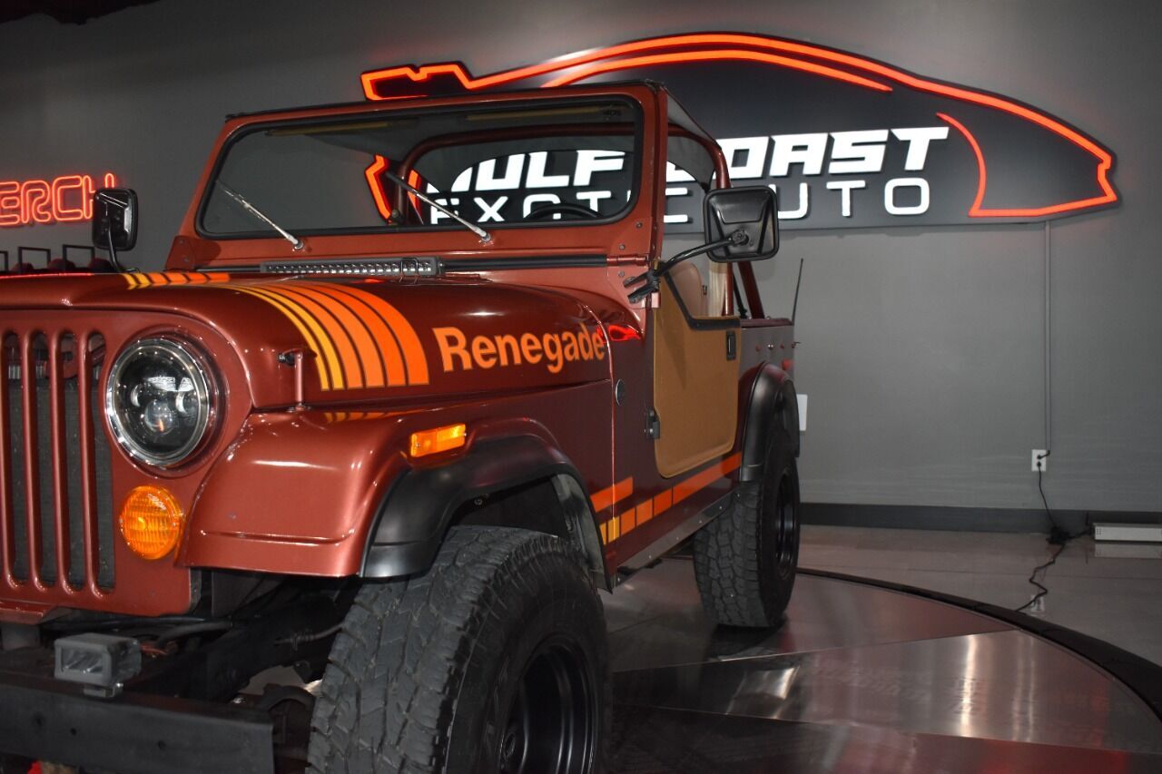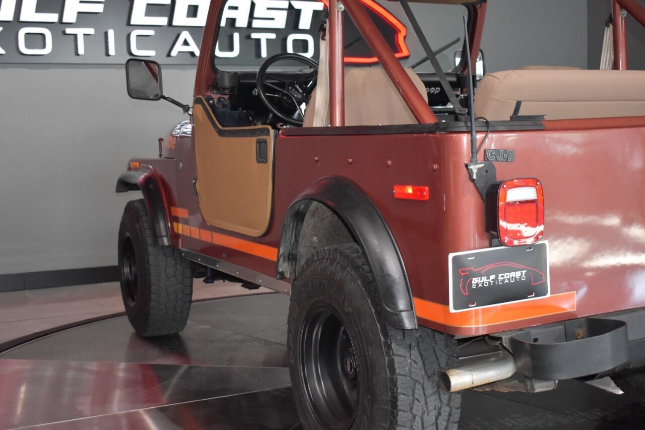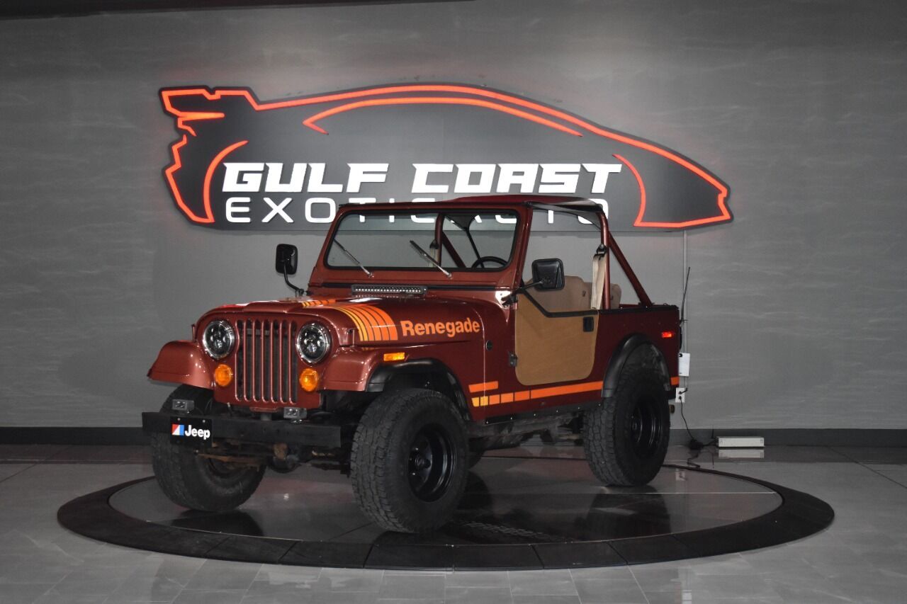 1979 Jeep CJ7 Renegade now available at Gulf Coast Exotic Auto. ** Air Condition **4.2 Inline 6 ** Automatic Transmission ** Fiberglass Tub ** This CJ-7 is powered by a 4.2 liter Inline 6 engine mated to an automatic transmission and utilizing Quadra-Trac 4x4 system. This CJ has a 2 suspension lift making room for the 31 Toyo All Terrains with Black 15 American Racing Wheels. The Root beer exterior paint is paired with black wheels. The headlights have already been upgraded to LED. The clean Tan interior is furnished with A/C, Rugged Ridge vinyl seats, Black leather wrapped steering wheel and color matching roll bar. It only has a Tuffy locking glove box and locking center console. Everything works as it should. Runs and drives GREAT! The odometer show 75,228 on the odometer but true miles are unknown. This turn-key Jeep is ready to cruise on a road trip or off road to the trails in style! The CJ7 Jeeps are only going up in value and there become less available every year. Comes with a full tan soft top, 2 sets of full soft doors, and a bikini top For more information please call Jonathan228-220-0298 or Chris228-220-0298. We Offer Finance Options, Trade-Ins, Extended Warranties, and World Wide Shipping.