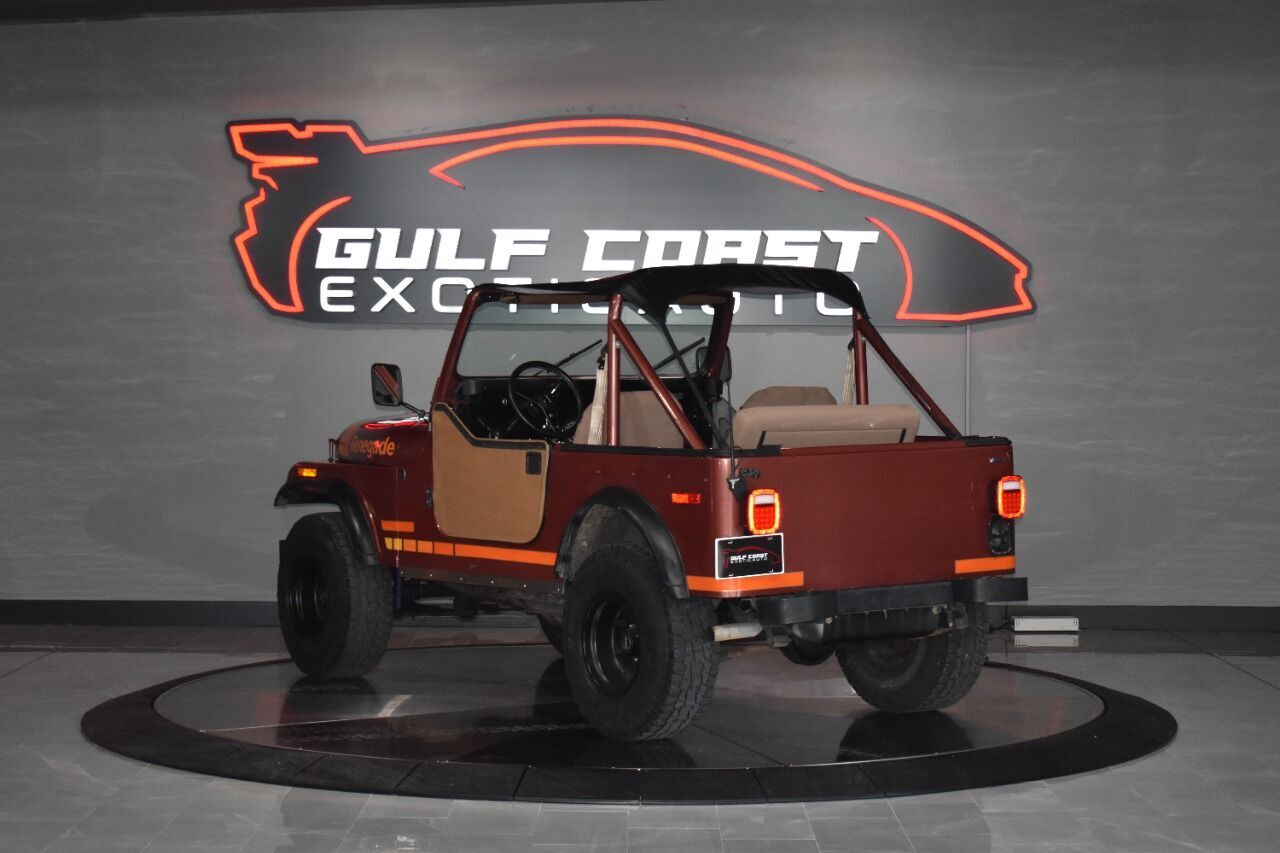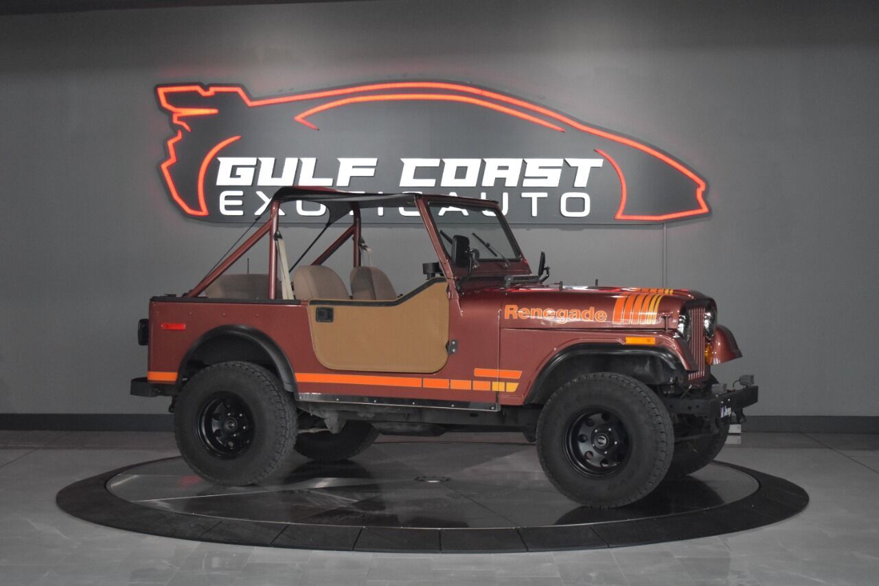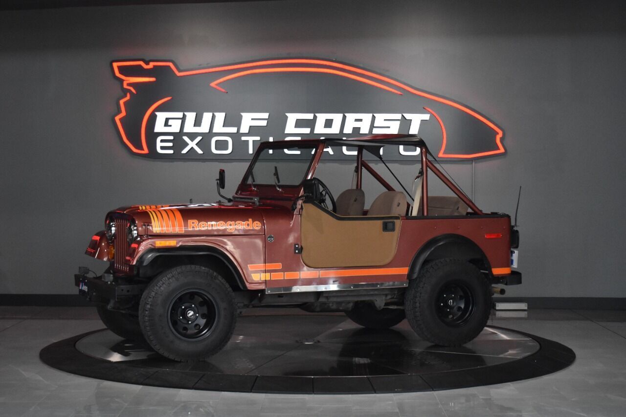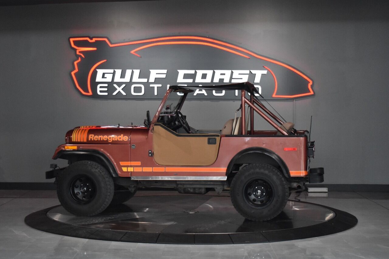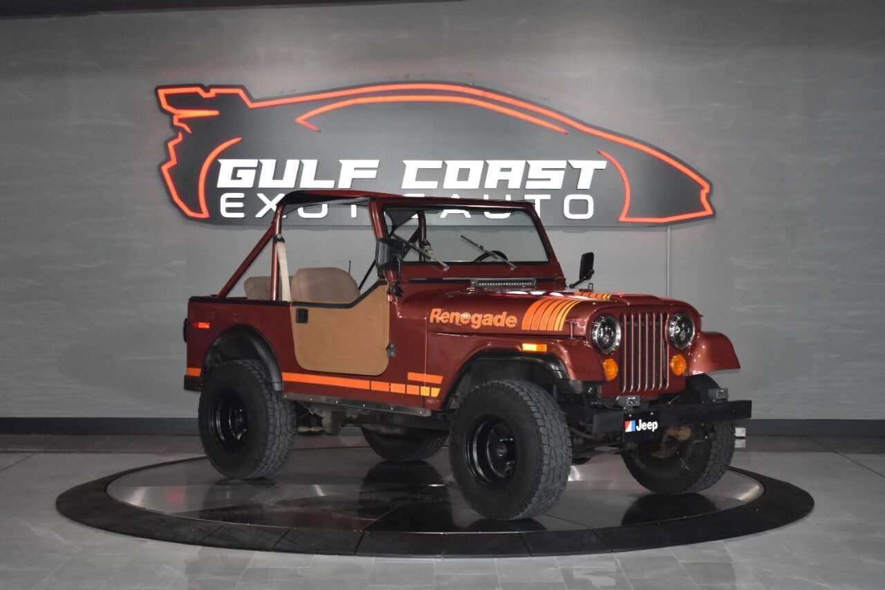 1979 Jeep CJ7 Renegade now available at Gulf Coast Exotic Auto. ** Air Condition **4.2 Inline 6 ** Automatic Transmission ** Fiberglass Tub ** This CJ-7 is powered by a 4.2 liter Inline 6 engine mated to an automatic transmission and utilizing Quadra-Trac 4x4 system. This CJ has a 2 suspension lift making room for the 31 Toyo All Terrains with Black 15 American Racing Wheels. The Root beer exterior paint is paired with black wheels. The headlights have already been upgraded to LED. The clean Tan interior is furnished with A/C, Rugged Ridge vinyl seats, Black leather wrapped steering wheel and color matching roll bar. It only has a Tuffy locking glove box and locking center console. Everything works as it should. Runs and drives GREAT! The odometer show 75,228 on the odometer but true miles are unknown. This turn-key Jeep is ready to cruise on a road trip or off road to the trails in style! The CJ7 Jeeps are only going up in value and there become less available every year. Comes with a full tan soft top, 2 sets of full soft doors, and a bikini top For more information please call Jonathan228-220-0298 or Chris228-220-0298. We Offer Finance Options, Trade-Ins, Extended Warranties, and World Wide Shipping.