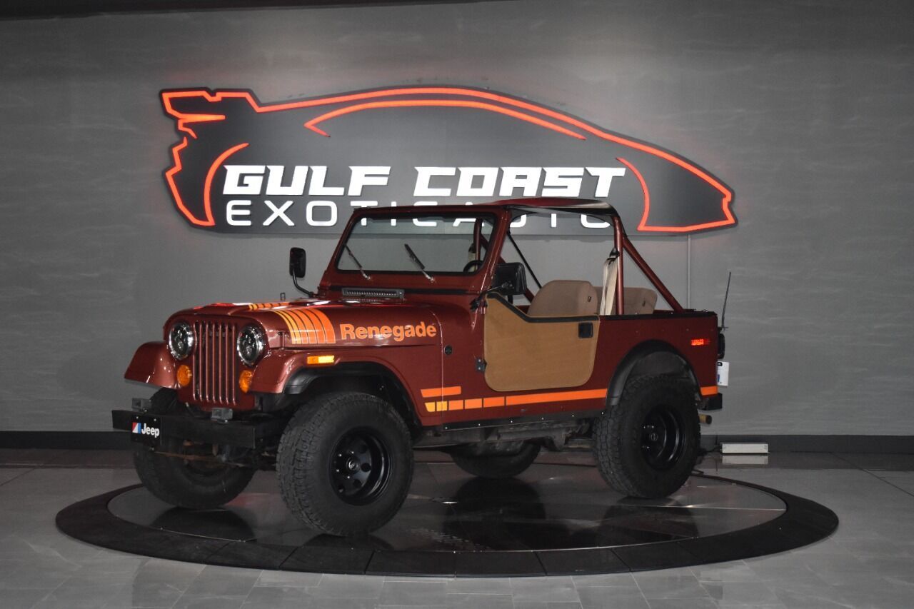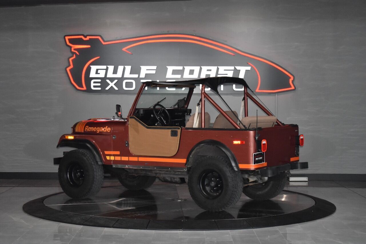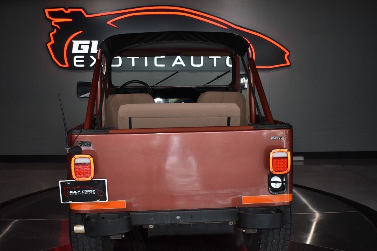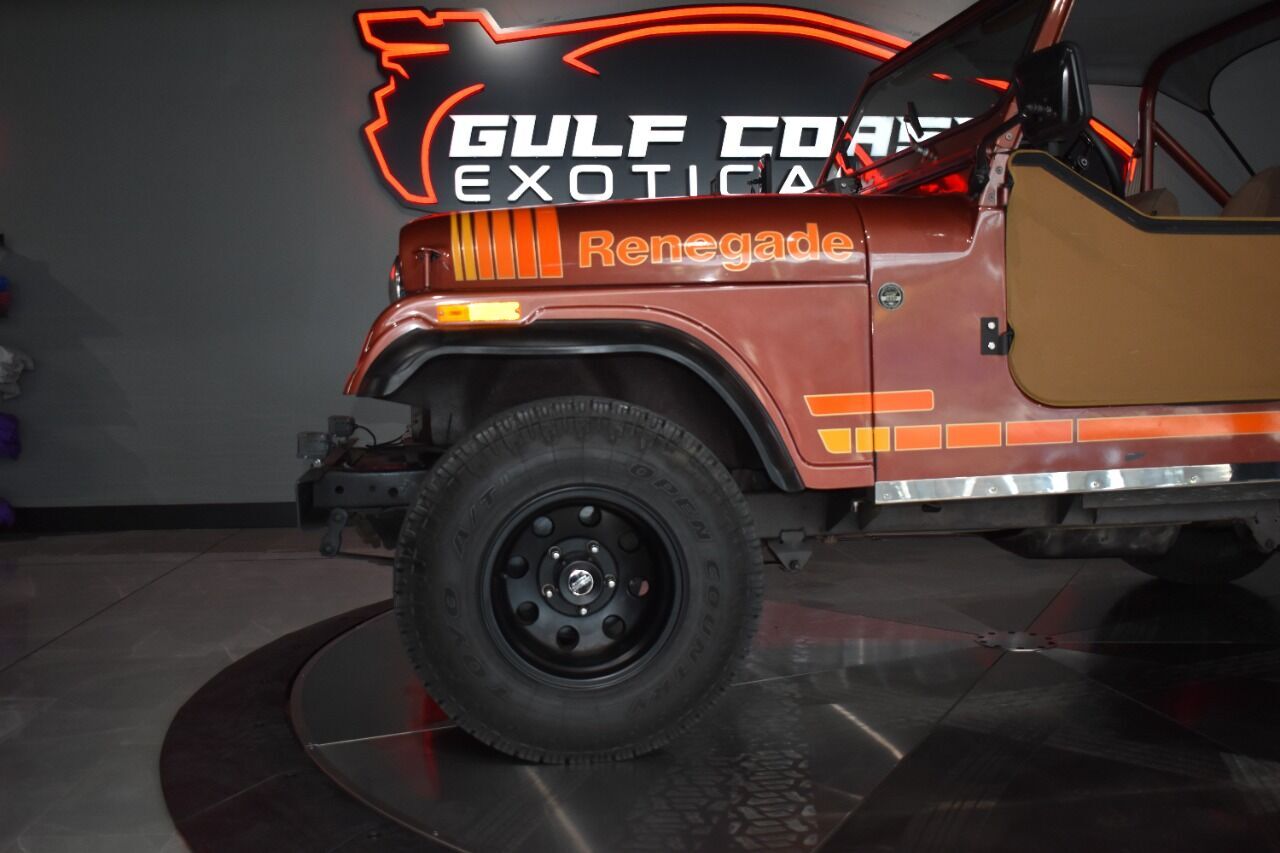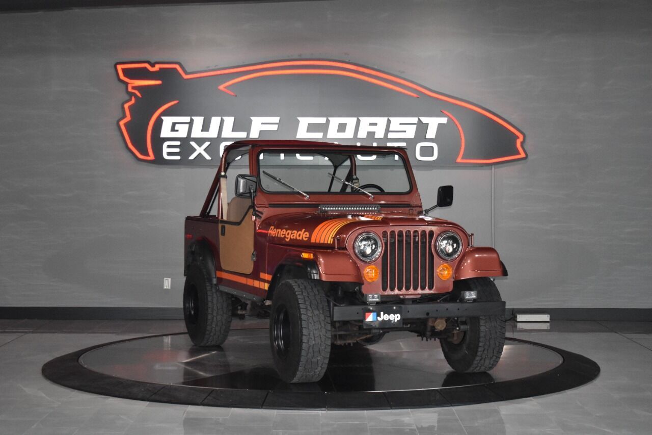 1979 Jeep CJ7 Renegade now available at Gulf Coast Exotic Auto. ** Air Condition **4.2 Inline 6 ** Automatic Transmission ** Fiberglass Tub ** This CJ-7 is powered by a 4.2 liter Inline 6 engine mated to an automatic transmission and utilizing Quadra-Trac 4x4 system. This CJ has a 2 suspension lift making room for the 31 Toyo All Terrains with Black 15 American Racing Wheels. The Root beer exterior paint is paired with black wheels. The headlights have already been upgraded to LED. The clean Tan interior is furnished with A/C, Rugged Ridge vinyl seats, Black leather wrapped steering wheel and color matching roll bar. It only has a Tuffy locking glove box and locking center console. Everything works as it should. Runs and drives GREAT! The odometer show 75,228 on the odometer but true miles are unknown. This turn-key Jeep is ready to cruise on a road trip or off road to the trails in style! The CJ7 Jeeps are only going up in value and there become less available every year. Comes with a full tan soft top, 2 sets of full soft doors, and a bikini top For more information please call Jonathan228-220-0298 or Chris228-220-0298. We Offer Finance Options, Trade-Ins, Extended Warranties, and World Wide Shipping.