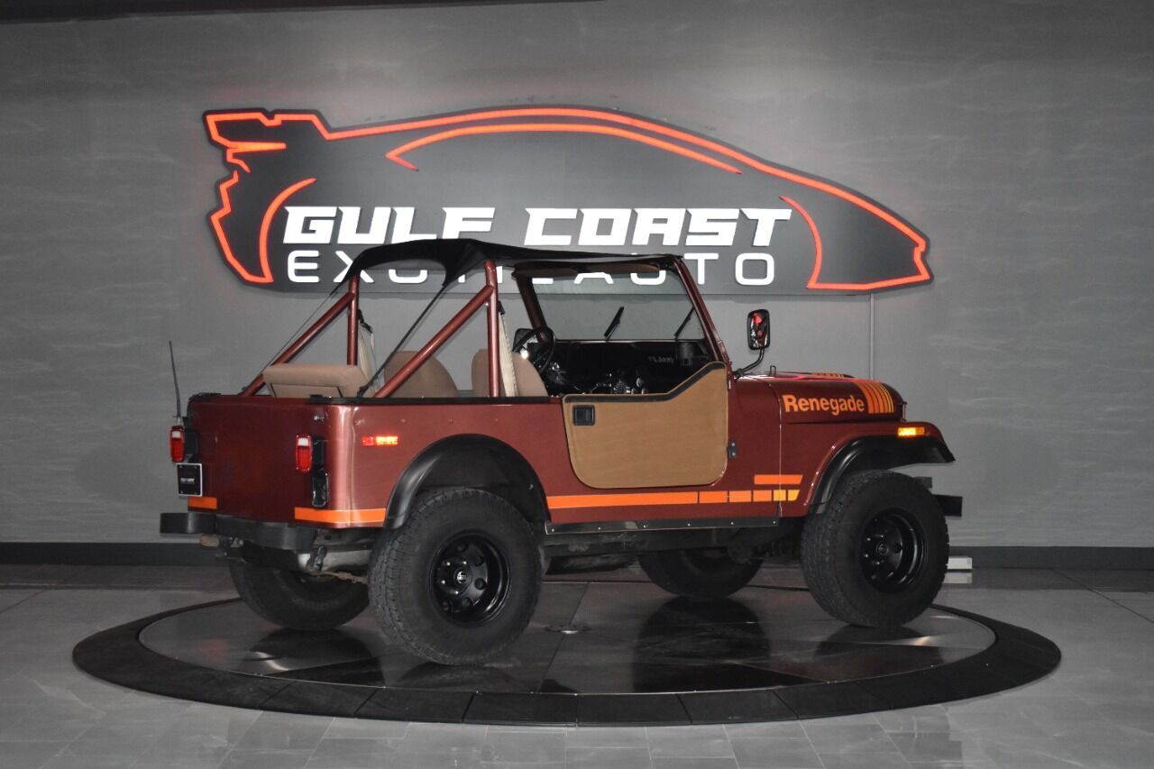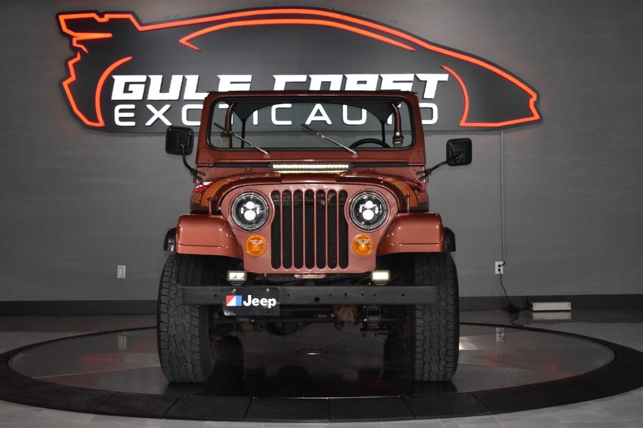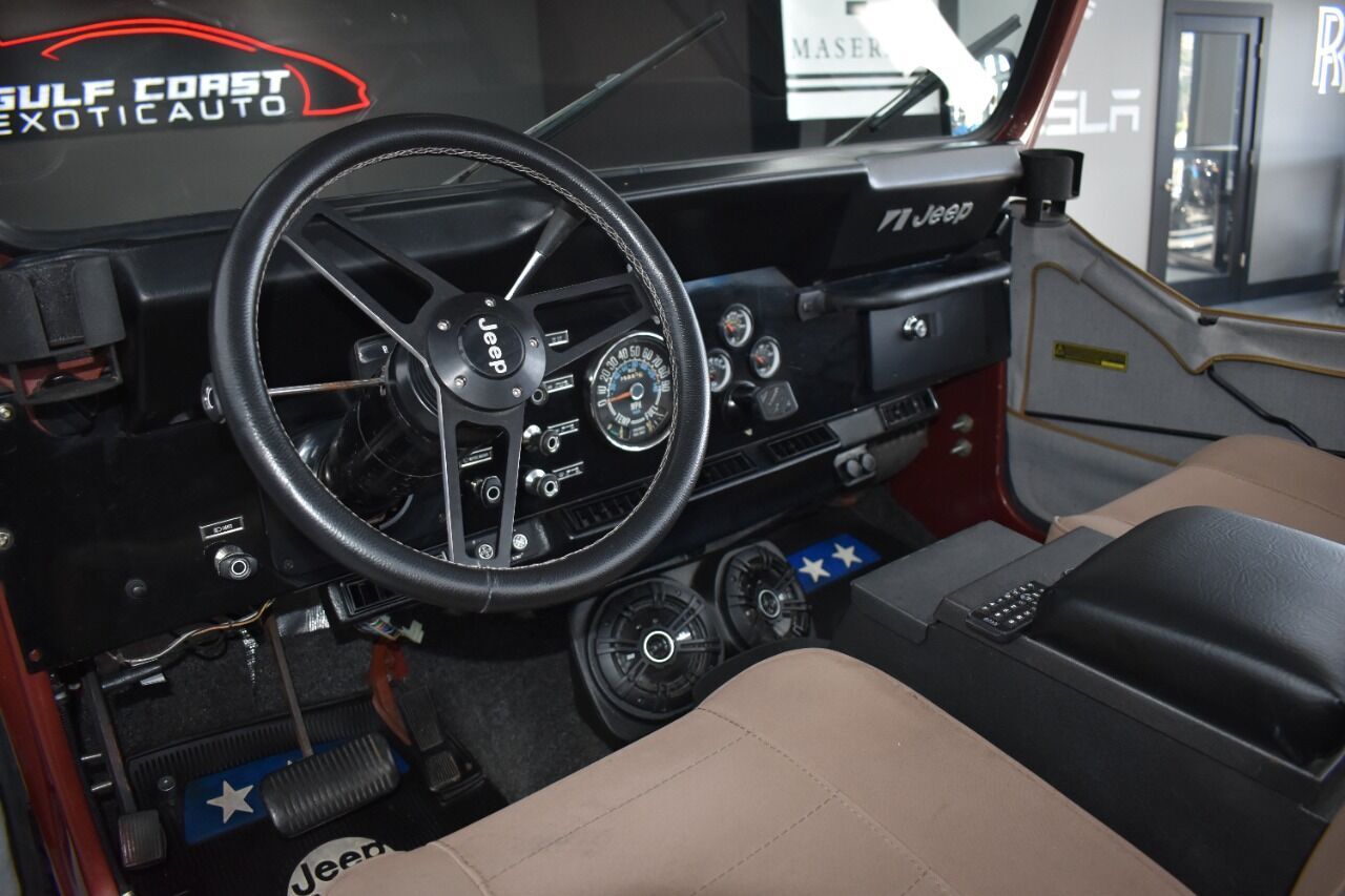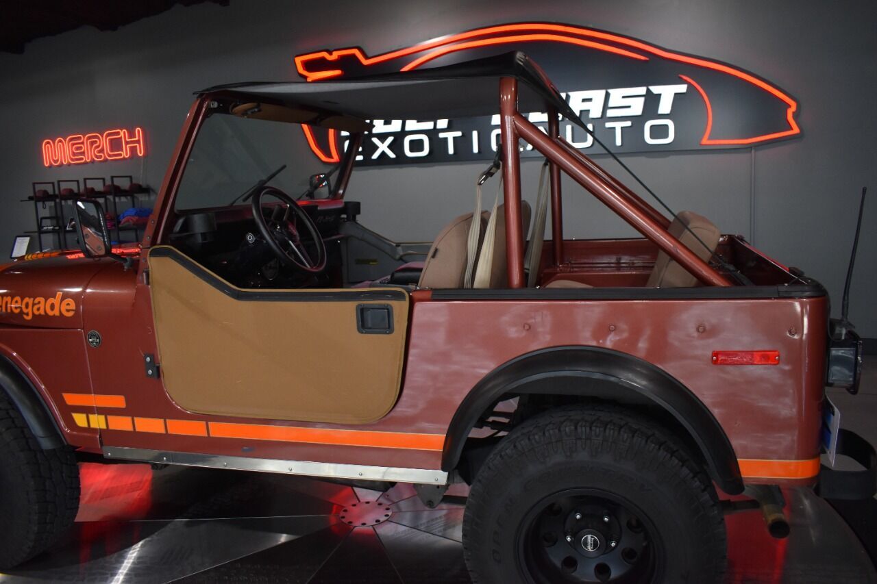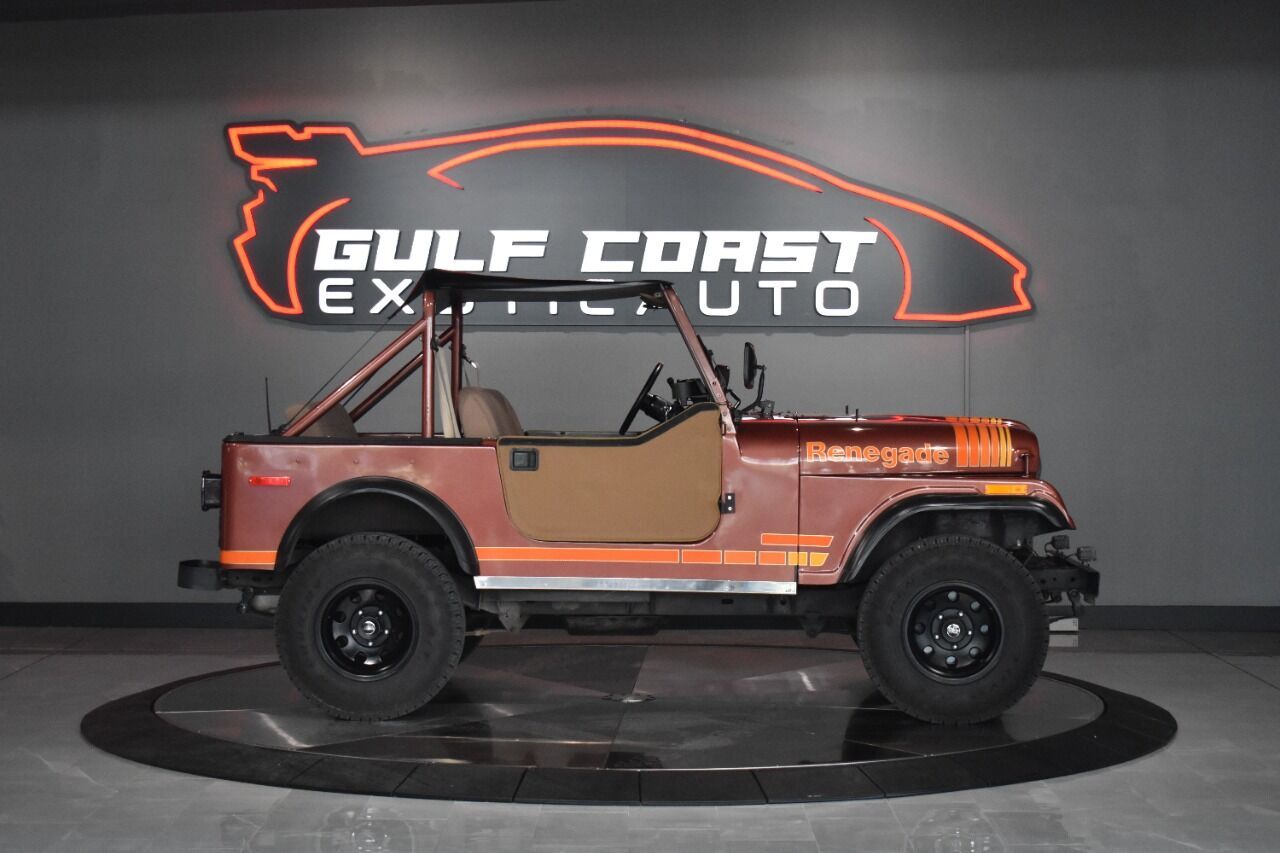 1979 Jeep CJ7 Renegade now available at Gulf Coast Exotic Auto. ** Air Condition **4.2 Inline 6 ** Automatic Transmission ** Fiberglass Tub ** This CJ-7 is powered by a 4.2 liter Inline 6 engine mated to an automatic transmission and utilizing Quadra-Trac 4x4 system. This CJ has a 2 suspension lift making room for the 31 Toyo All Terrains with Black 15 American Racing Wheels. The Root beer exterior paint is paired with black wheels. The headlights have already been upgraded to LED. The clean Tan interior is furnished with A/C, Rugged Ridge vinyl seats, Black leather wrapped steering wheel and color matching roll bar. It only has a Tuffy locking glove box and locking center console. Everything works as it should. Runs and drives GREAT! The odometer show 75,228 on the odometer but true miles are unknown. This turn-key Jeep is ready to cruise on a road trip or off road to the trails in style! The CJ7 Jeeps are only going up in value and there become less available every year. Comes with a full tan soft top, 2 sets of full soft doors, and a bikini top For more information please call Jonathan228-220-0298 or Chris228-220-0298. We Offer Finance Options, Trade-Ins, Extended Warranties, and World Wide Shipping.