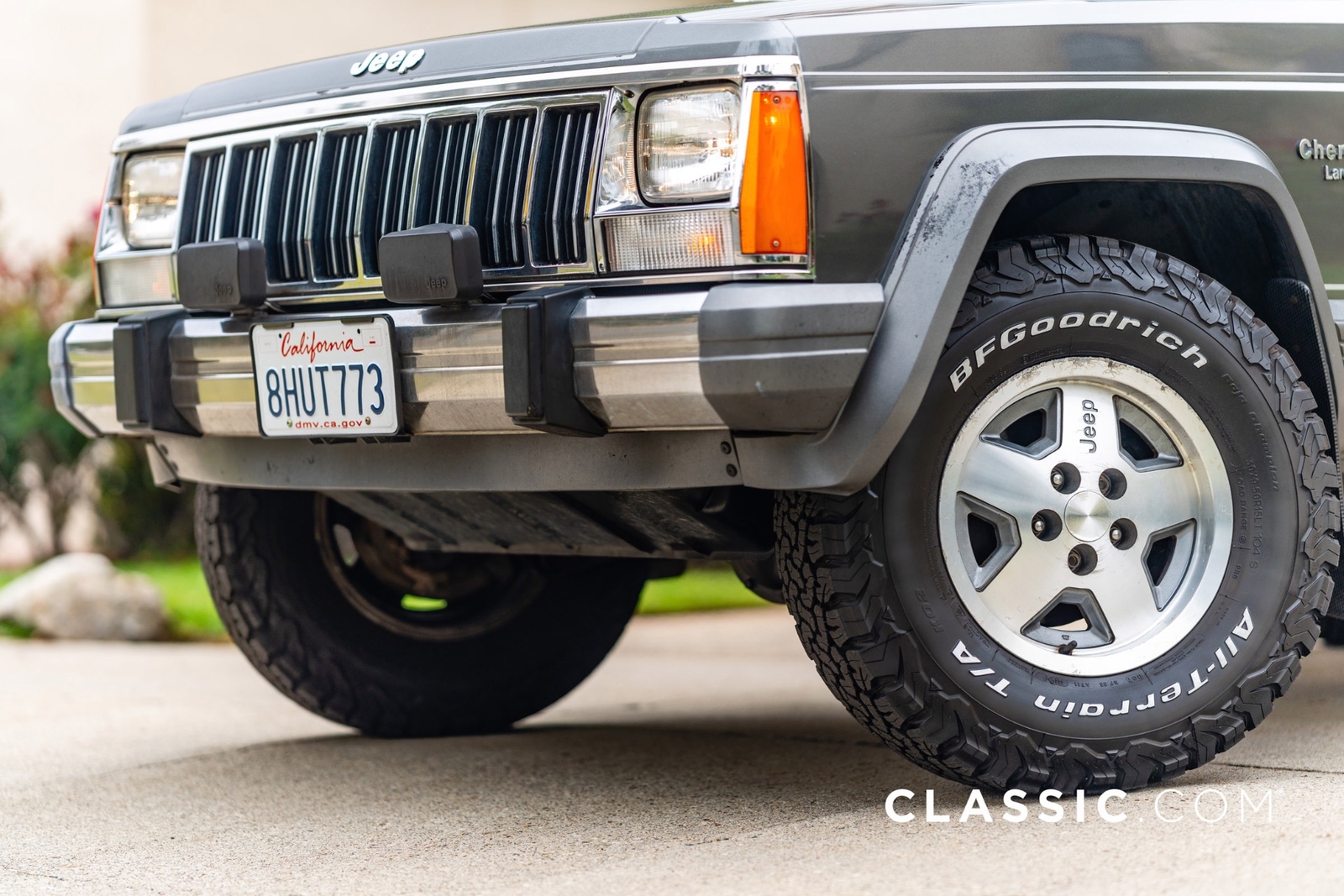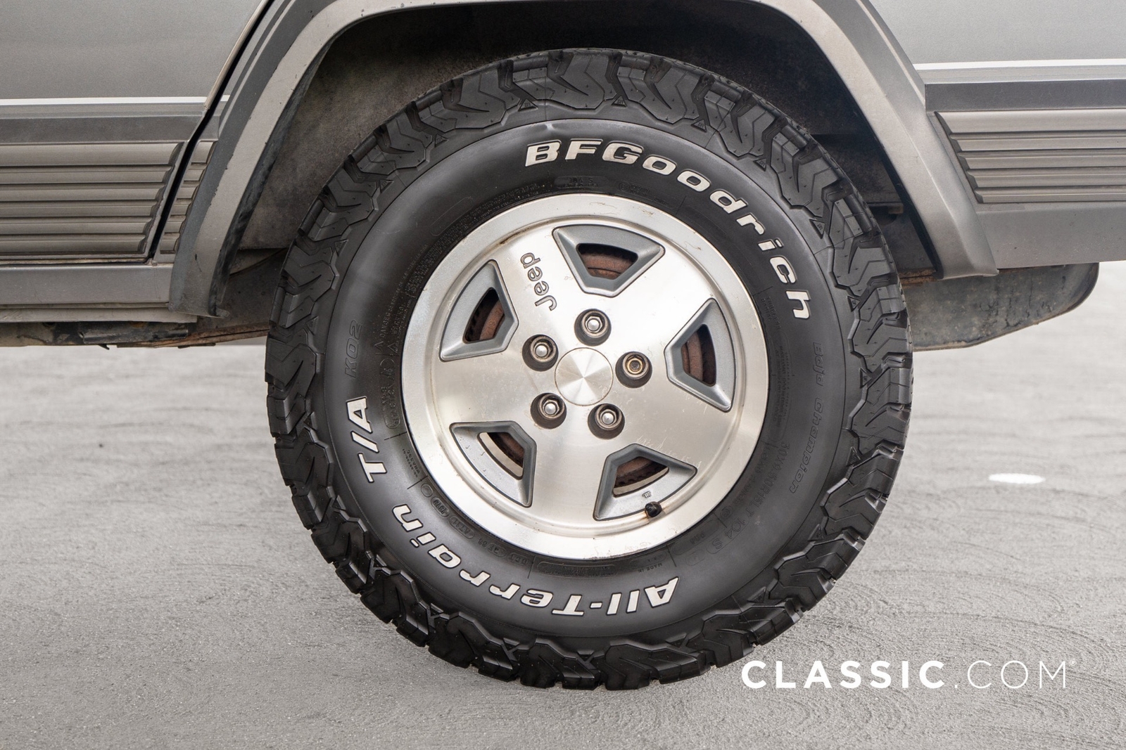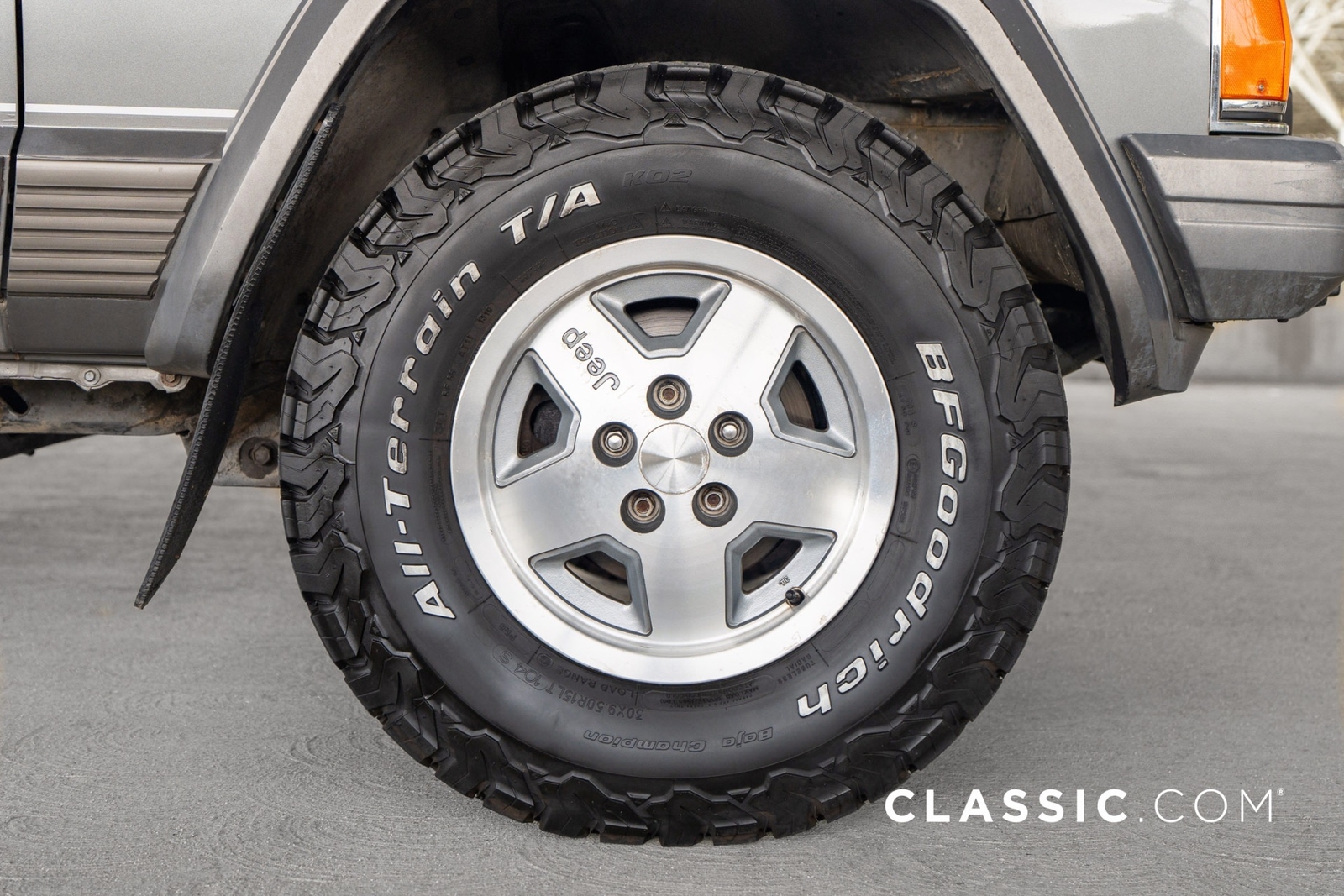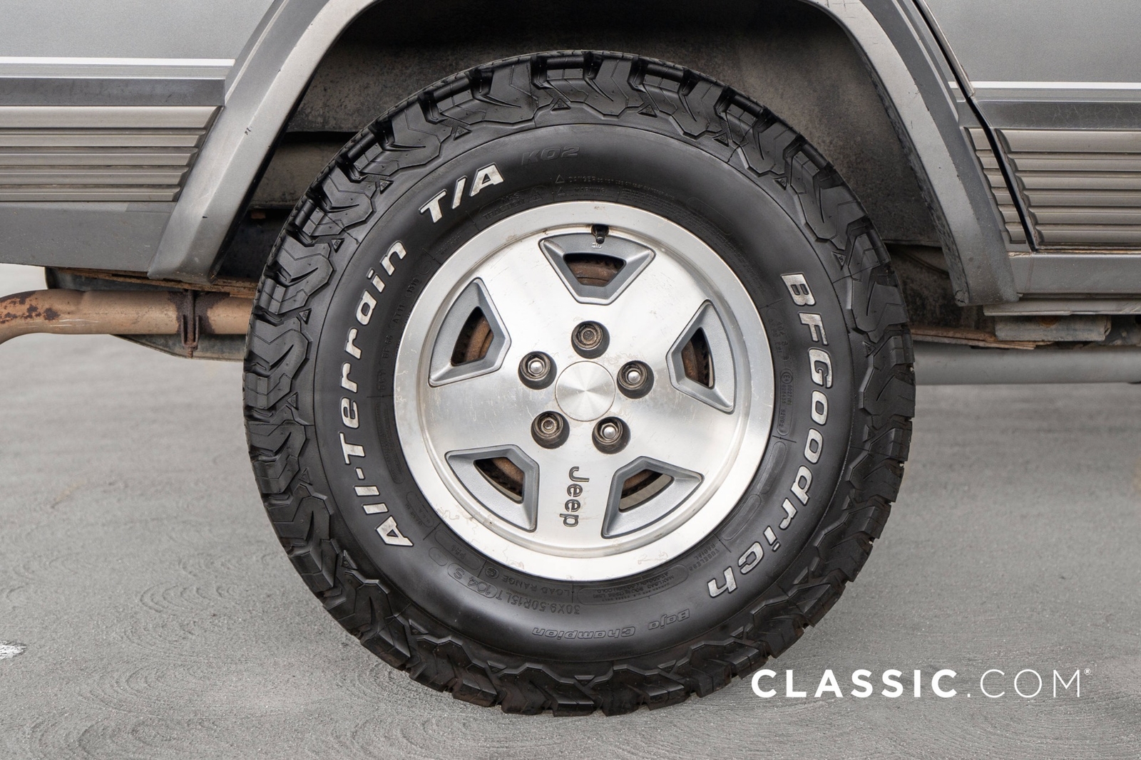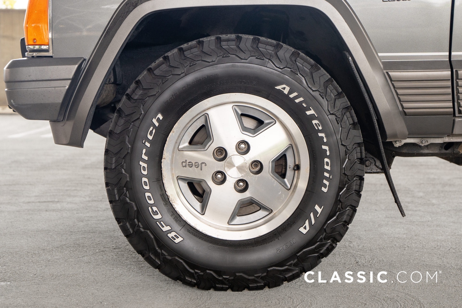 The Laredo package includes features like gray plaid cloth seats and leather-wrapped steering wheel, power windows and locks, power front seats, air conditioning, and fog lights. This example is unmodified, however, the new white-letter BFGoodrich All Terrain TA tires against the gray backdrop are a reminder of this 4x4’s off-road capability.