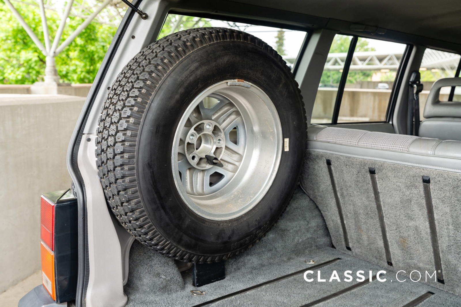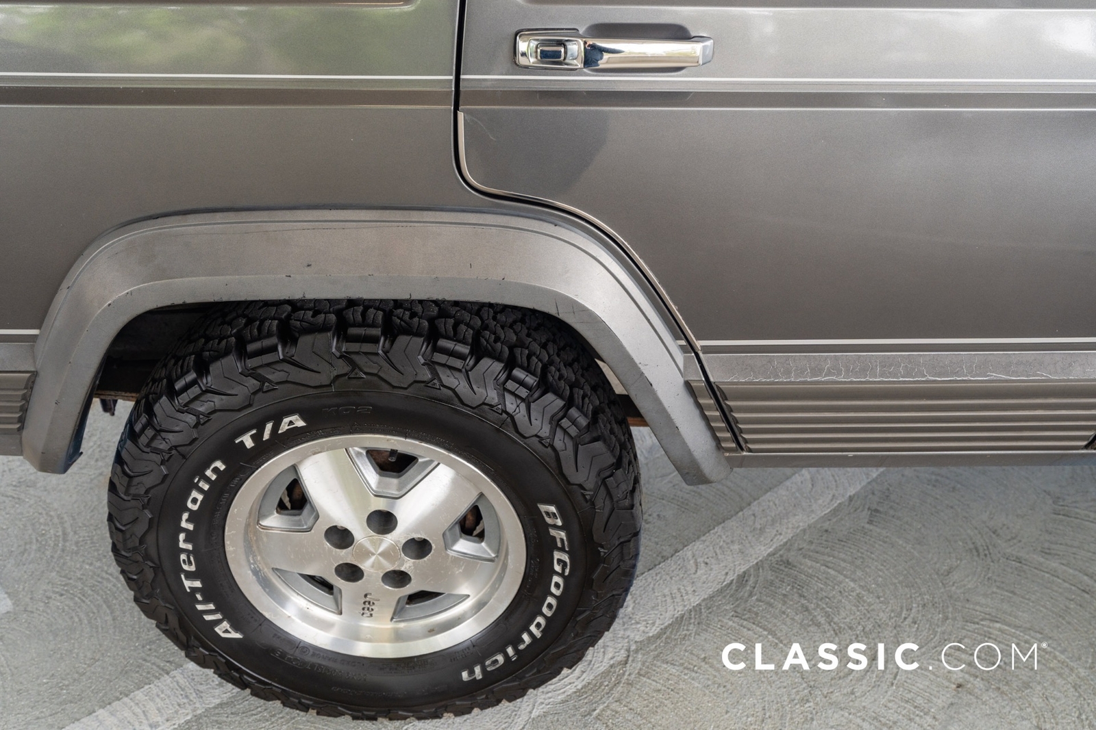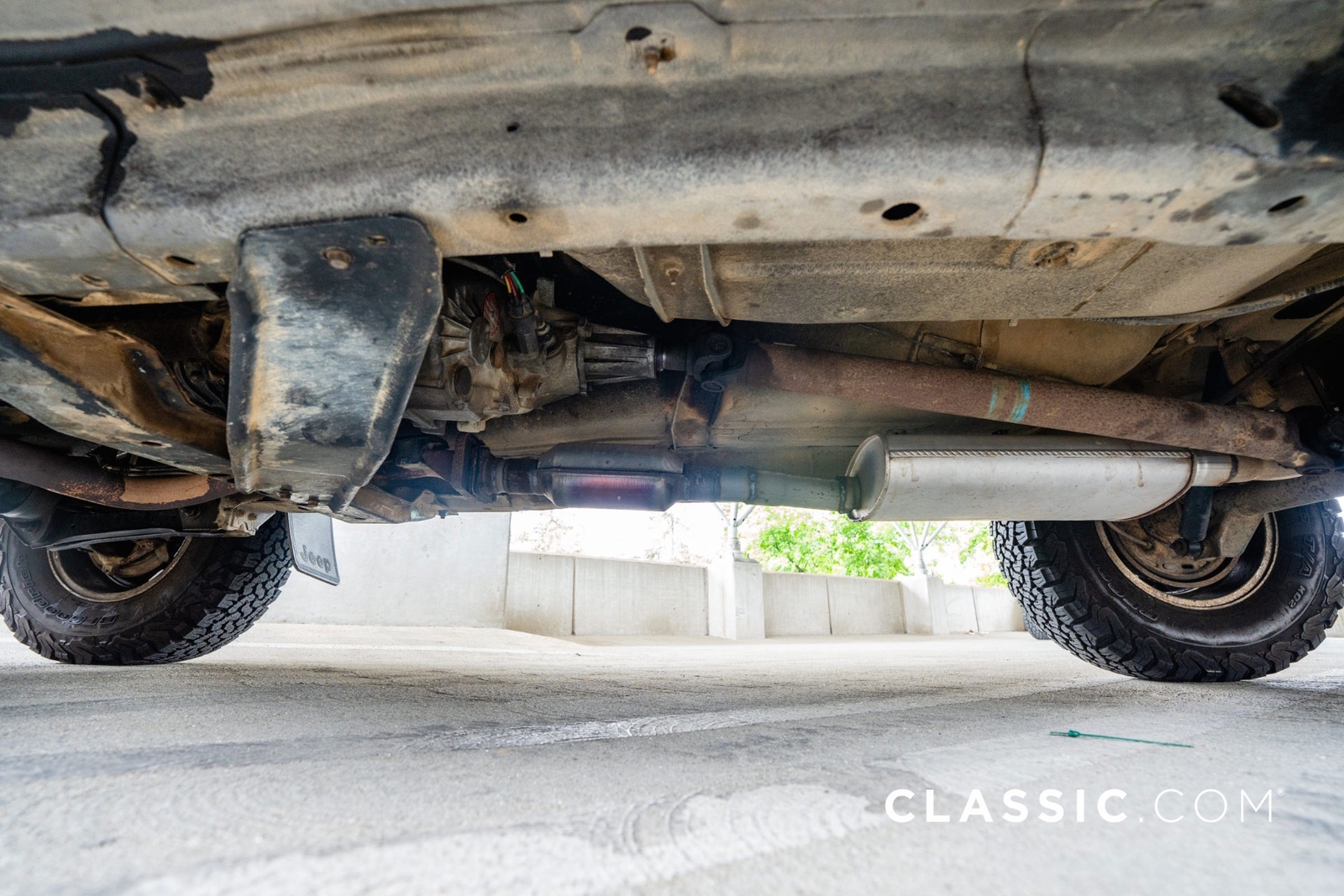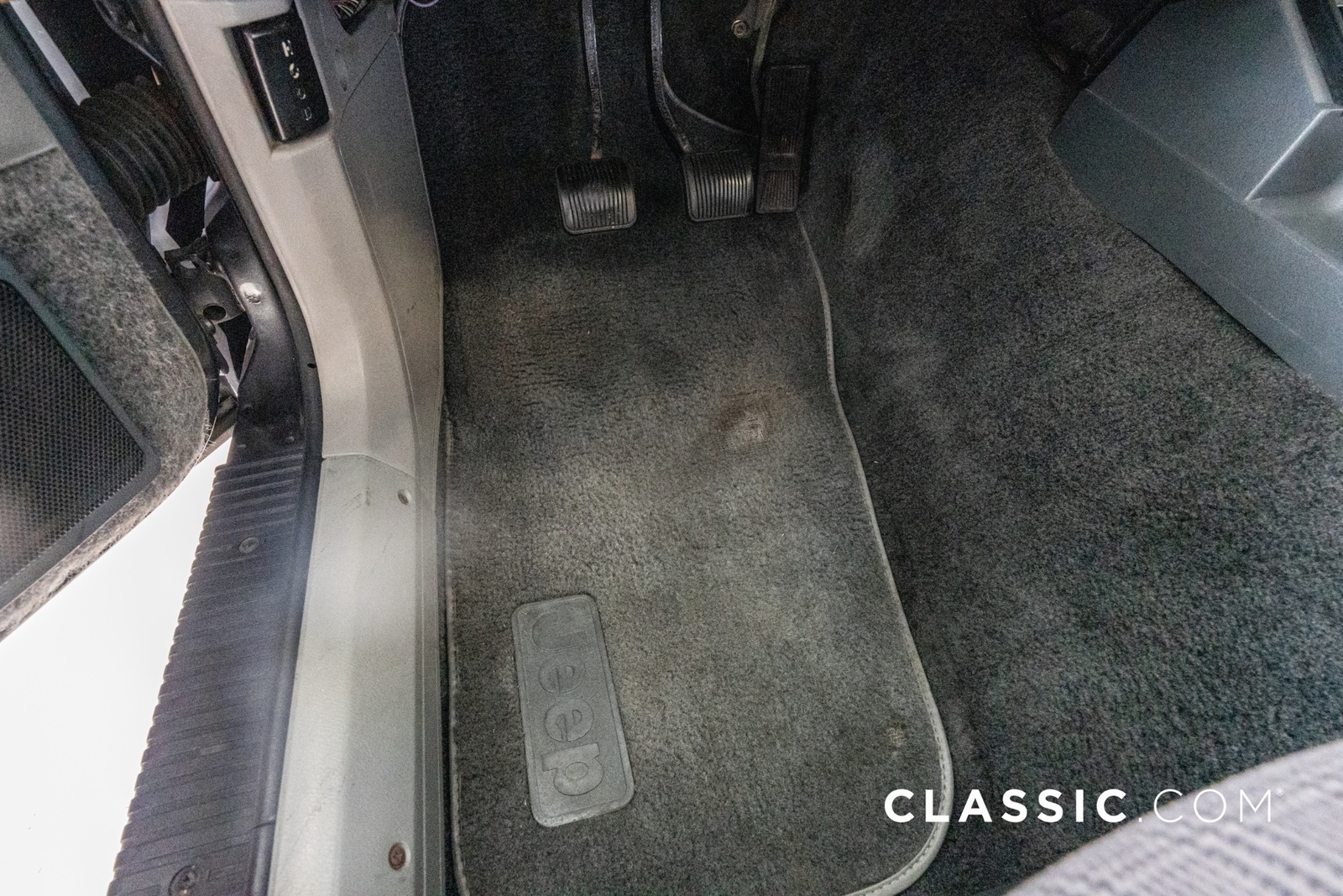 The Laredo package includes features like gray plaid cloth seats and leather-wrapped steering wheel, power windows and locks, power front seats, air conditioning, and fog lights. This example is unmodified, however, the new white-letter BFGoodrich All Terrain TA tires against the gray backdrop are a reminder of this 4x4’s off-road capability.
