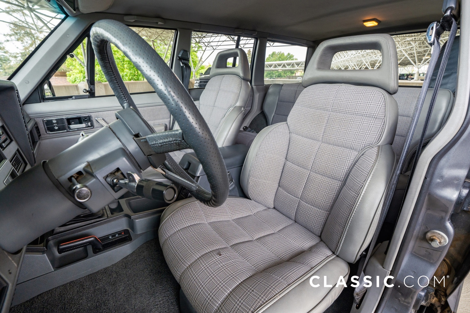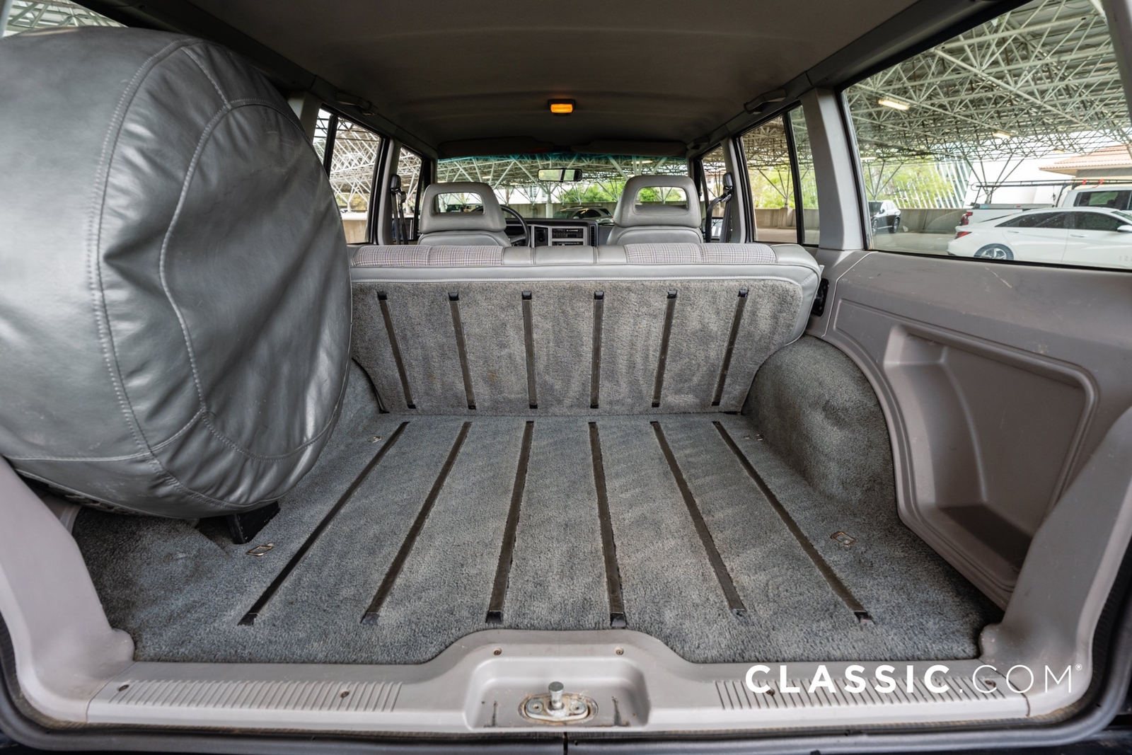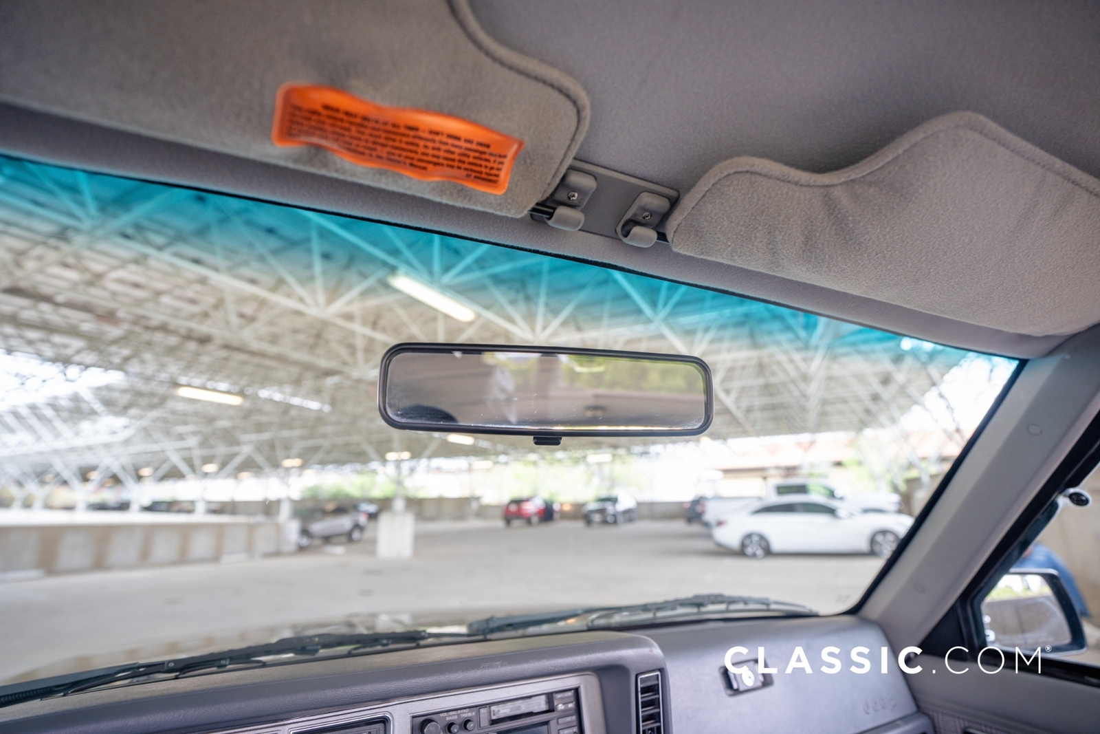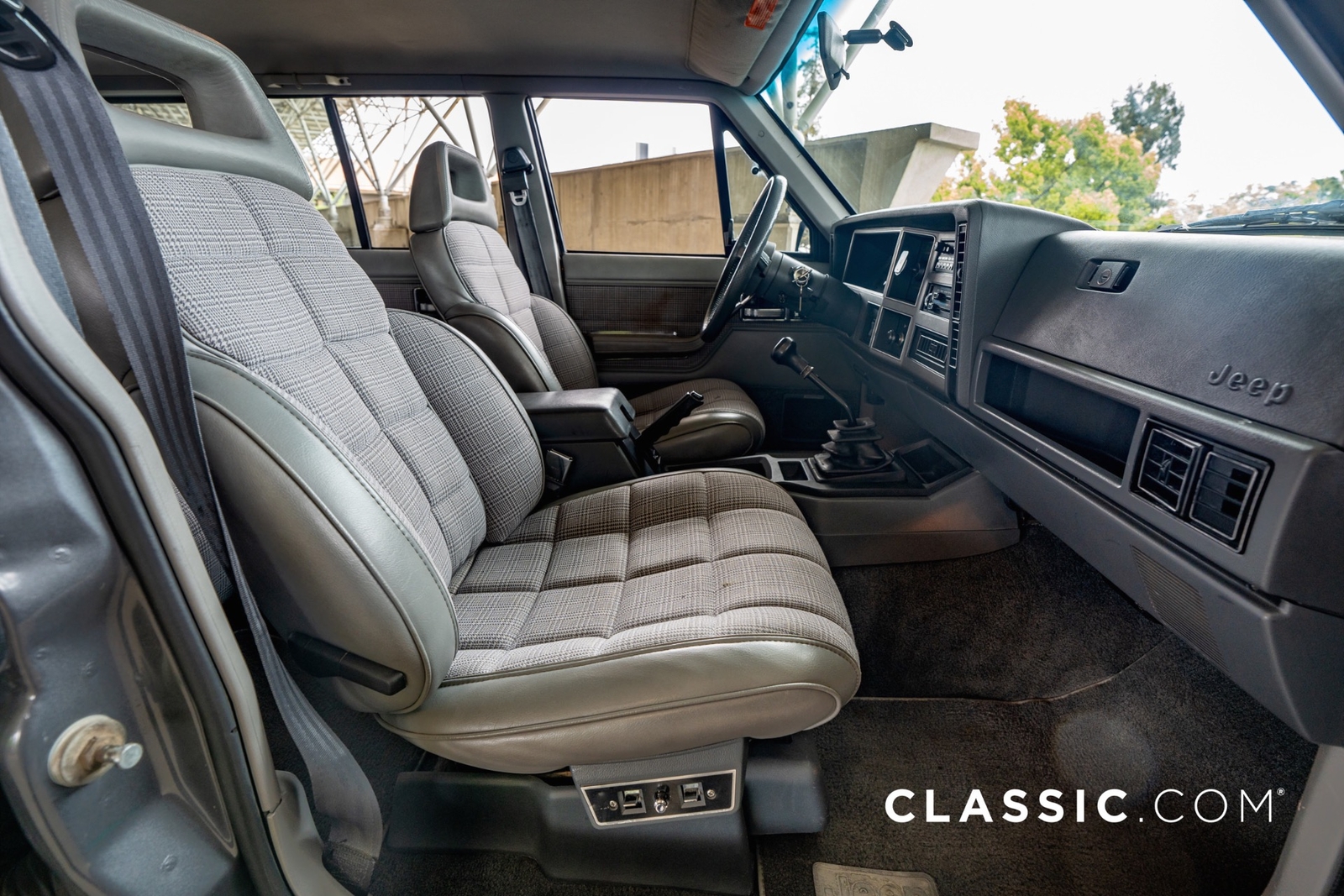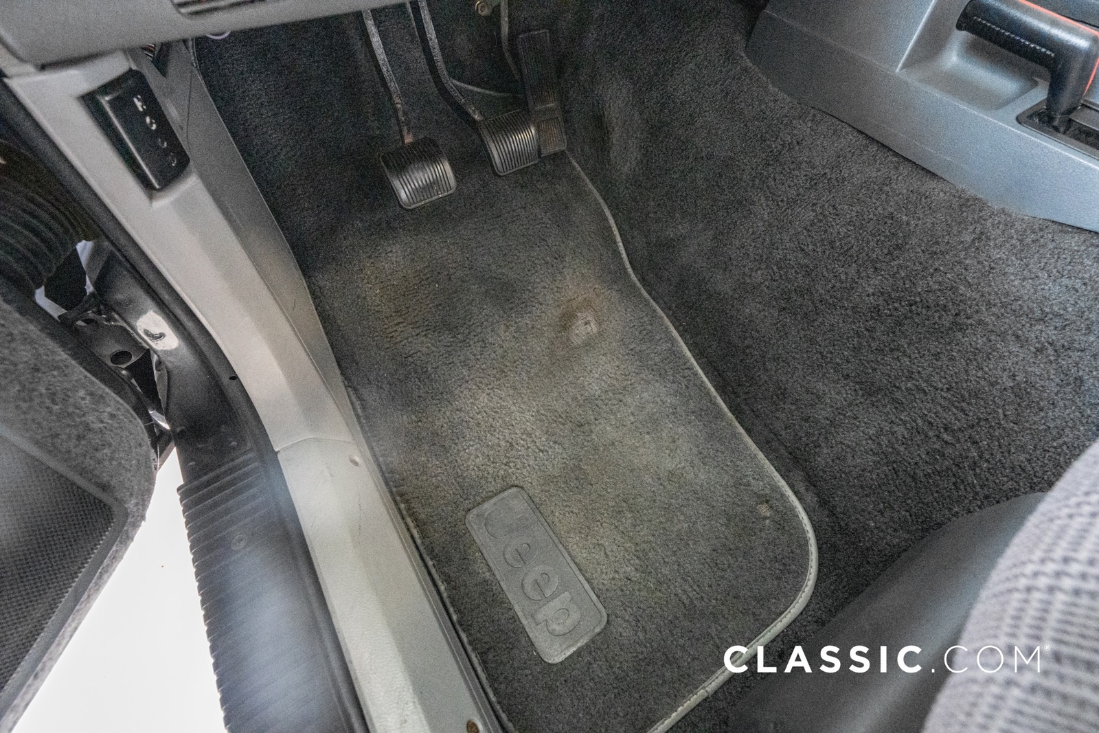The Laredo package includes features like gray plaid cloth seats and leather-wrapped steering wheel, power windows and locks, power front seats, air conditioning, and fog lights. This example is unmodified, however, the new white-letter BFGoodrich All Terrain TA tires against the gray backdrop are a reminder of this 4x4’s off-road capability.