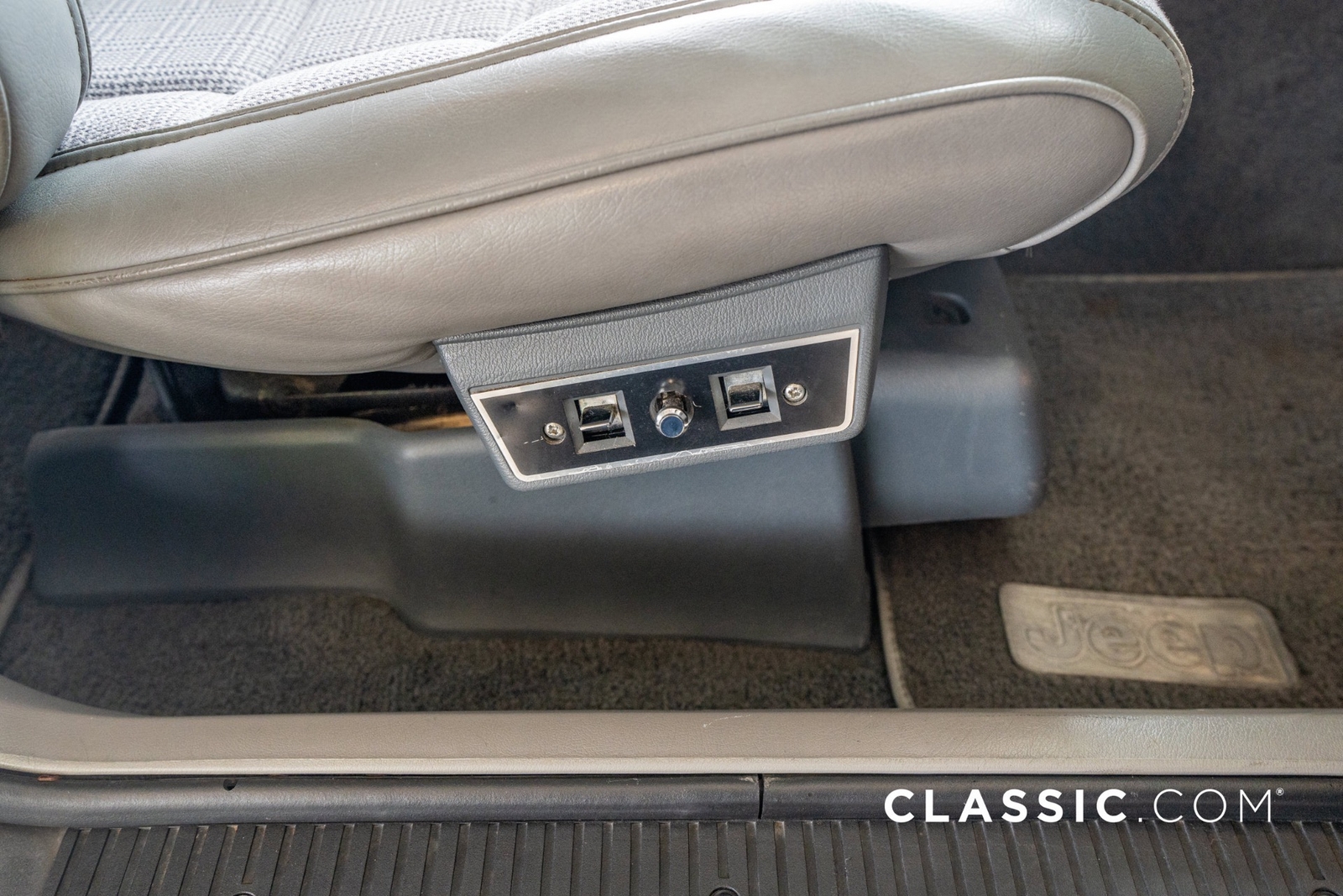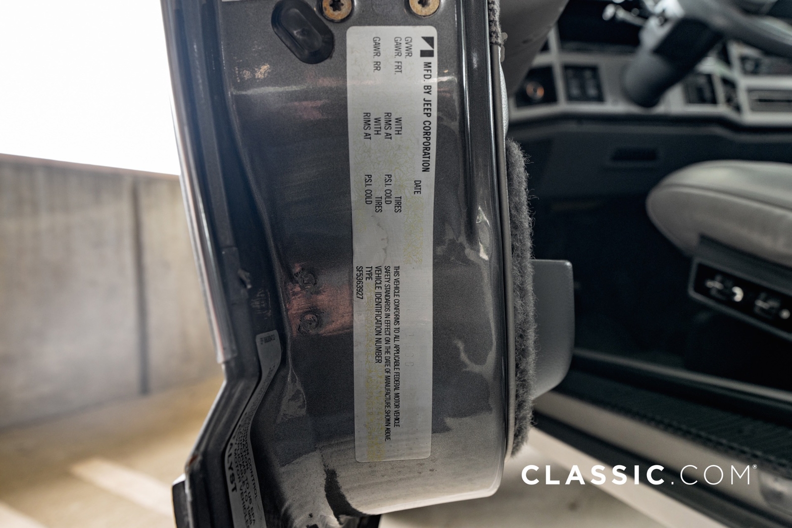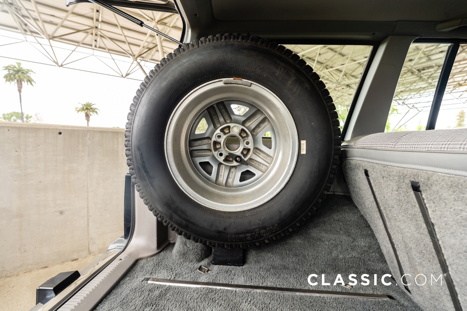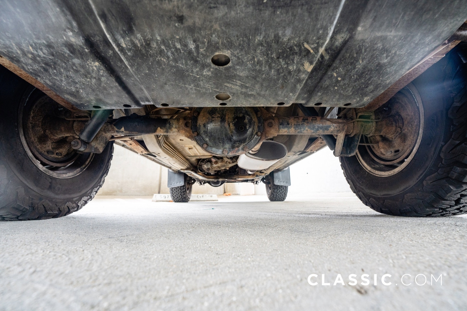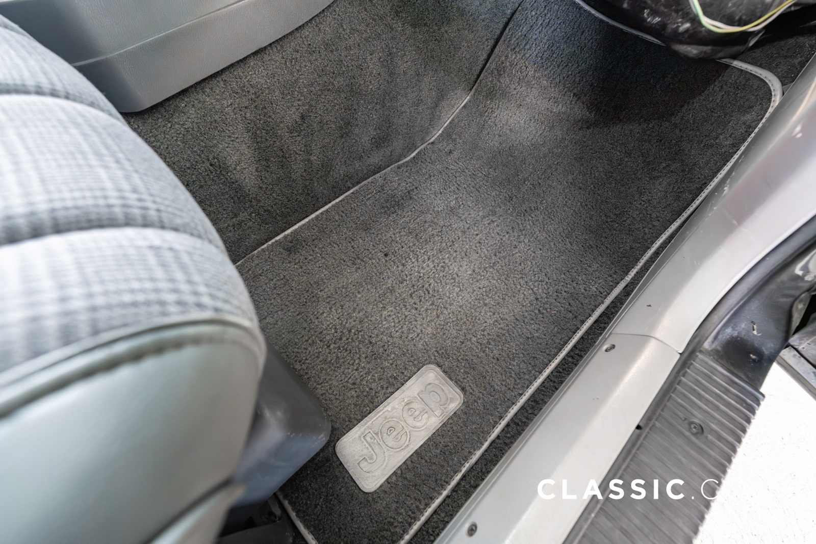 The Laredo package includes features like gray plaid cloth seats and leather-wrapped steering wheel, power windows and locks, power front seats, air conditioning, and fog lights. This example is unmodified, however, the new white-letter BFGoodrich All Terrain TA tires against the gray backdrop are a reminder of this 4x4’s off-road capability.