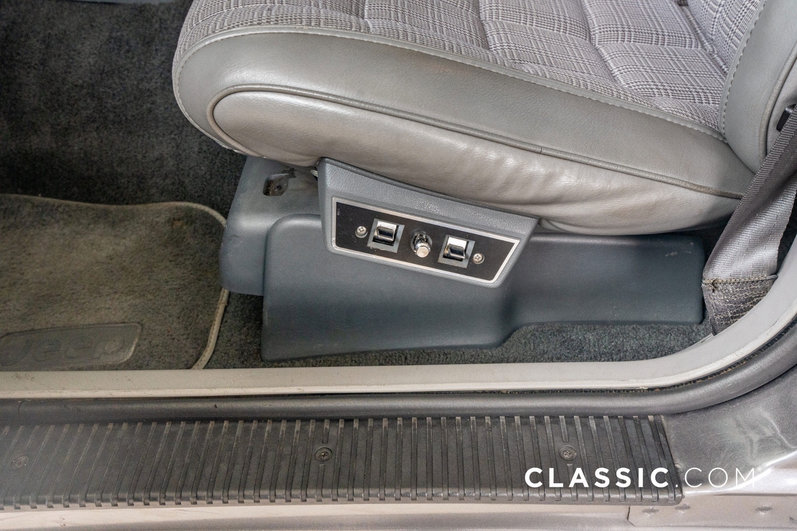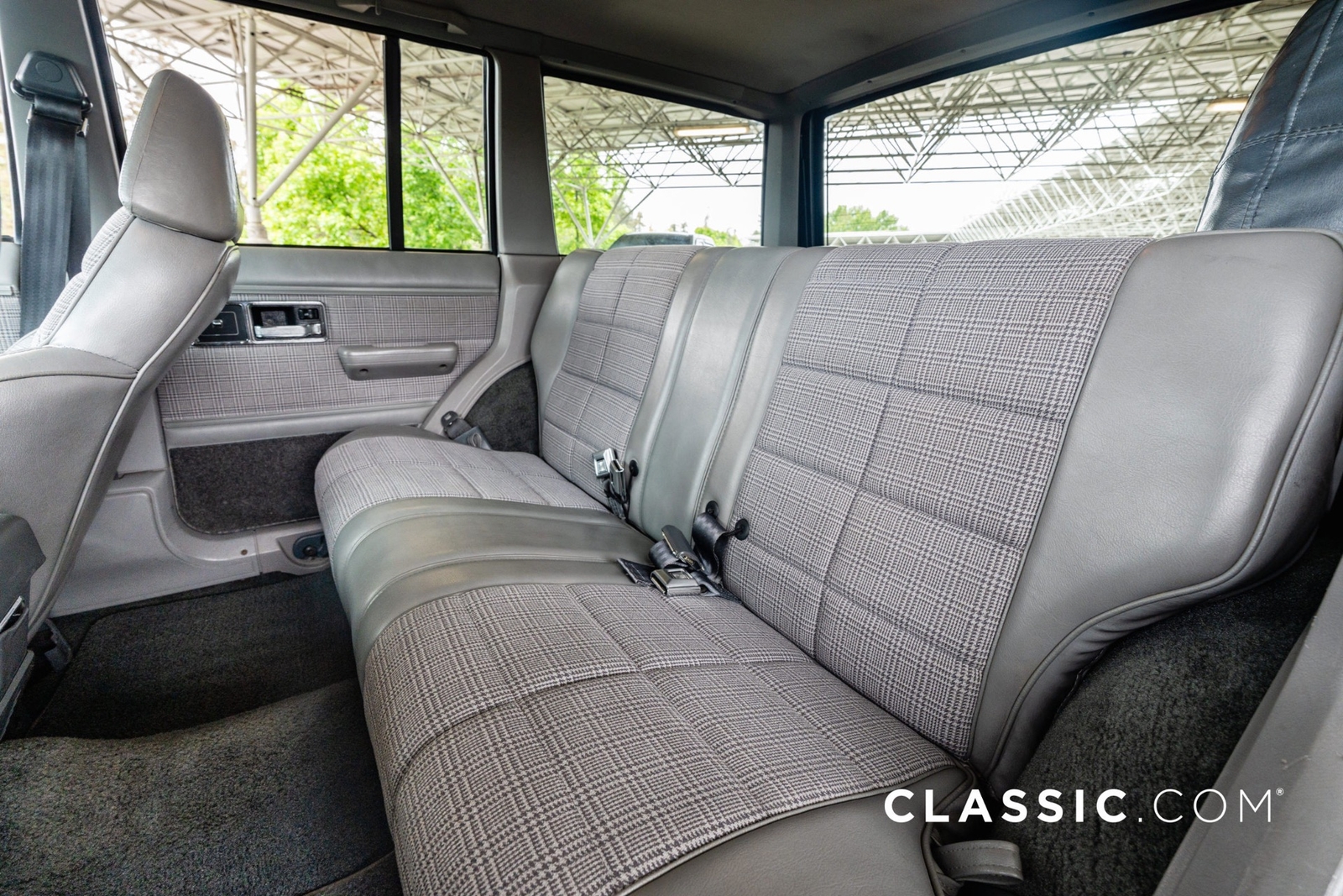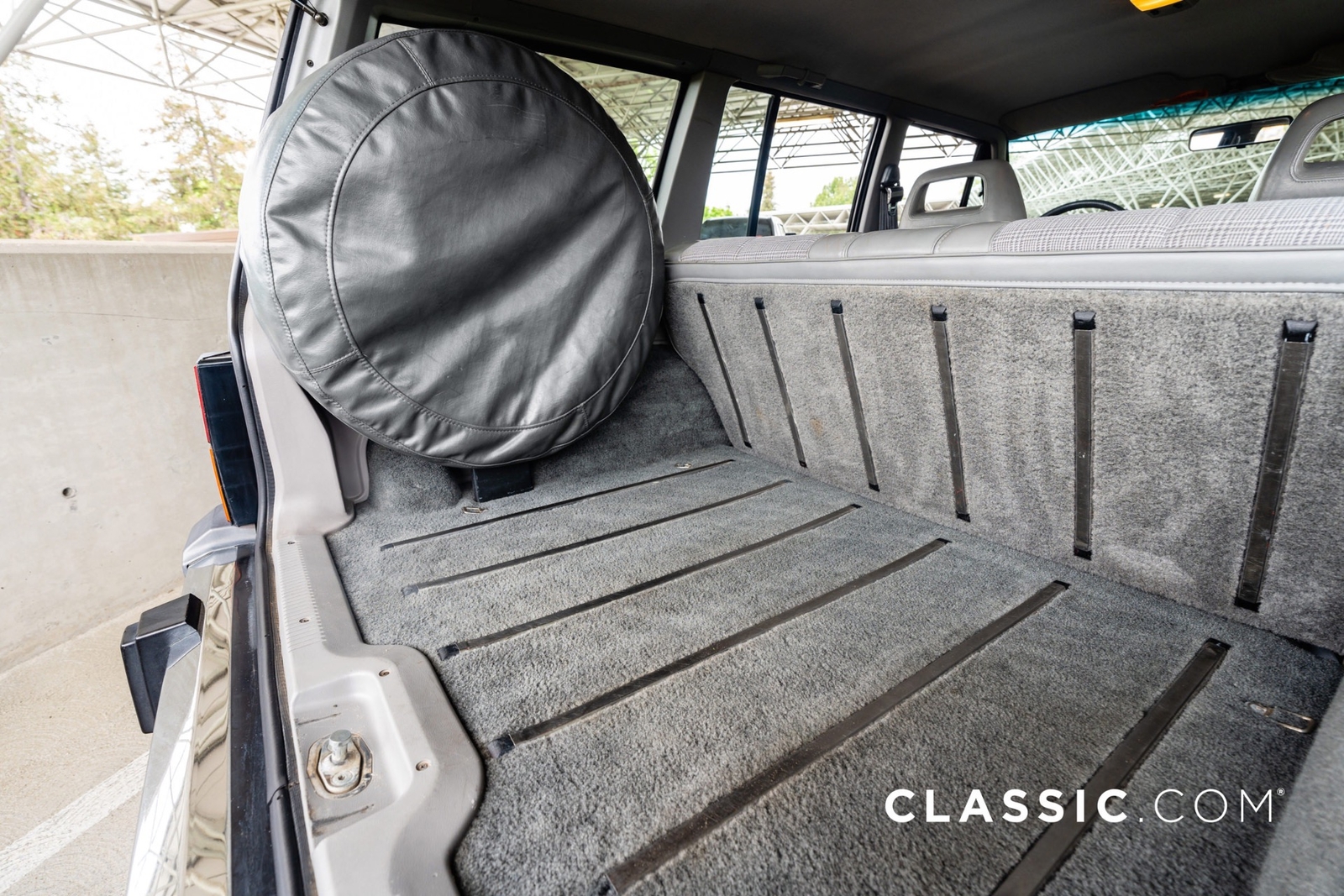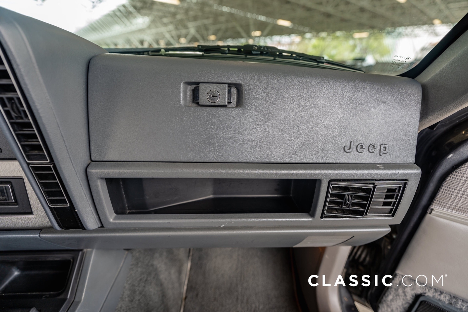 The Laredo package includes features like gray plaid cloth seats and leather-wrapped steering wheel, power windows and locks, power front seats, air conditioning, and fog lights. This example is unmodified, however, the new white-letter BFGoodrich All Terrain TA tires against the gray backdrop are a reminder of this 4x4’s off-road capability.