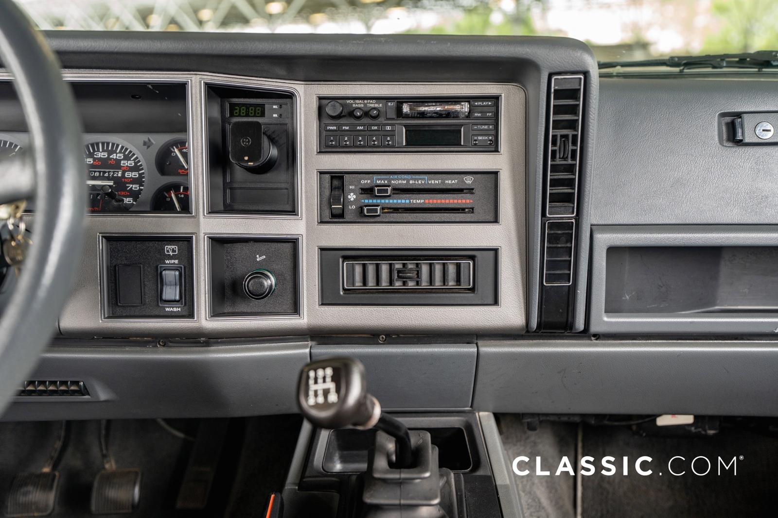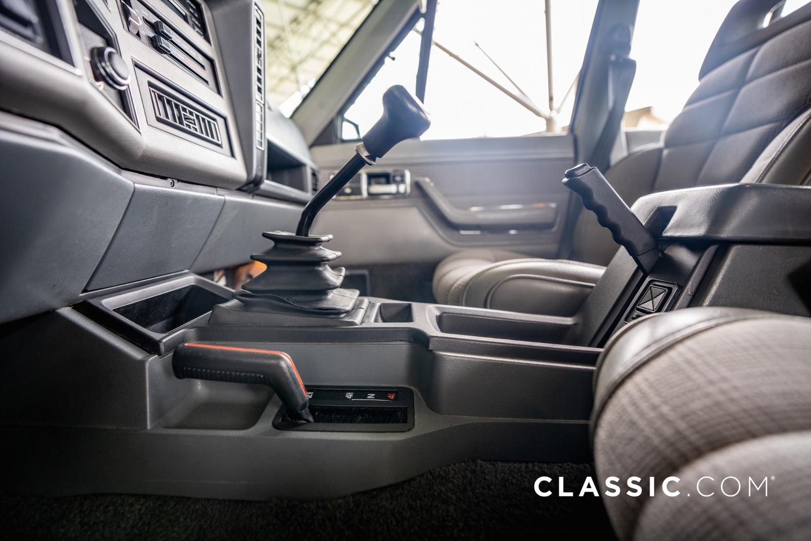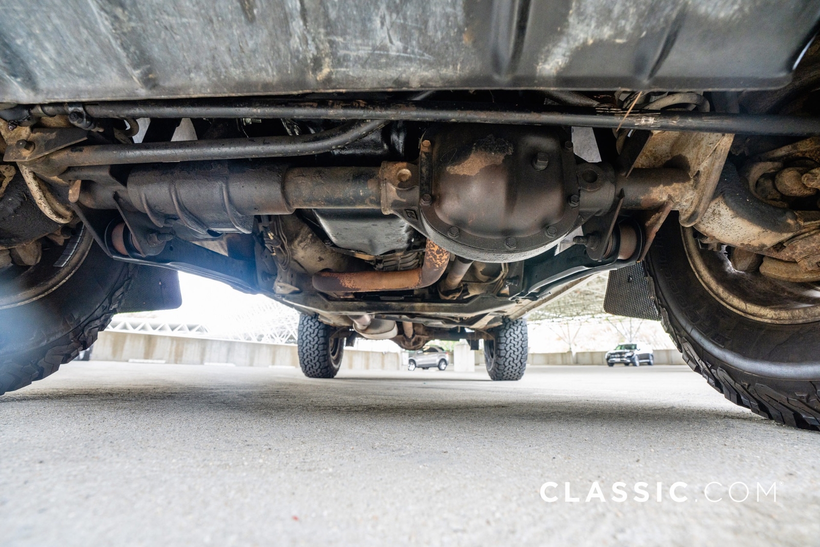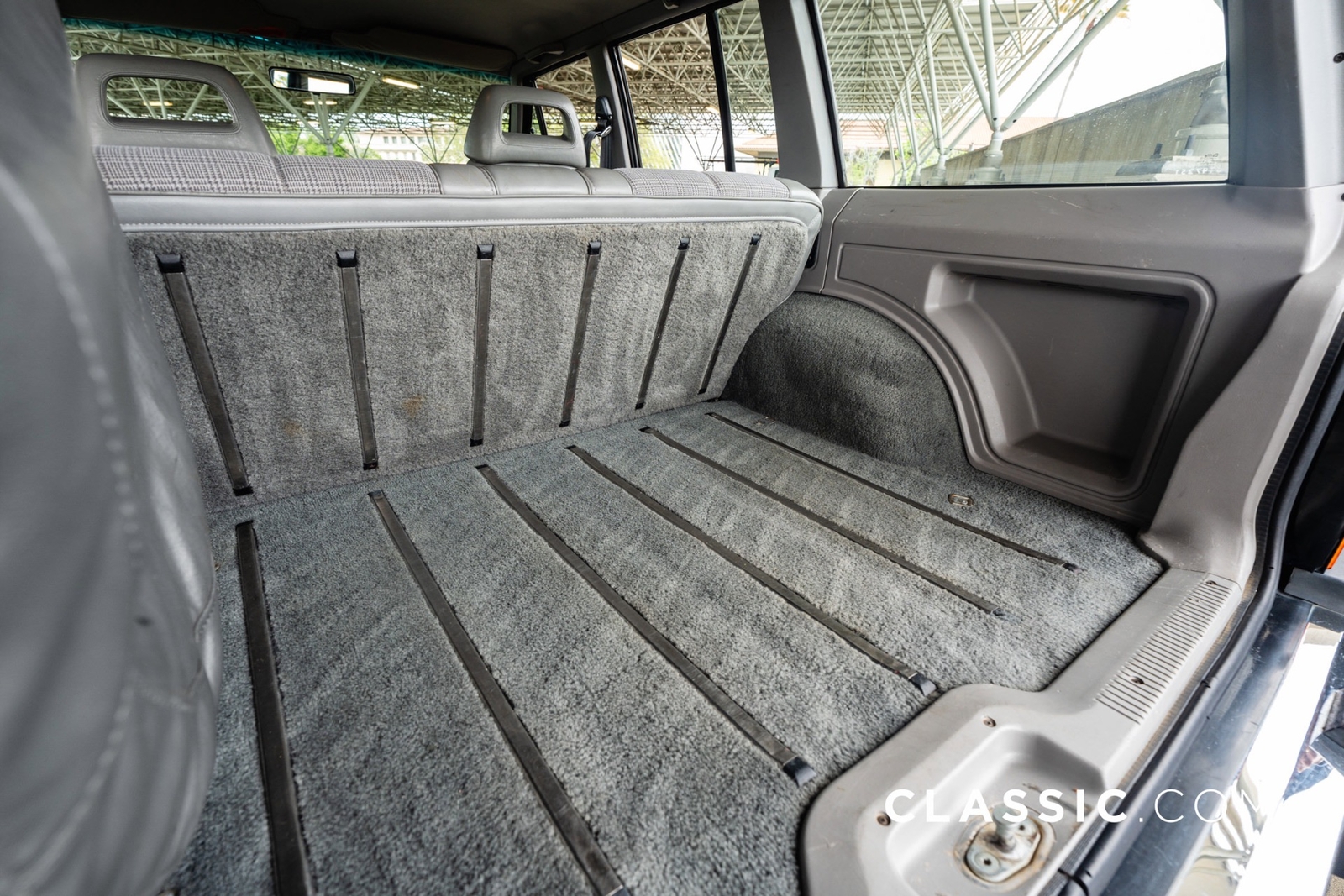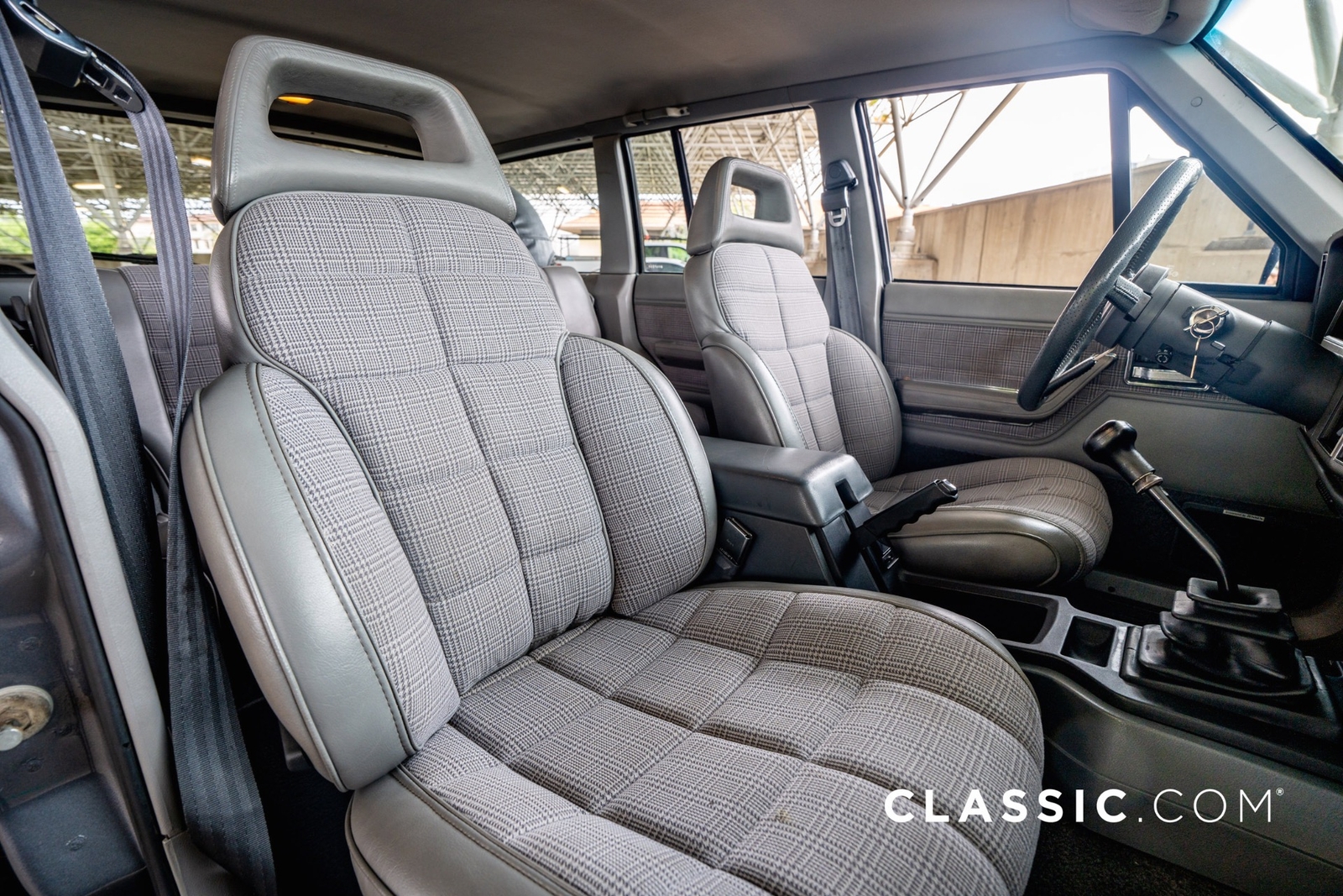 The Laredo package includes features like gray plaid cloth seats and leather-wrapped steering wheel, power windows and locks, power front seats, air conditioning, and fog lights. This example is unmodified, however, the new white-letter BFGoodrich All Terrain TA tires against the gray backdrop are a reminder of this 4x4’s off-road capability.