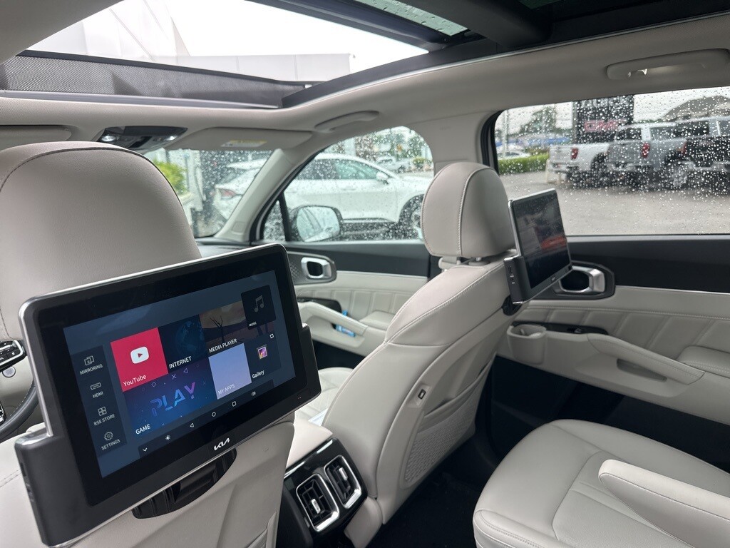CARFAX One-Owner. Certified. Glacial White Pearl 2023 Kia Sorento SX FWD 8-Speed DCT 2.5L I4 DGI Turbocharged DOHC 16V LEV3-ULEV70 281hp BACKUP CAMERA, BLUETOOTH, BOSE HIGH END SOUND PACKAGE, DVD ENTERTAINMENT SYSTEM, LEATHER SEATS, MOONROOF, MULTIMEDIA PACKAGE, NAVIGATION SYSTEM, PANORAMIC SUNROOF, POWER PACKAGE, KEYLESS ENTRY, NAVIGATION, THIRD ROW SEAT, APPLE ANDROID CARPLAY, PUSH BUTTON START, 2nd row HEADREST DVD!, 3rd row seats: split-bench, 4-Wheel Disc Brakes, 6 Speakers, ABS brakes, Air Conditioning, AM/FM radio: SiriusXM, Auto High-beam Headlights, Automatic temperature control, Brake assist, Delay-off headlights, Driver door bin, Driver vanity mirror, Emergency communication system, Front dual zone A/C, Fully automatic headlights, Heated Front Bucket Seats, Illuminated entry, Navigation System, Occupant sensing airbag, Outside temperature display, Overhead console, Panic alarm, Passenger vanity mirror, Power driver seat, Power moonroof, Power steering, Power windows, Radio data system, Radio: AM/FM Audio System, Rain sensing wipers, Rear air conditioning, Rear anti-roll bar, Rear window defroster, Rear window wiper, Remote keyless entry, Security system, Split folding rear seat, Steering wheel mounted audio controls, SynTex Artificial Leather Seat Trim, Tachometer, Telescoping steering wheel, Tilt steering wheel, Trip computer, Wheels: 8.5J x 20 Gloss Black Alloy.