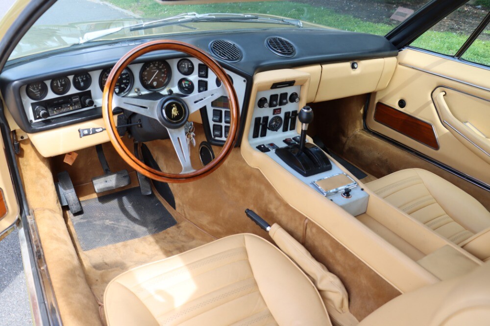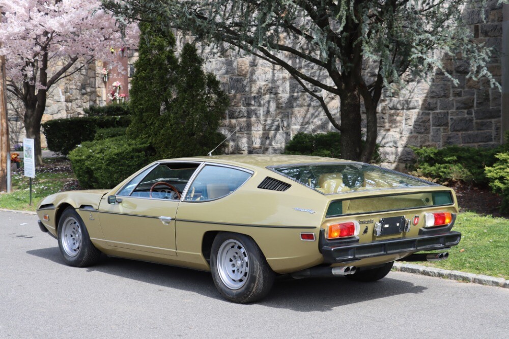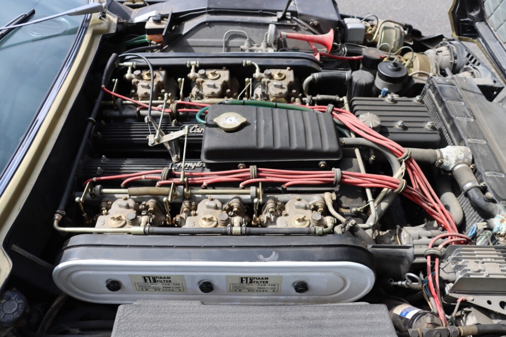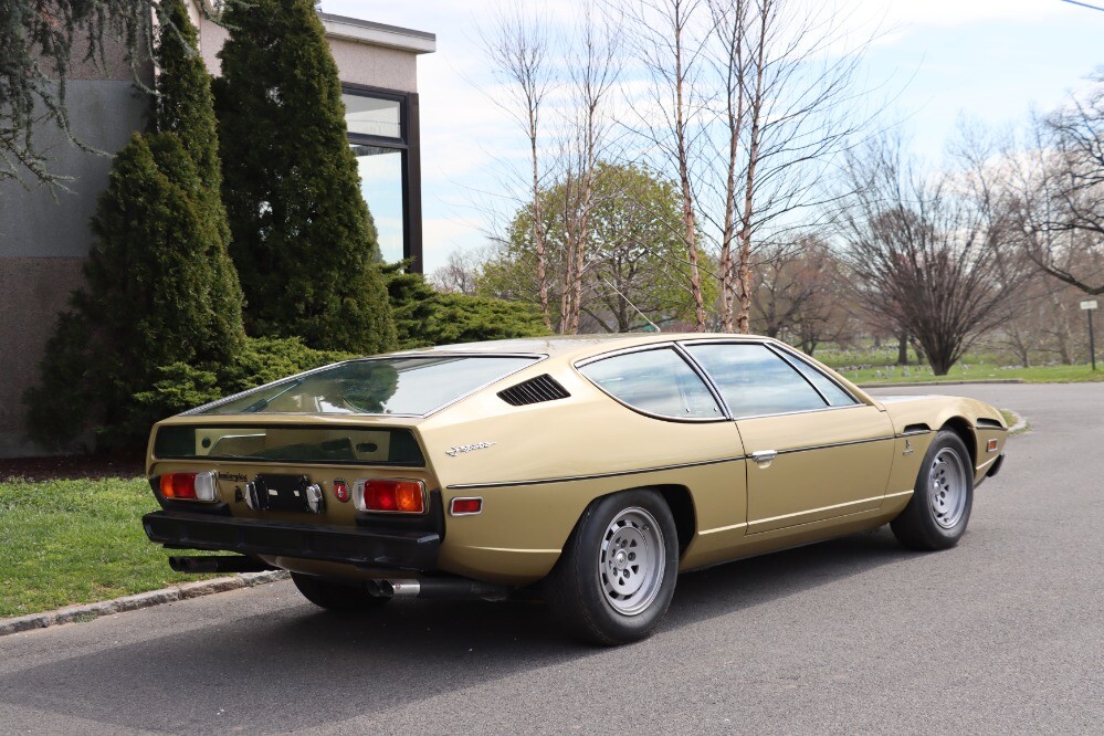 This example of the final series Espada was completed at the Sant'Agata, Bolognese based Lamborghini plant in the early months of 1975, and benefits from the refinements carried out throughout the production run. Elegantly finished in Oro Metallizzato (gold) over a Senape (mustard) interior, it was completed to American spec and delivered new to Carrie Auto in Canada on May 14, 1975. The early history is not recorded, but the car has been in the present ownership for over two decades. Documented by a Lamborghini Certificato d'origine documenting that it is a numbers matching car in its original colors, a technical inspection letter from Lamborghini from December 2003 goes further to indicate that the car had been totally restored by Automobili Lamborghini Centro di Restauro in Sant'Agata Bologense earlier that year. Garaged without use since the restoration, it's ready for mechanical recommissioning. This elegant example of the Bertone-designed Espada presents nicely throughout, and offers its next caretaker the opportunity for ample V-12 power along with room for four.