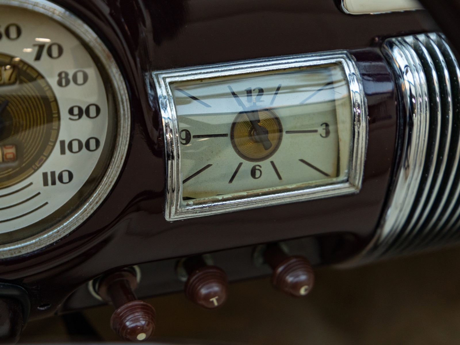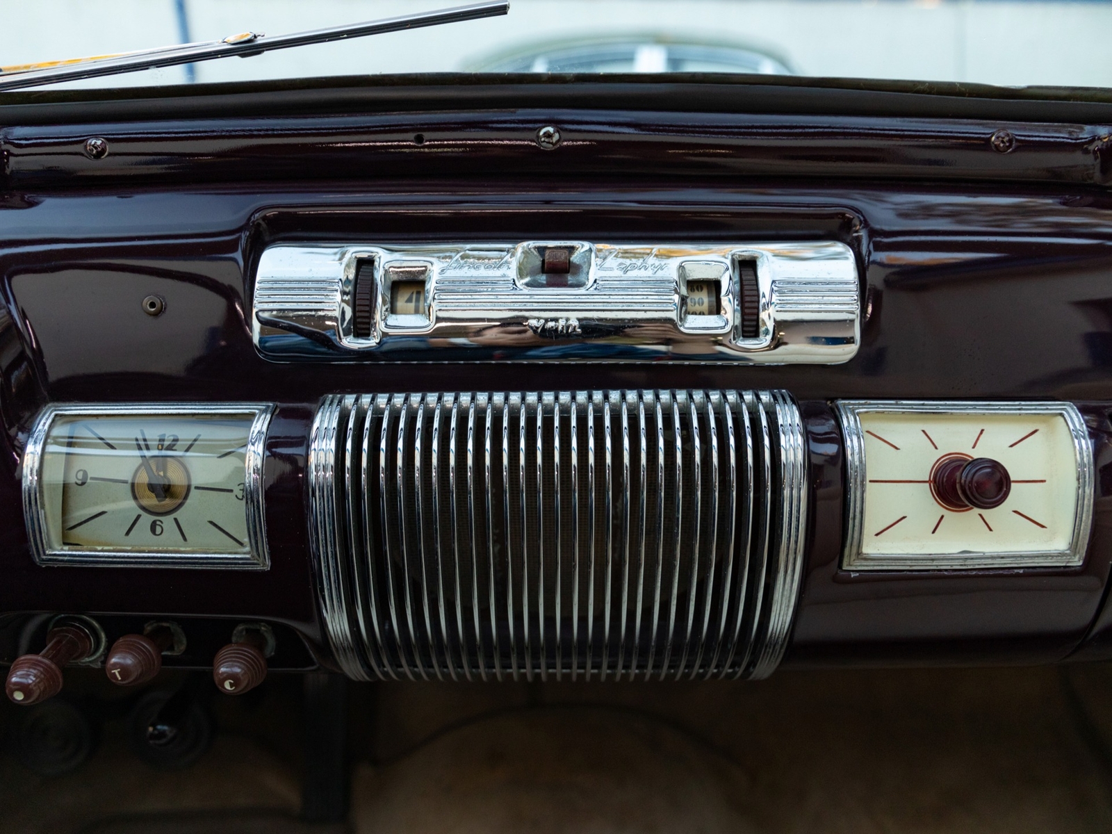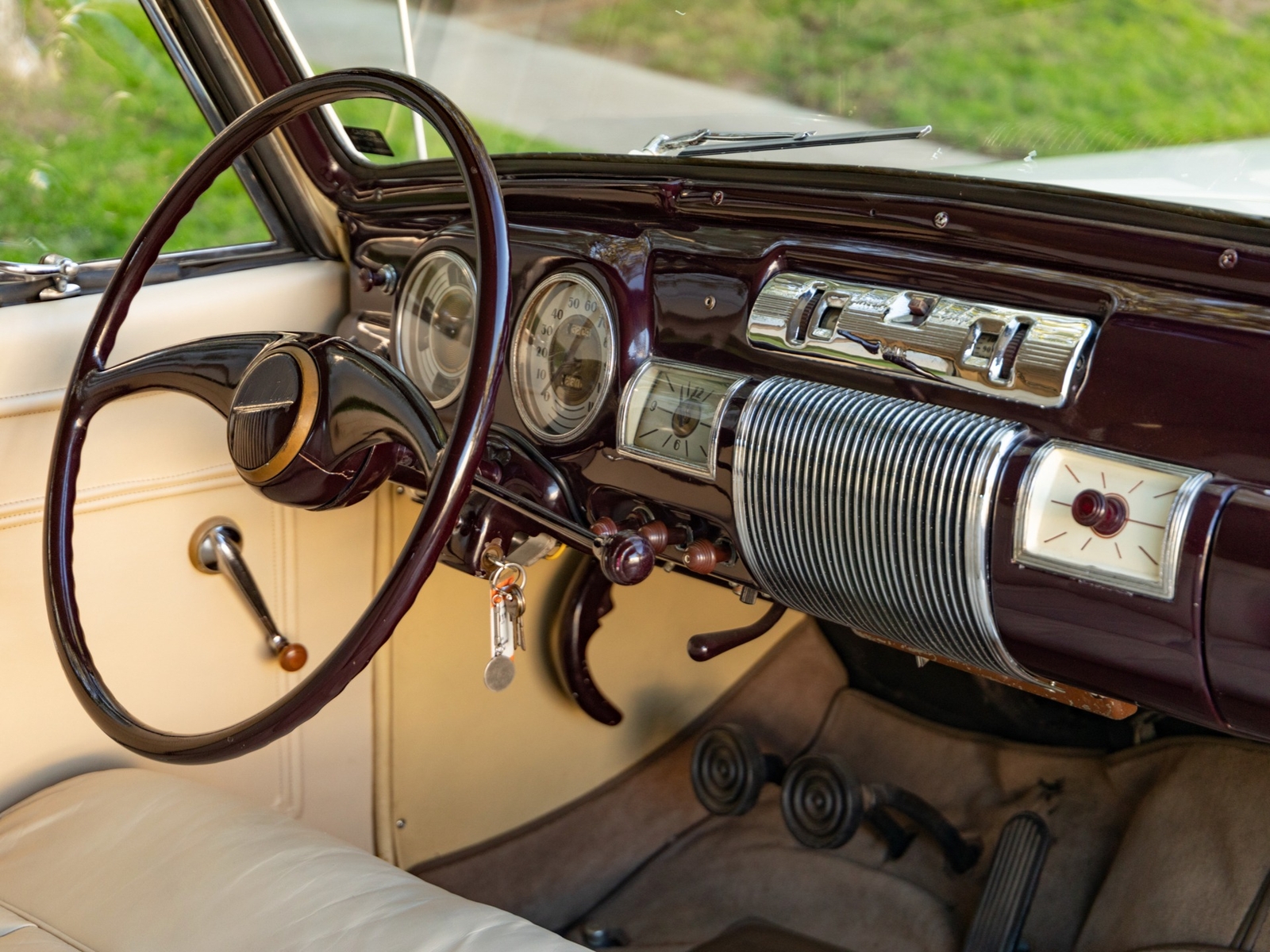 More than almost 80 years later they are one of the few such models still as attractive today as they were to buyers when new. Of all the elegant models produced, the convertible is the rarest with only 350 manufactured in 1940 and with very few known to remain according to the LZOC. The car was built on a 125 inch wheelbase channel section frame with a central X crossmember. Inside bench seats dressed in Maroon leather seat four comfortably and the car boasts a woodgrain instrument panel that houses the standard array of Gold tone gauges in a beautiful period Art Deco theme with its original AM radio! The clock matching the speedometer dresses up the passenger side and the car has a power top and original factory added options of both the AM Radio and Heater and side mirror.