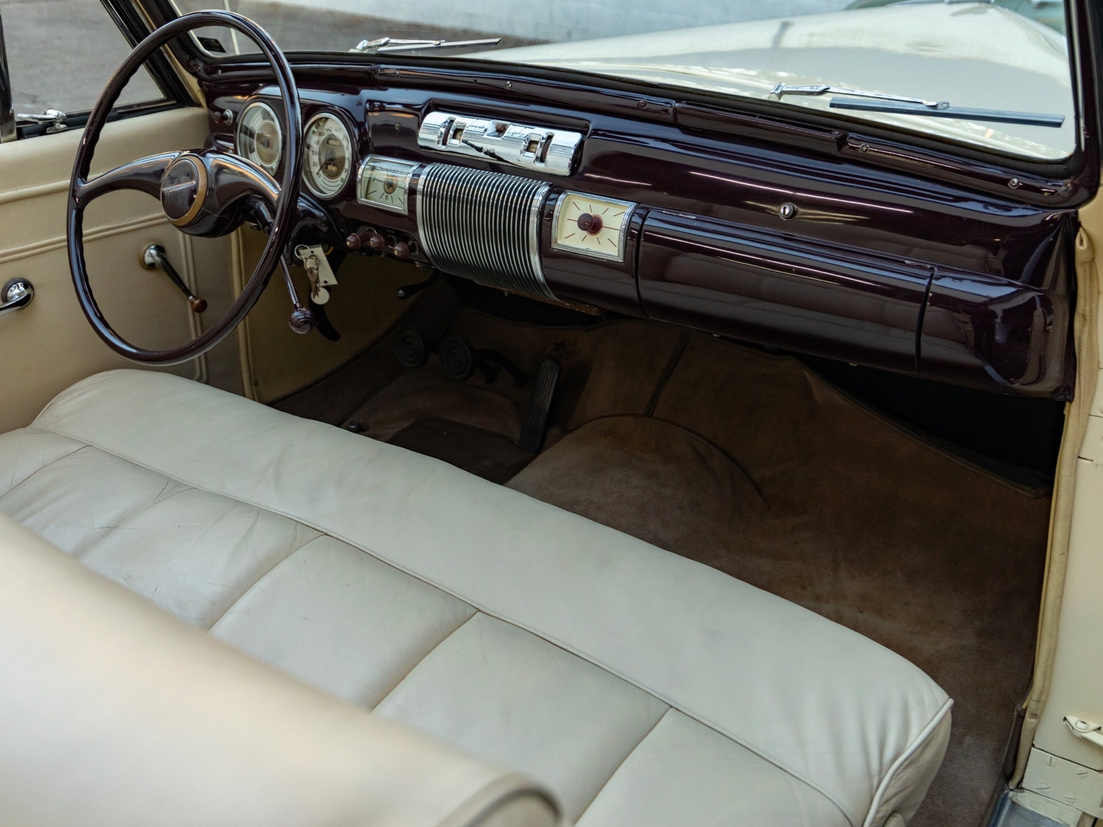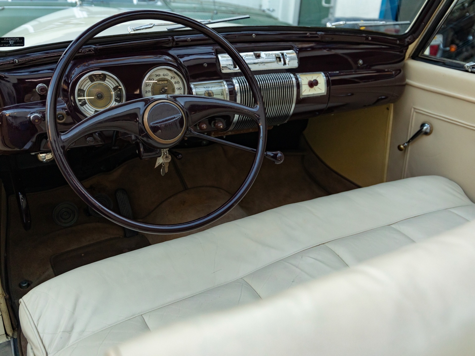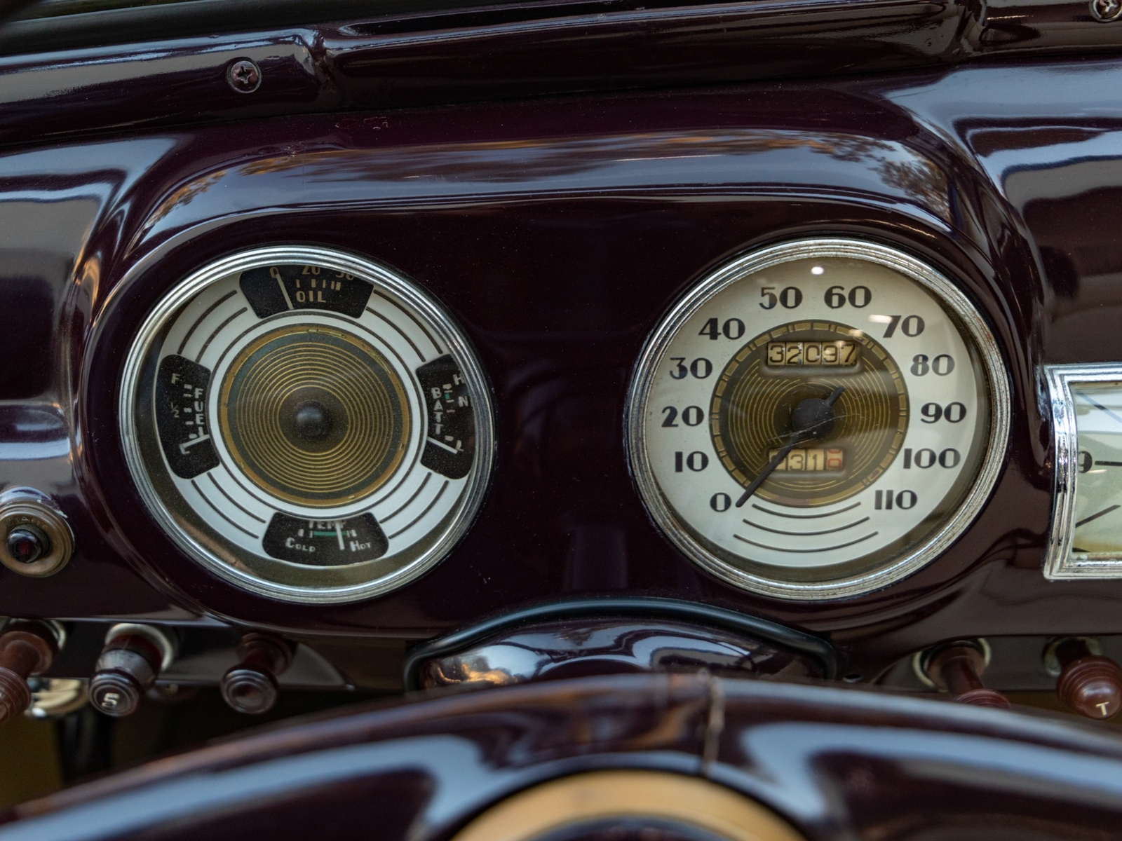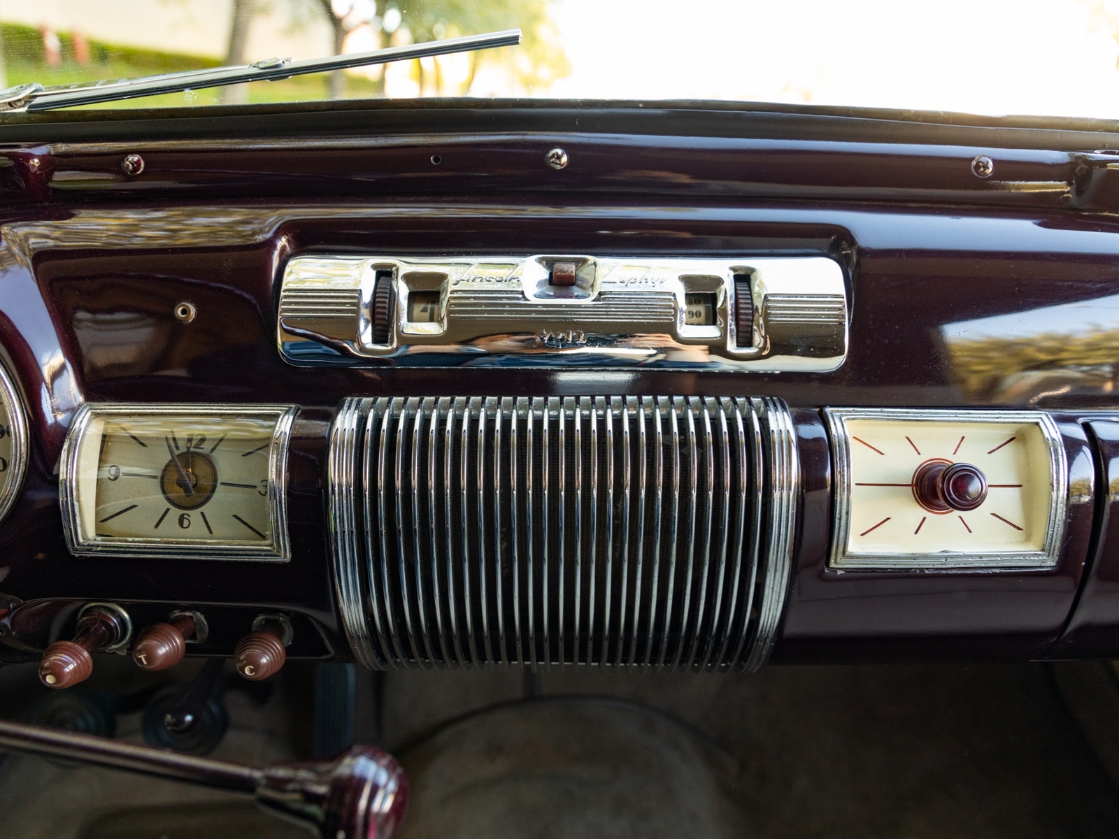 More than almost 80 years later they are one of the few such models still as attractive today as they were to buyers when new. Of all the elegant models produced, the convertible is the rarest with only 350 manufactured in 1940 and with very few known to remain according to the LZOC. The car was built on a 125 inch wheelbase channel section frame with a central X crossmember. Inside bench seats dressed in Maroon leather seat four comfortably and the car boasts a woodgrain instrument panel that houses the standard array of Gold tone gauges in a beautiful period Art Deco theme with its original AM radio! The clock matching the speedometer dresses up the passenger side and the car has a power top and original factory added options of both the AM Radio and Heater and side mirror.