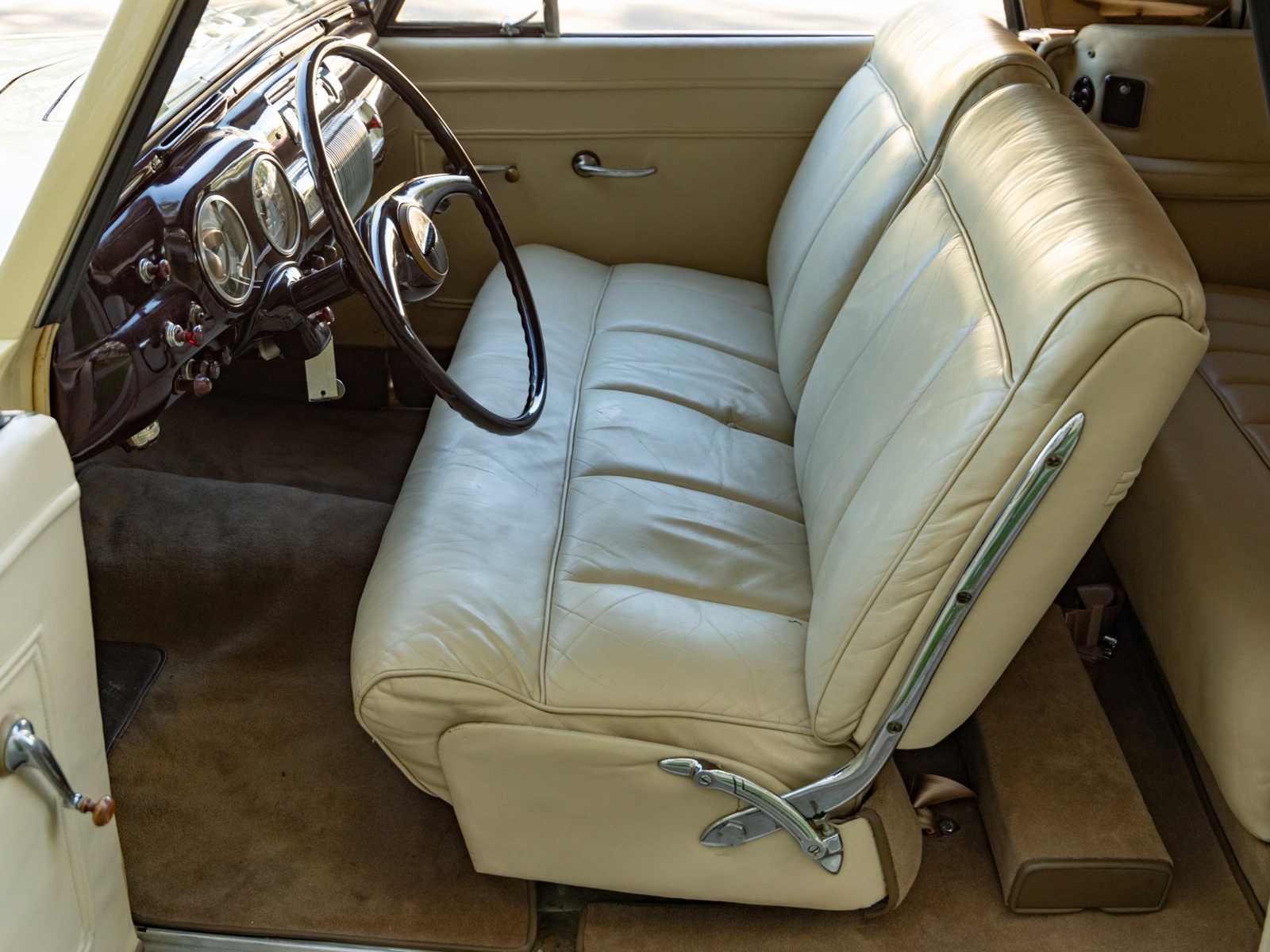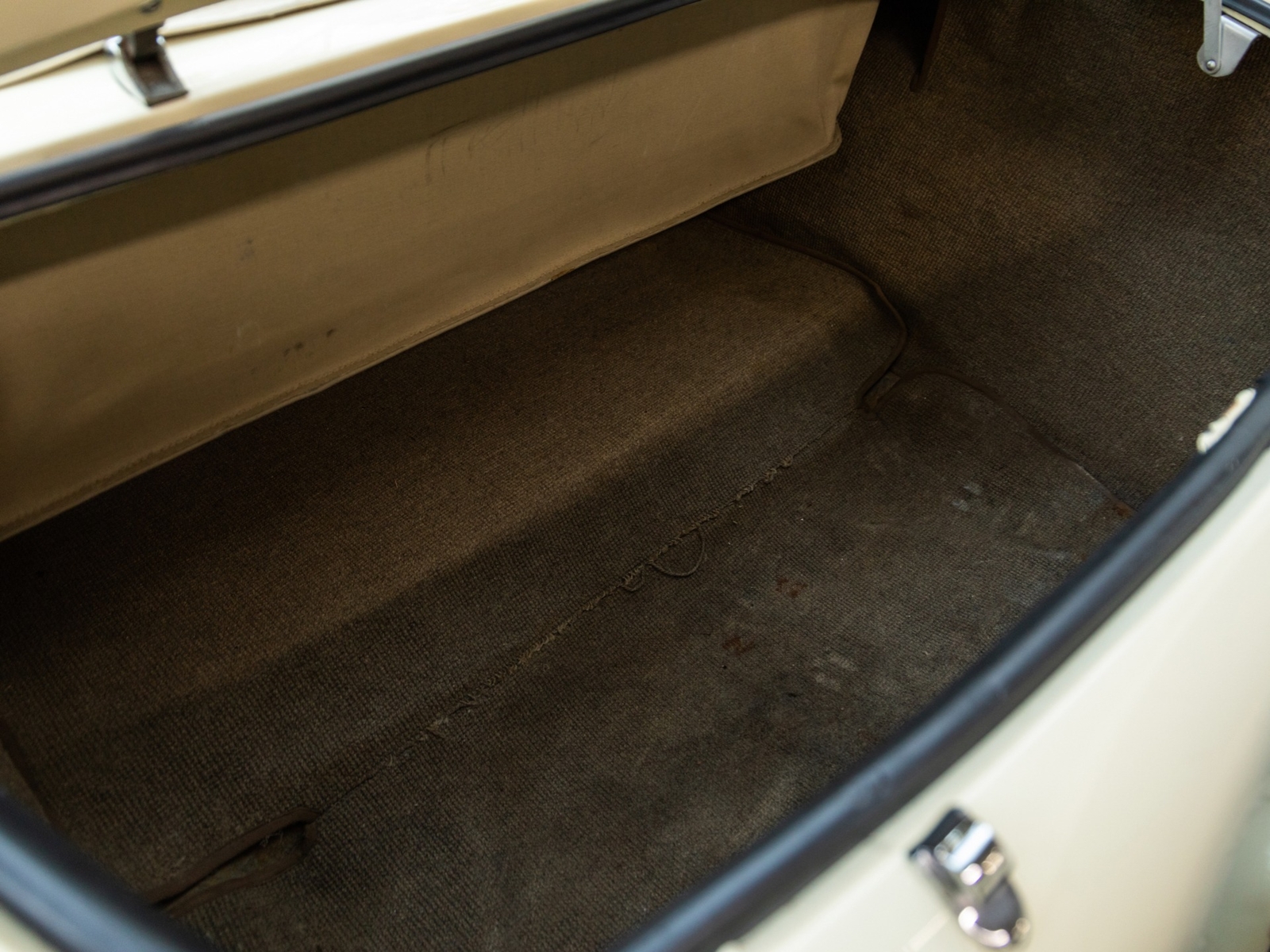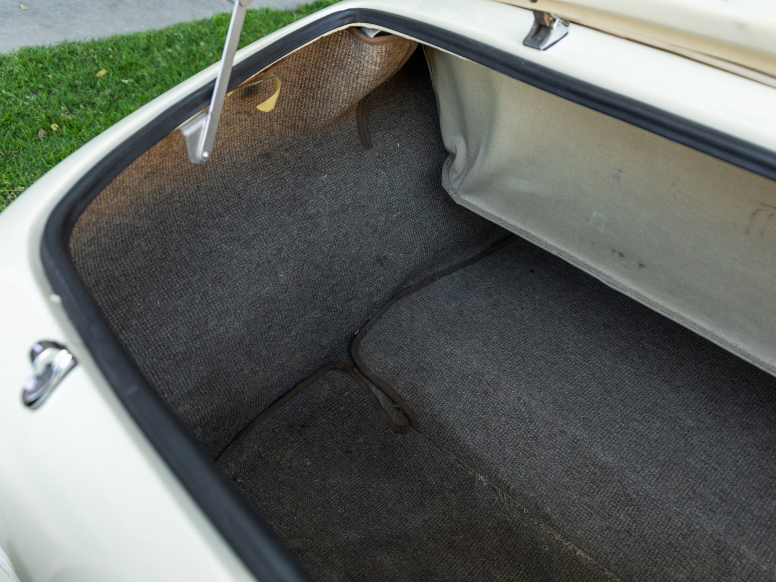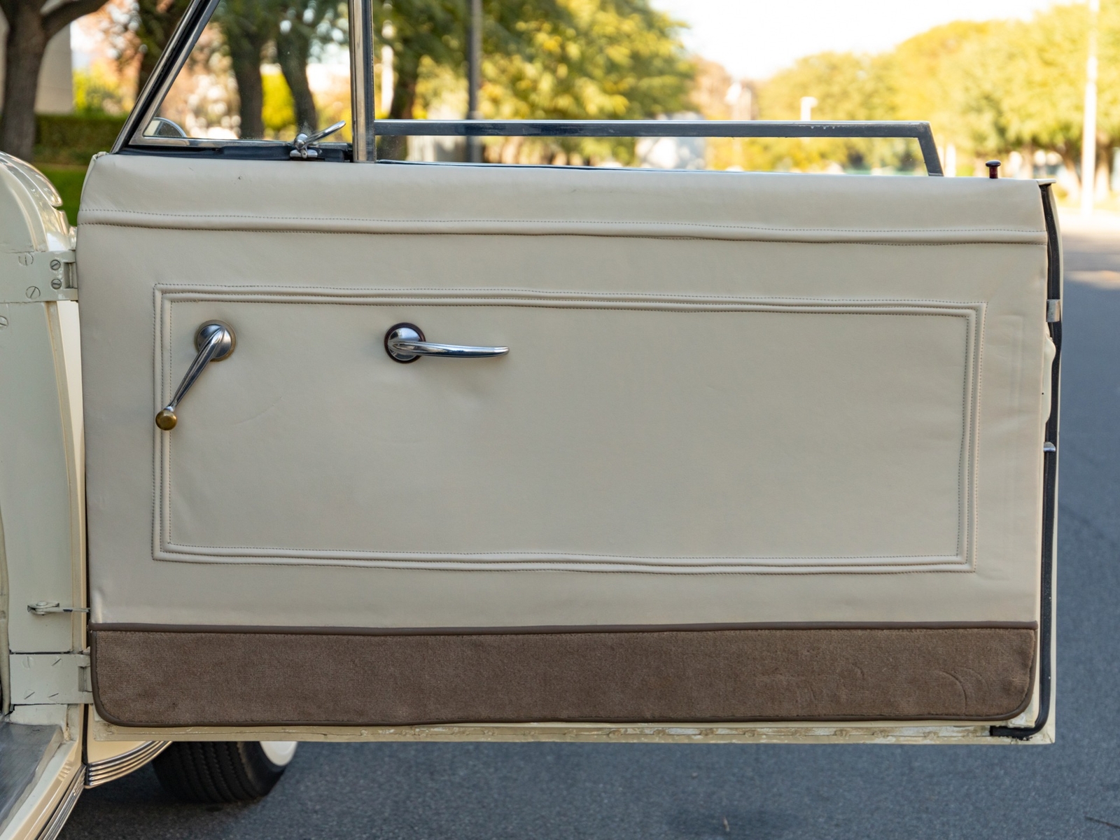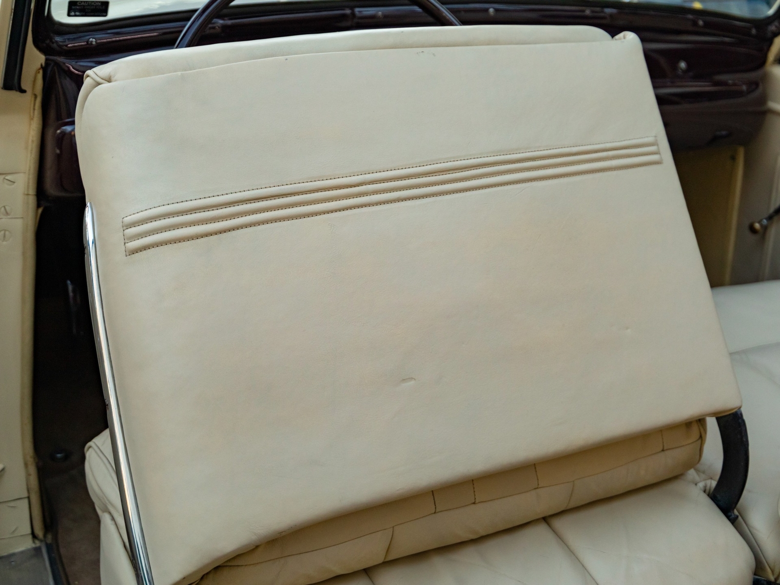 This particular example was beautifully and painstakingly restored with no expense spared some years ago prior to being acquired by its long time collector owner in this 'Ivory' color which is stunningly striking along with its white wall tires and Zephyr wheels. The 'Tan' leather interior with wool carpets has also been faithfully reupholstered and is in exceptional condition throughout and the correct factory canvas power Tan top is also in exceptional condition. There can only be very few miles on the car since it's unibody (body welded to the frame) cosmetic and mechanical restoration. This is a rust free car that retains all of its original body panels including floors, rockers, and trunk with very straight panels. That factor is extremely important on a unibody designed car such as this. Completely restored from the ground up mechanically, cosmetically, and correctly. All the chrome has been replated including top bows, seat hardware, etc. Gold tone gauge cluster and the woodgrain were also fully restored. The floor boards, trunk and all the typical rust-prone areas are completely solid and rust-free and the car has has no signs of any accidents - a razor straight body and obviously an always garaged and cherished car since new with no rust! The original spare wheel and tire and factory tools are still located in their rightful storage place in the trunk.