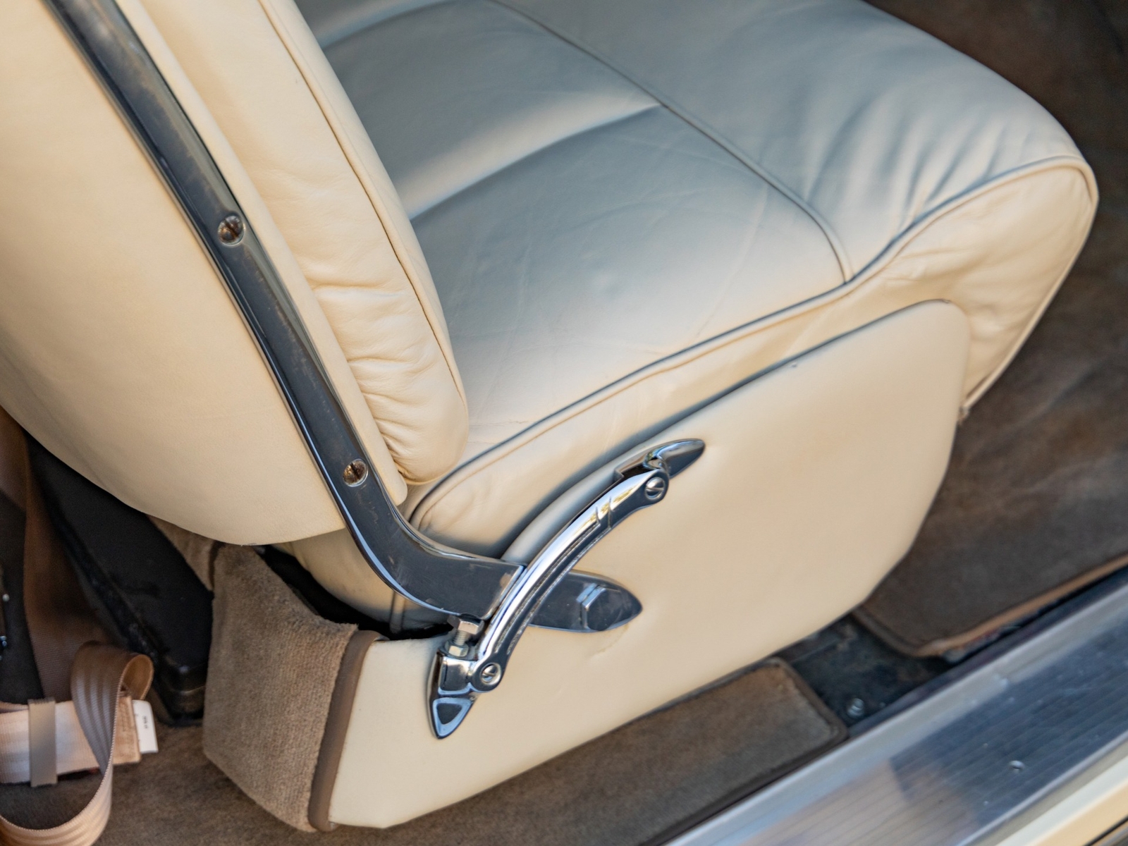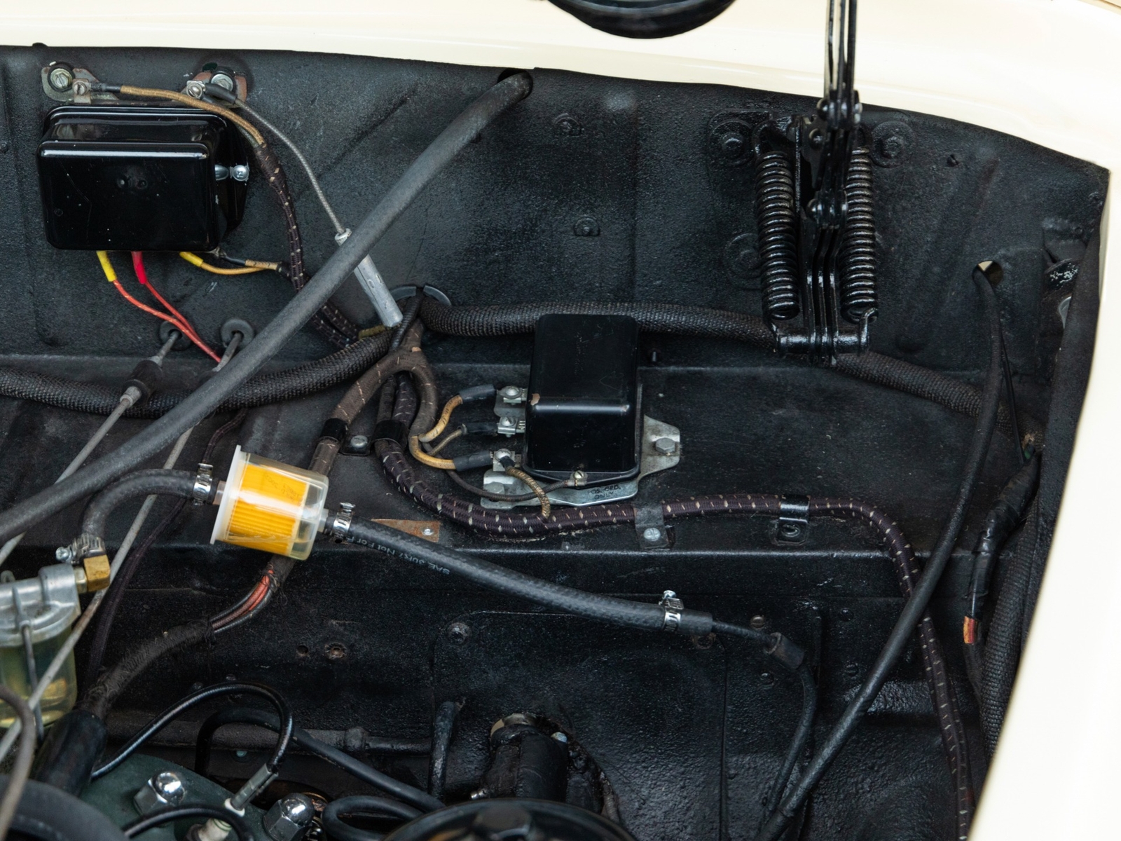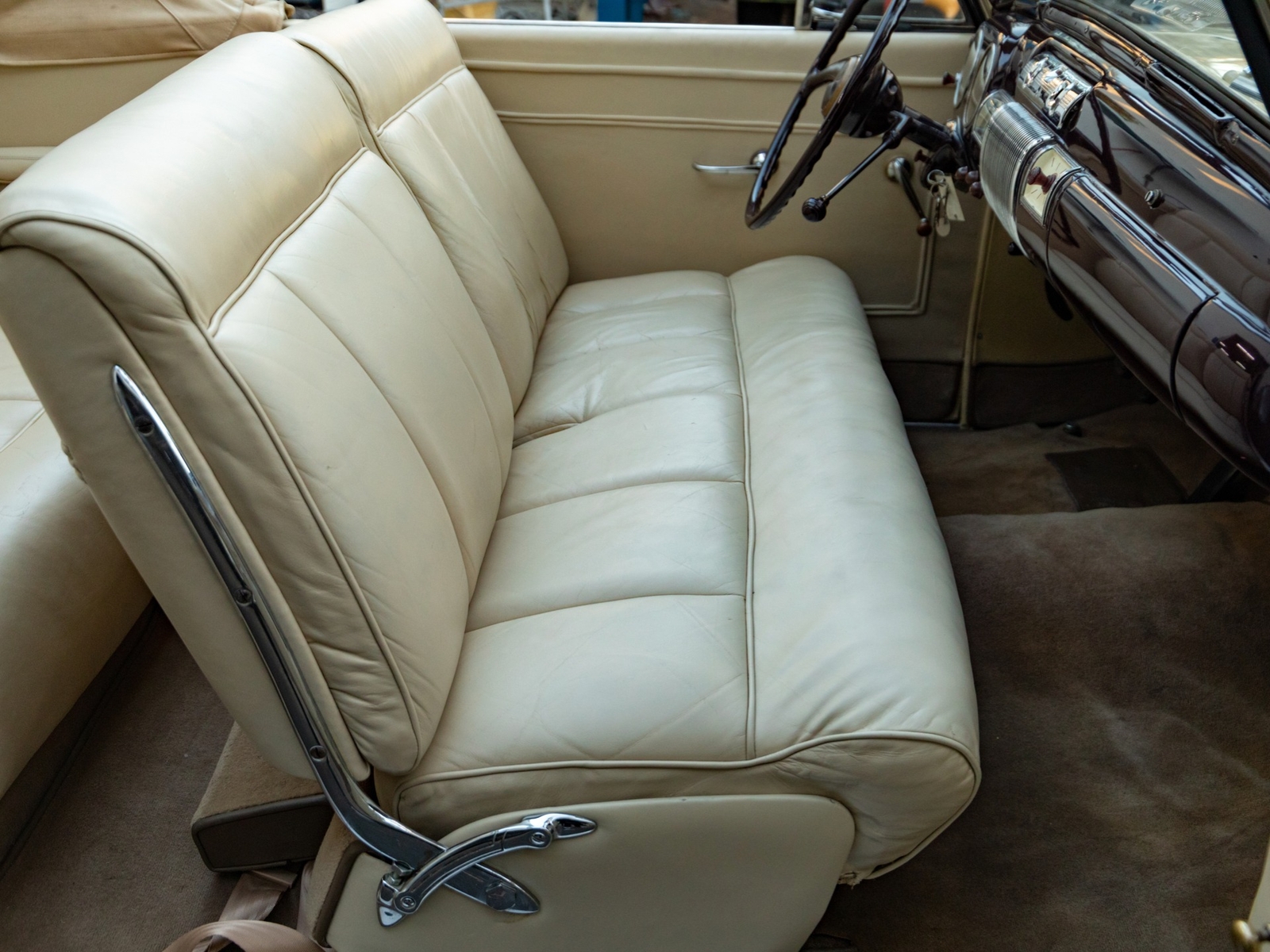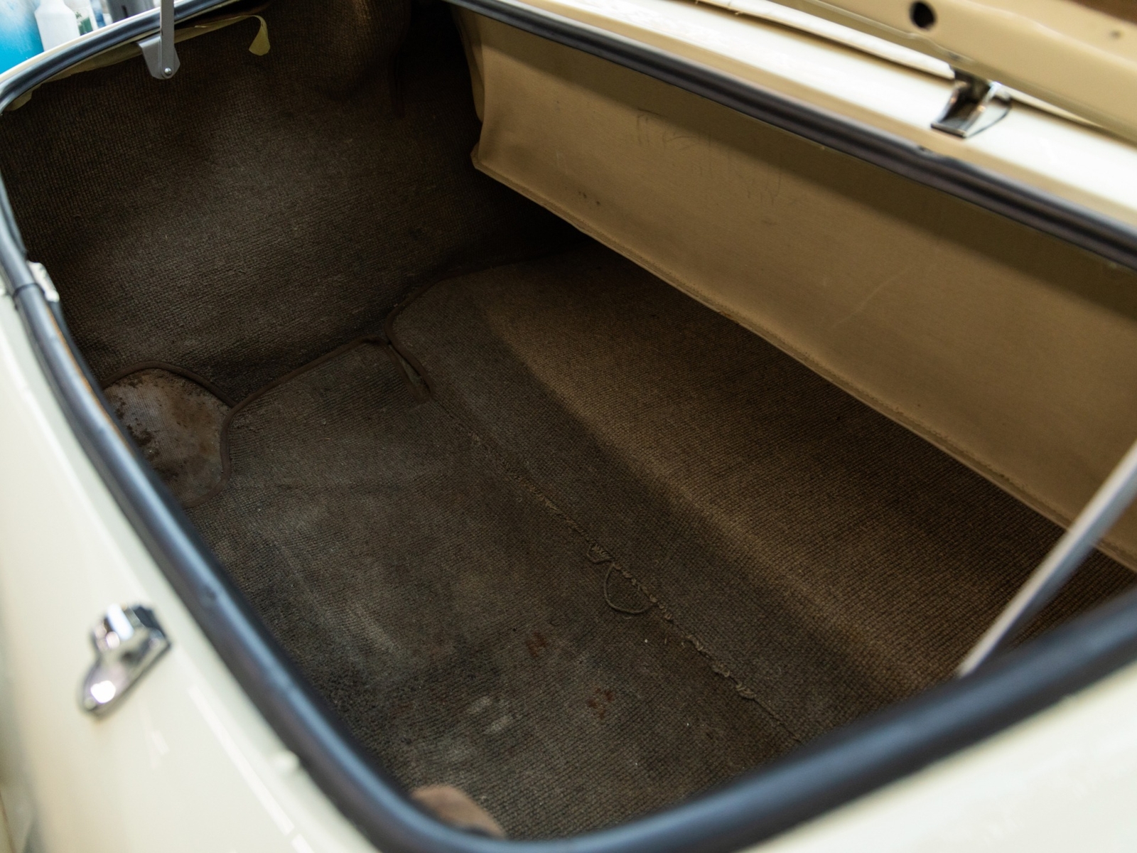 This particular example was beautifully and painstakingly restored with no expense spared some years ago prior to being acquired by its long time collector owner in this 'Ivory' color which is stunningly striking along with its white wall tires and Zephyr wheels. The 'Tan' leather interior with wool carpets has also been faithfully reupholstered and is in exceptional condition throughout and the correct factory canvas power Tan top is also in exceptional condition. There can only be very few miles on the car since it's unibody (body welded to the frame) cosmetic and mechanical restoration. This is a rust free car that retains all of its original body panels including floors, rockers, and trunk with very straight panels. That factor is extremely important on a unibody designed car such as this. Completely restored from the ground up mechanically, cosmetically, and correctly. All the chrome has been replated including top bows, seat hardware, etc. Gold tone gauge cluster and the woodgrain were also fully restored. The floor boards, trunk and all the typical rust-prone areas are completely solid and rust-free and the car has has no signs of any accidents - a razor straight body and obviously an always garaged and cherished car since new with no rust! The original spare wheel and tire and factory tools are still located in their rightful storage place in the trunk.