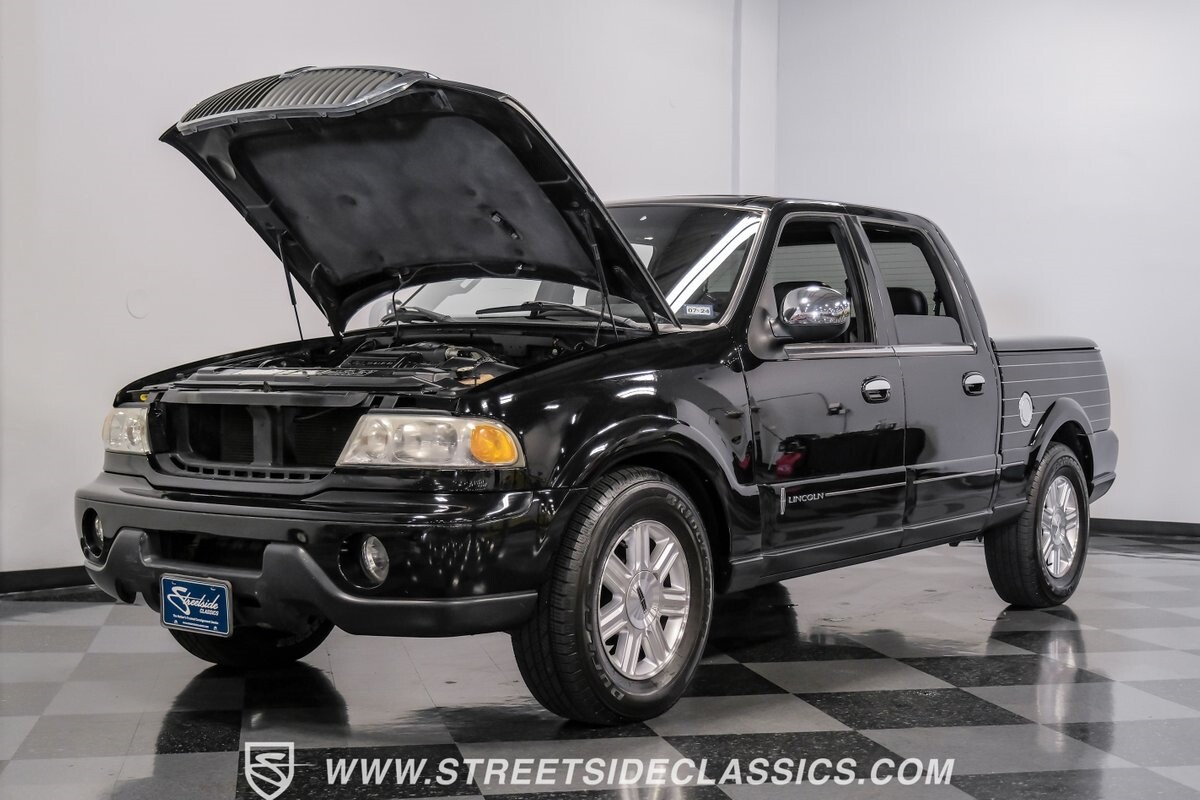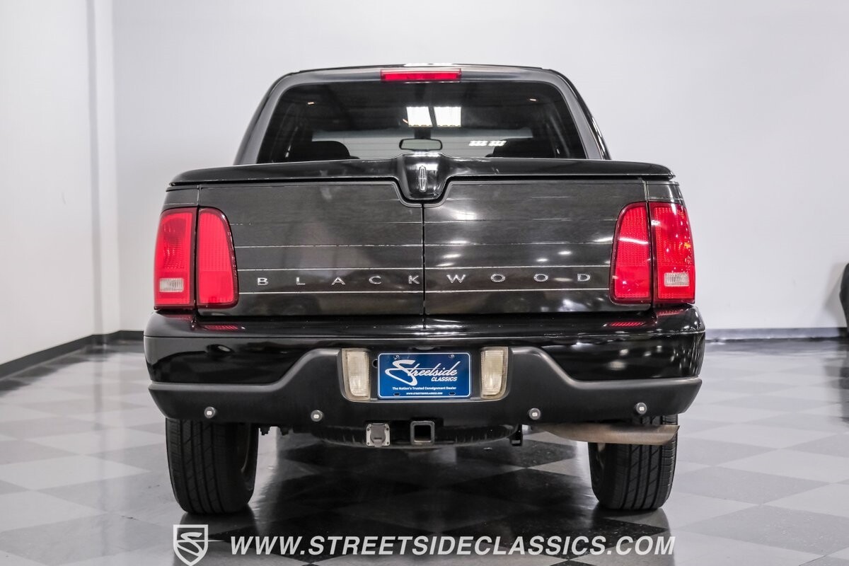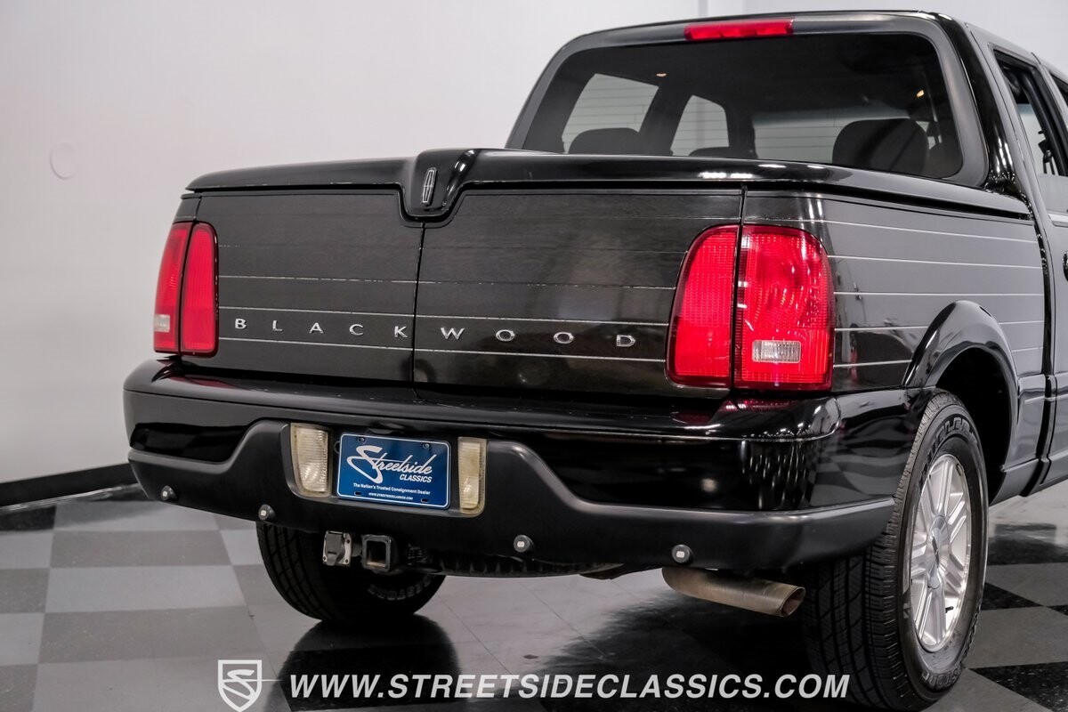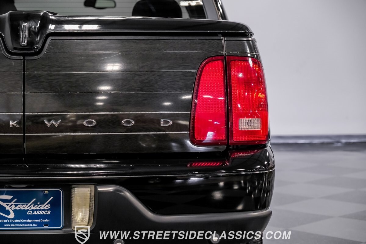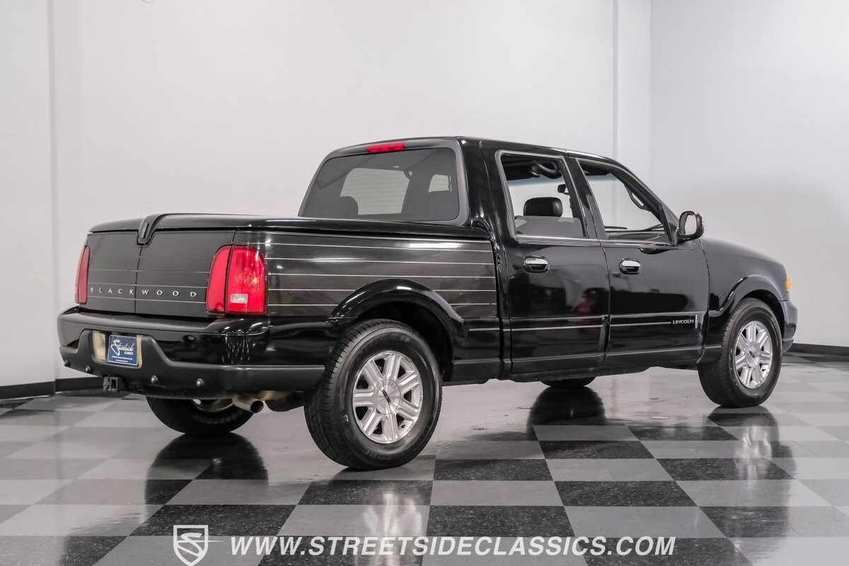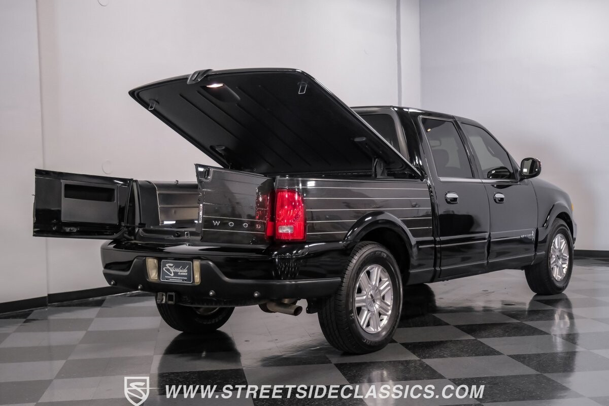 A vision in black, this 2002 Lincoln Blackwood is a rare jewel, mirroring the night sky. From its 18-inch wheels to the 265/70R18 tires, it stands bold and assertive. The black exterior remains largely true to its origins, with wood grain panels that add a touch of sophistication. The meticulous design extends to the functionality of the tailgate, which splits open like barn doors, revealing a bed covered that lifts to offer locked storage bins. Tinted windows and a chrome gas cap complement the overall look, crafting an appearance as functional as it is aesthetically pleasing.