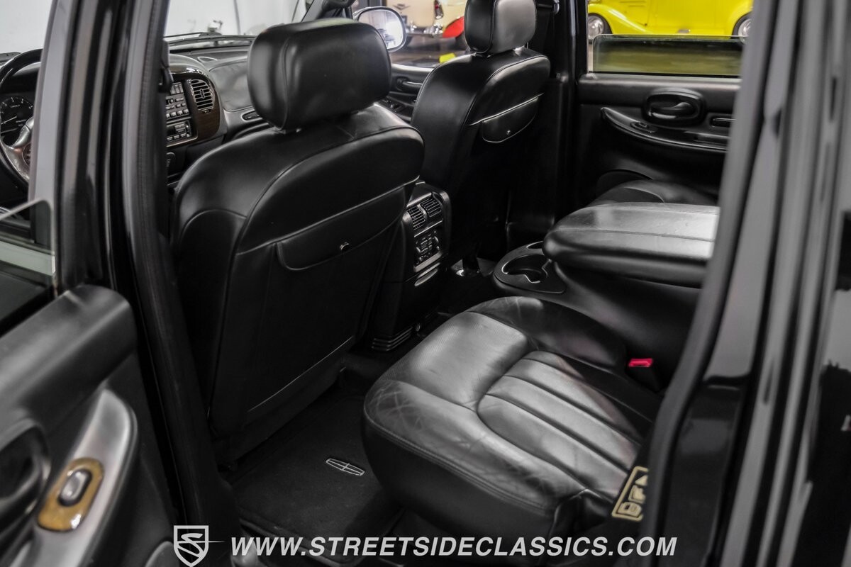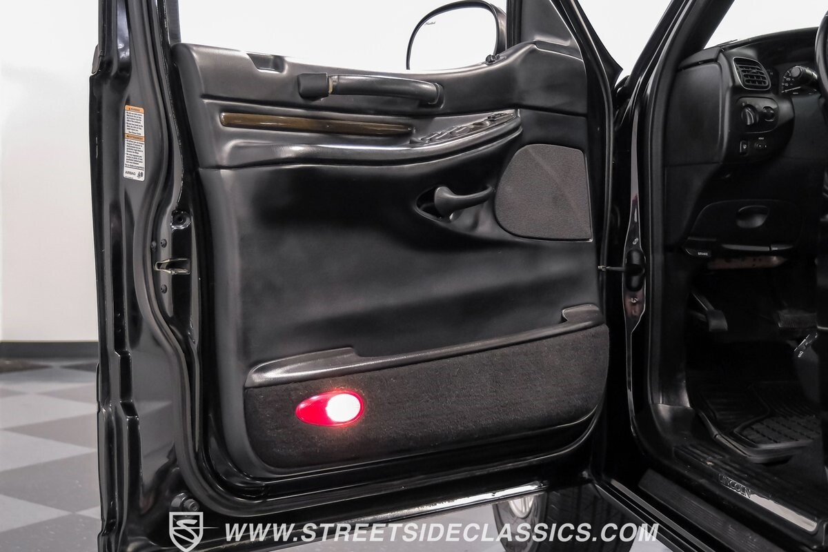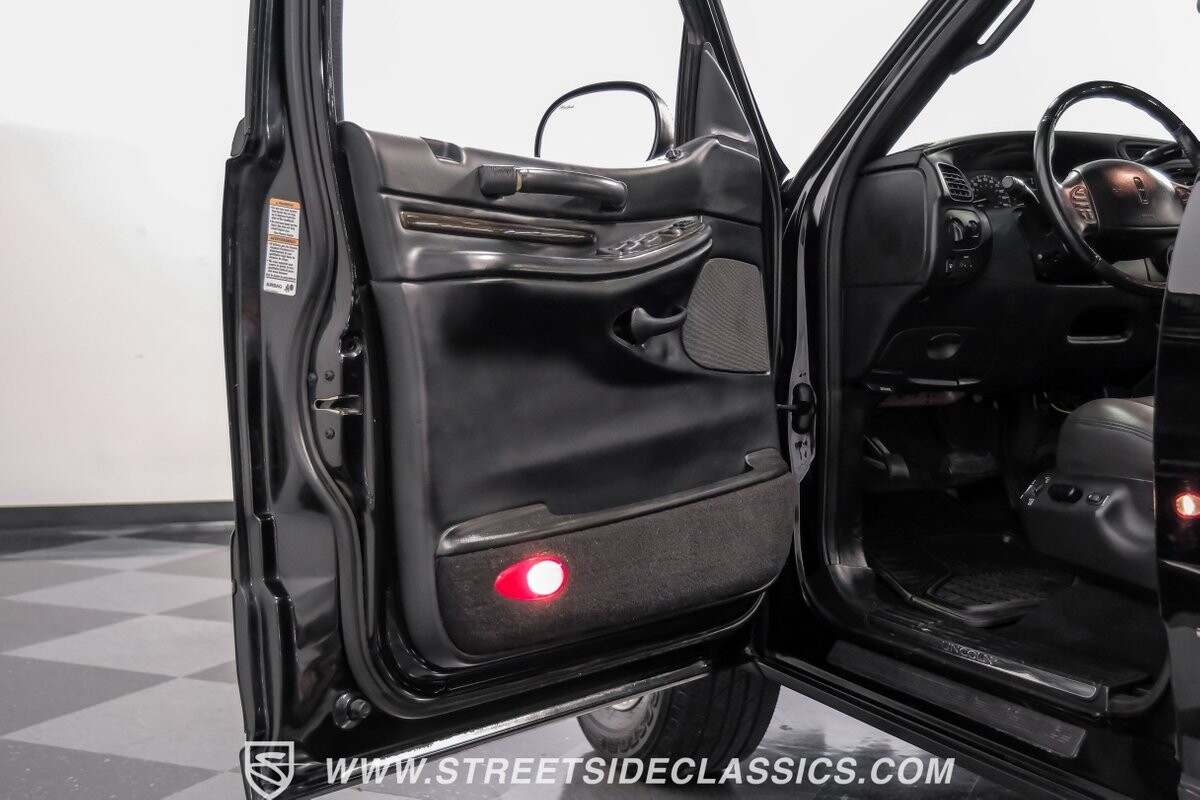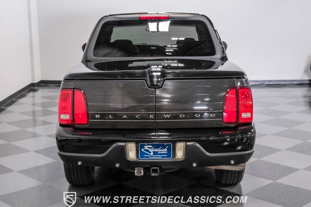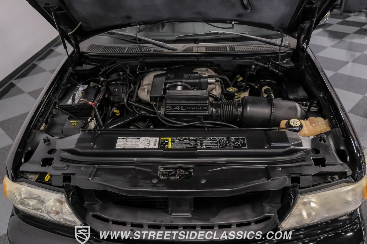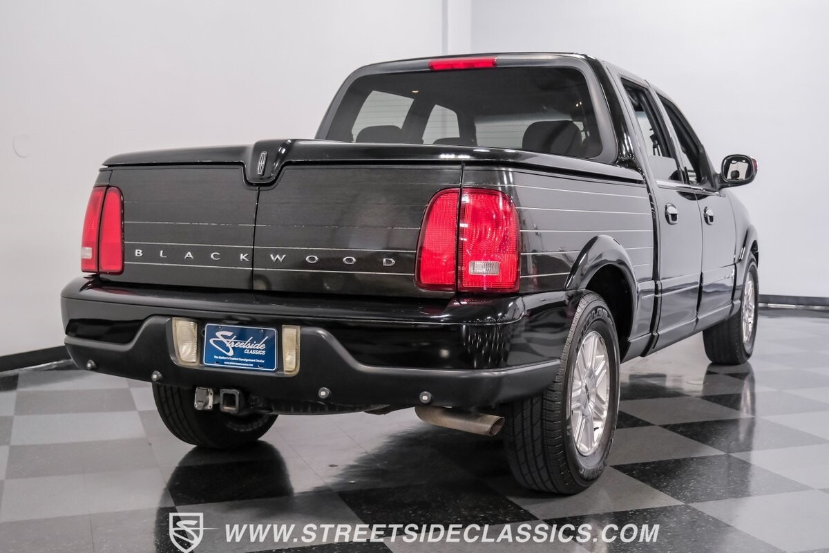 A vision in black, this 2002 Lincoln Blackwood is a rare jewel, mirroring the night sky. From its 18-inch wheels to the 265/70R18 tires, it stands bold and assertive. The black exterior remains largely true to its origins, with wood grain panels that add a touch of sophistication. The meticulous design extends to the functionality of the tailgate, which splits open like barn doors, revealing a bed covered that lifts to offer locked storage bins. Tinted windows and a chrome gas cap complement the overall look, crafting an appearance as functional as it is aesthetically pleasing.