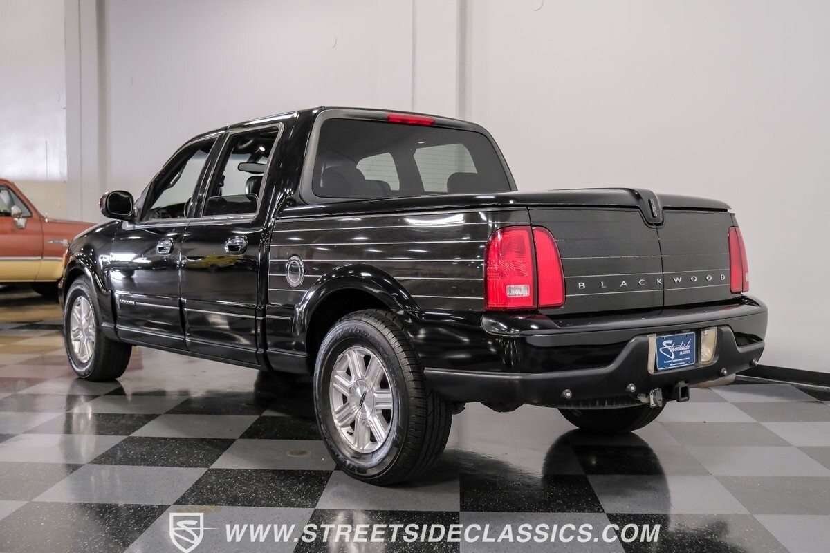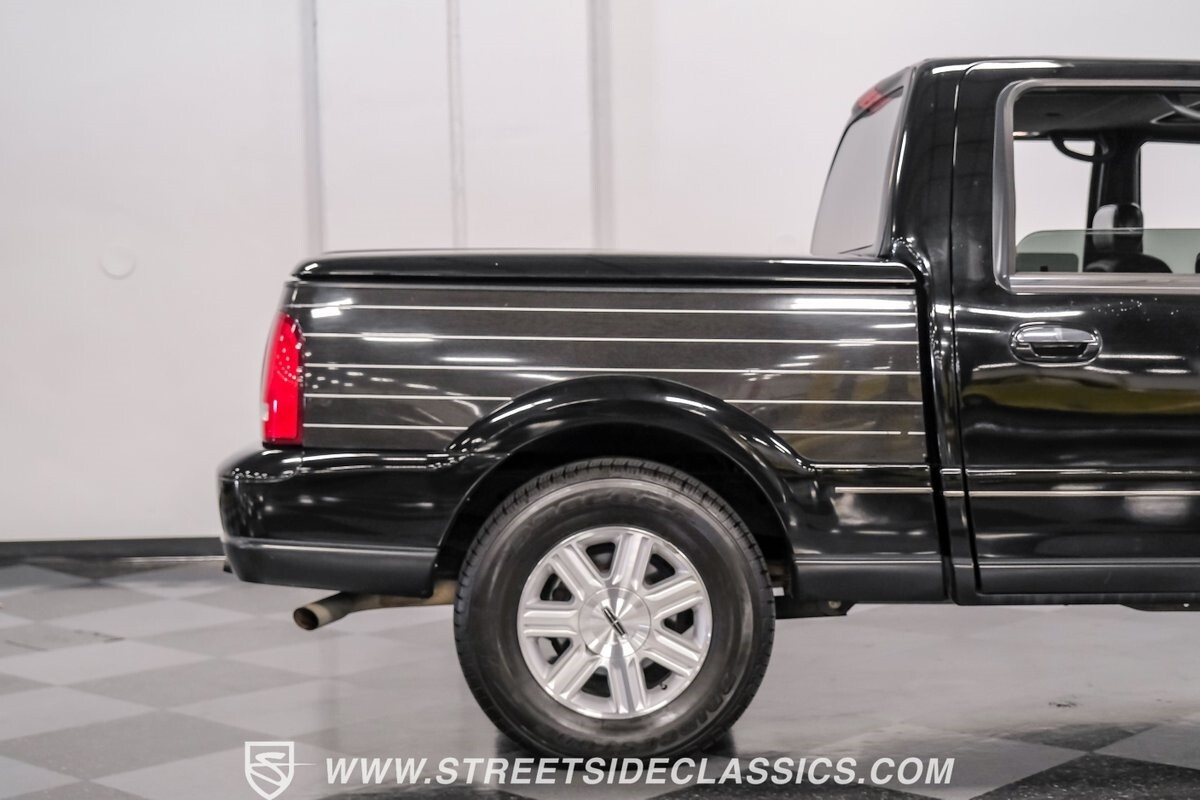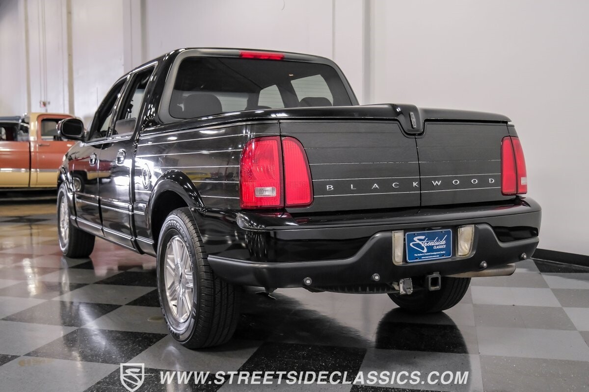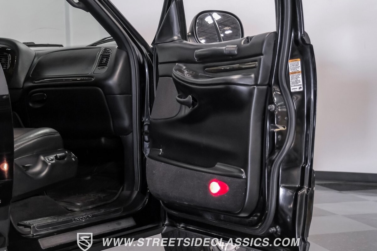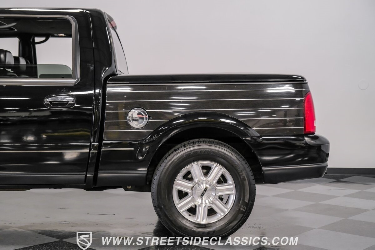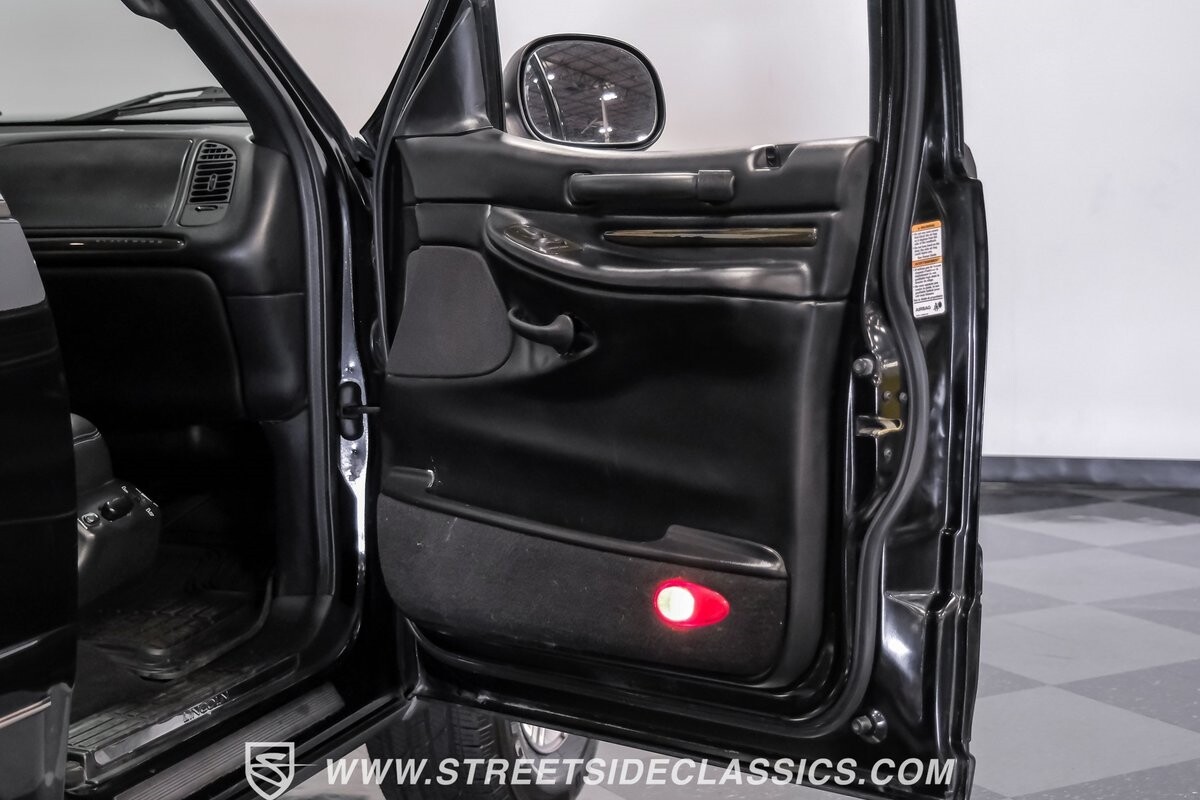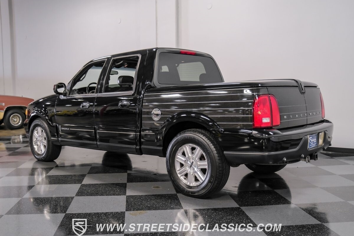 A vision in black, this 2002 Lincoln Blackwood is a rare jewel, mirroring the night sky. From its 18-inch wheels to the 265/70R18 tires, it stands bold and assertive. The black exterior remains largely true to its origins, with wood grain panels that add a touch of sophistication. The meticulous design extends to the functionality of the tailgate, which splits open like barn doors, revealing a bed covered that lifts to offer locked storage bins. Tinted windows and a chrome gas cap complement the overall look, crafting an appearance as functional as it is aesthetically pleasing.