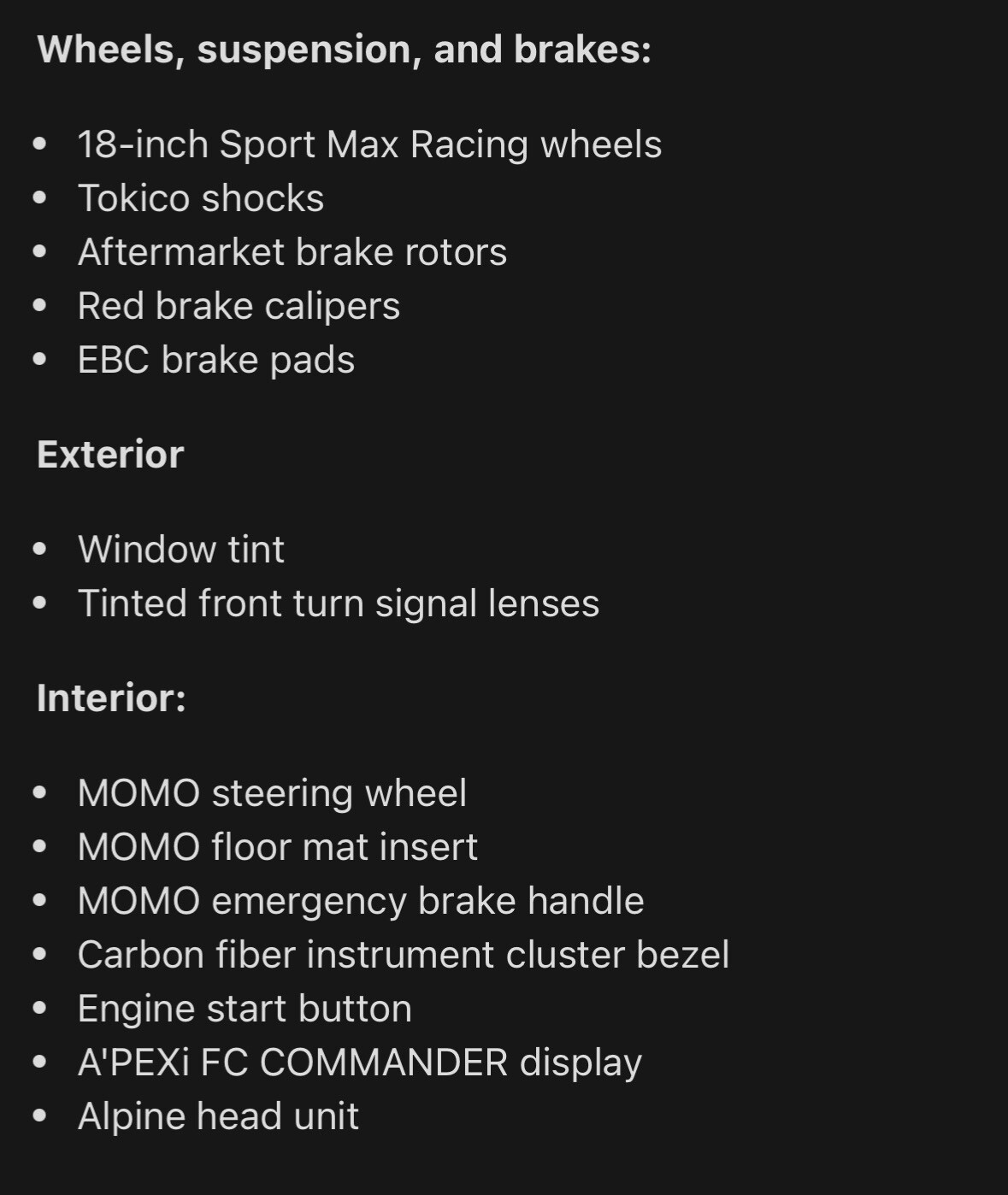 Under the hood, you'll find a potent 1.3L Twin Turbo R2 engine that delivers exhilarating performance with every push of the throttle. Paired with a responsive RWD drivetrain, this RX-7 offers a driving experience that is second to none, providing a perfect balance of power and agility that will satisfy even the most discerning enthusiasts.