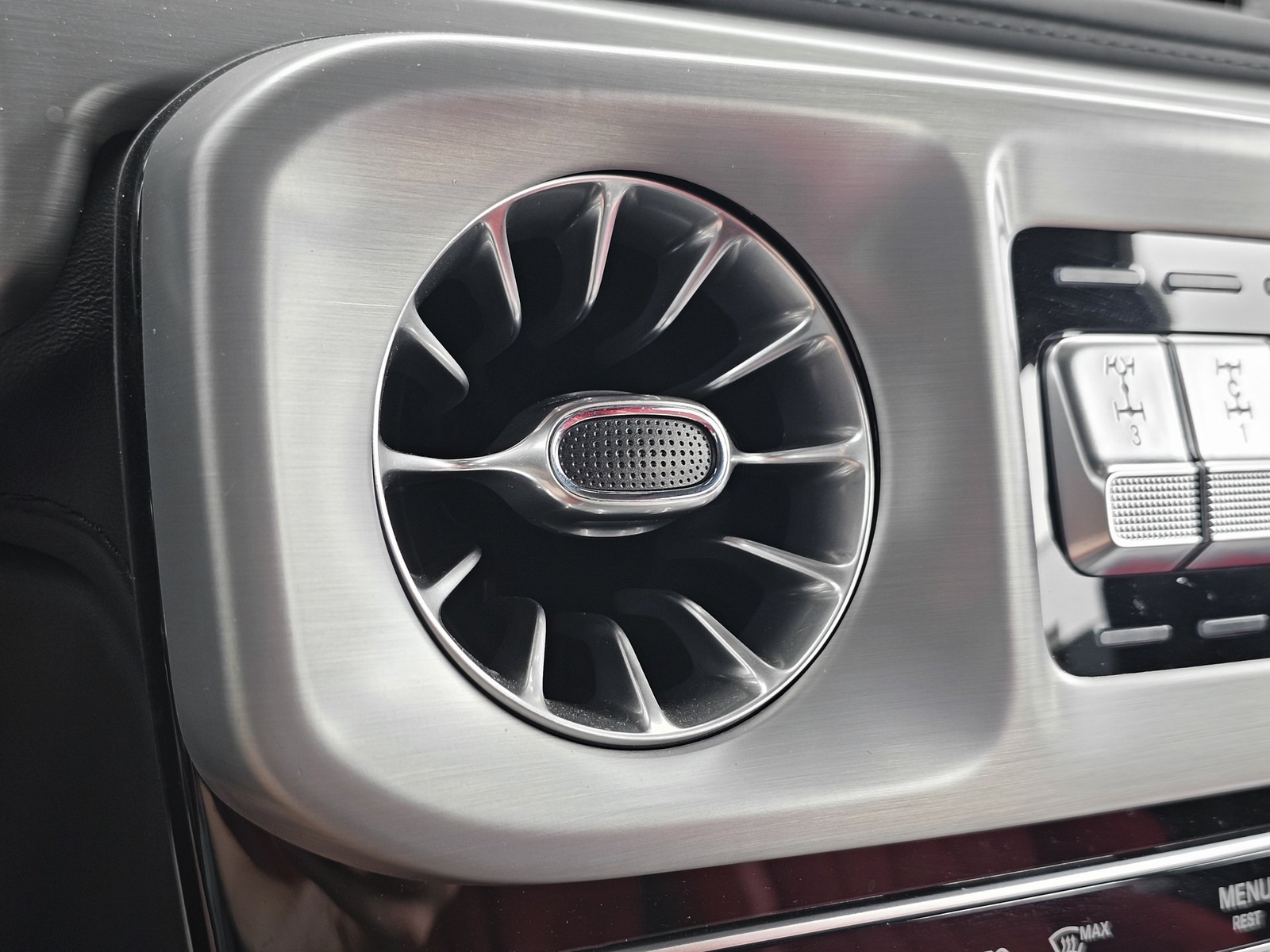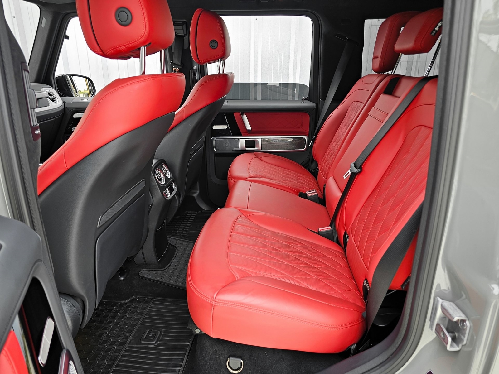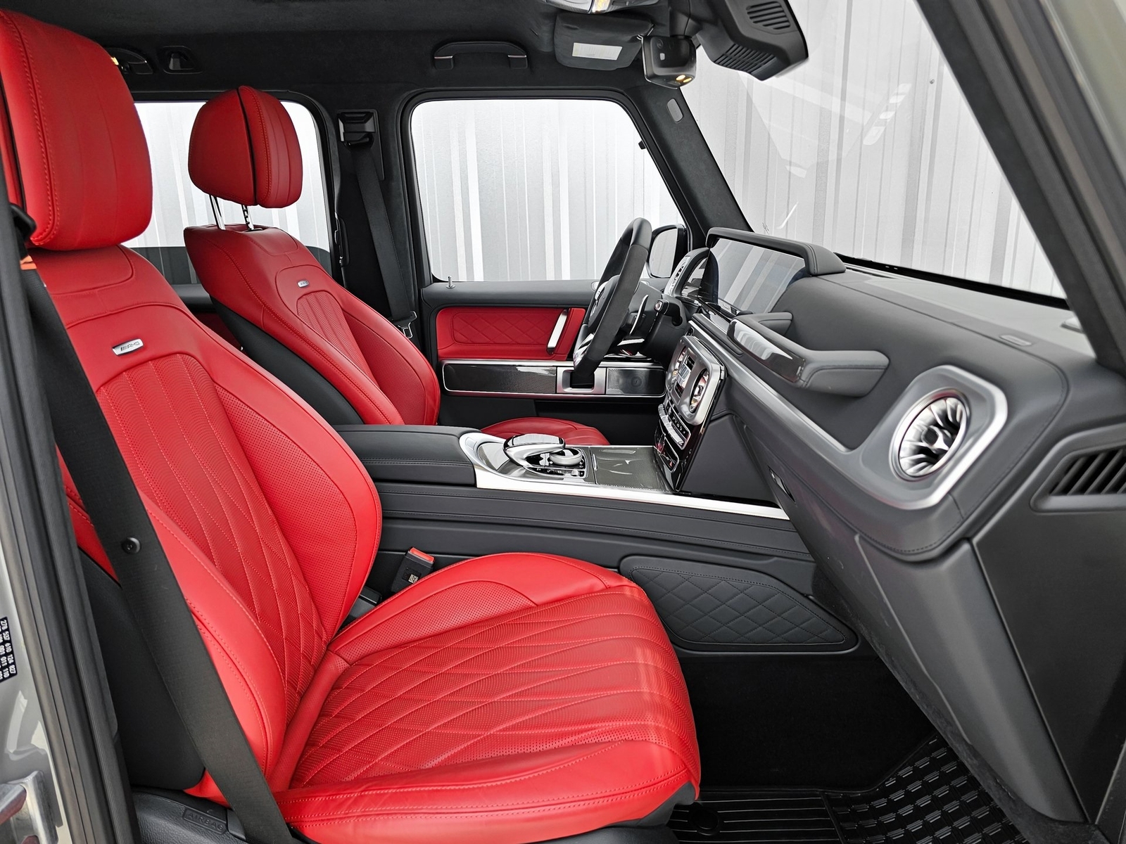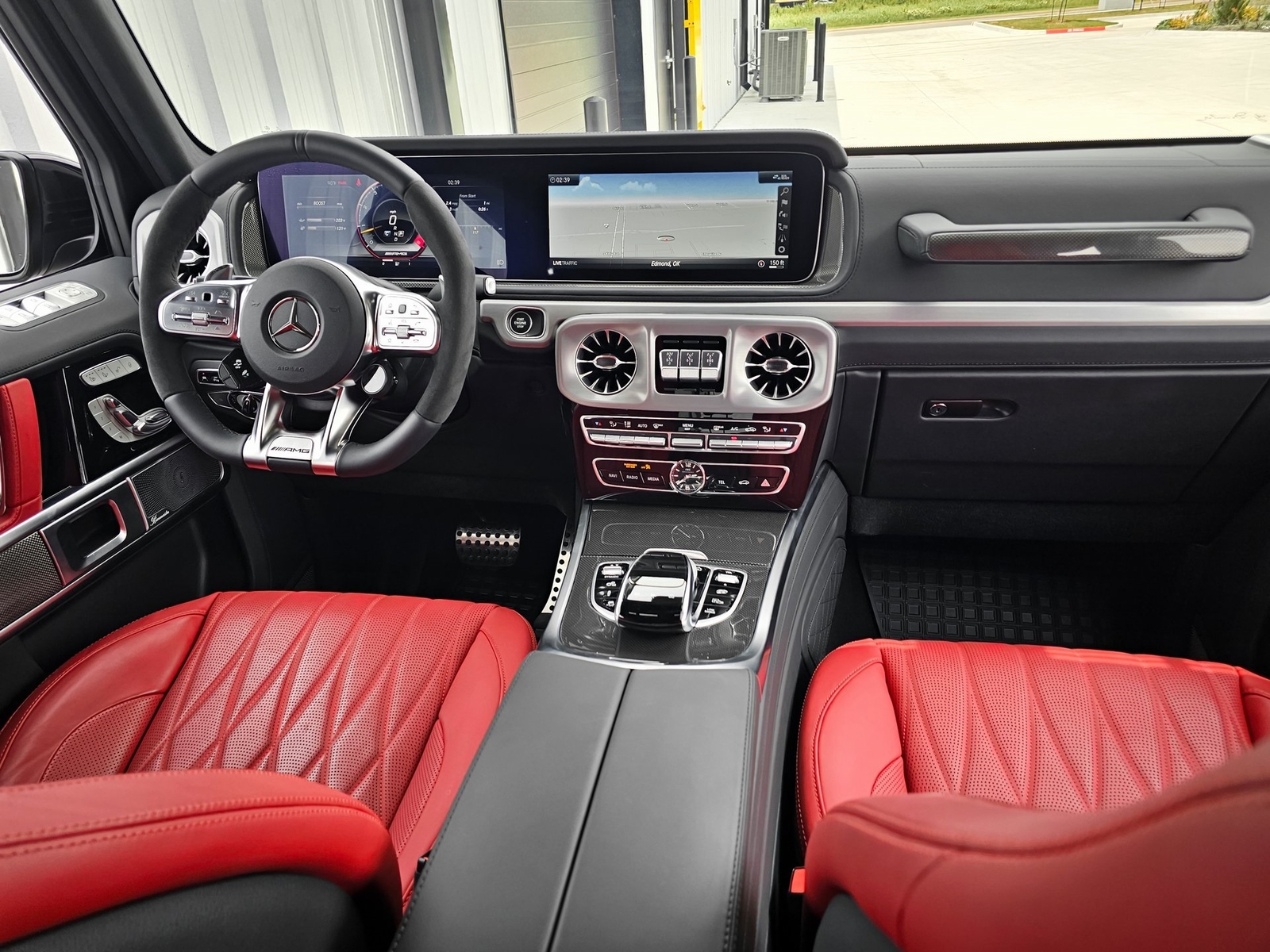 The 2023 G 63 AMG boasts a timeless, muscular design with its signature boxy shape, prominent grille, and AMG body styling. The bold exterior is complemented by 20-inch AMG wheels and striking LED lighting. Inside, youll find a meticulously crafted cabin featuring premium Nappa leather, carbon fiber accents, and cutting-edge technology. The spacious interior offers the perfect blend of comfort and functionality, with heated and ventilated seats, a Burmester surround sound system, and dual 12.3-inch displays for infotainment and driver information.