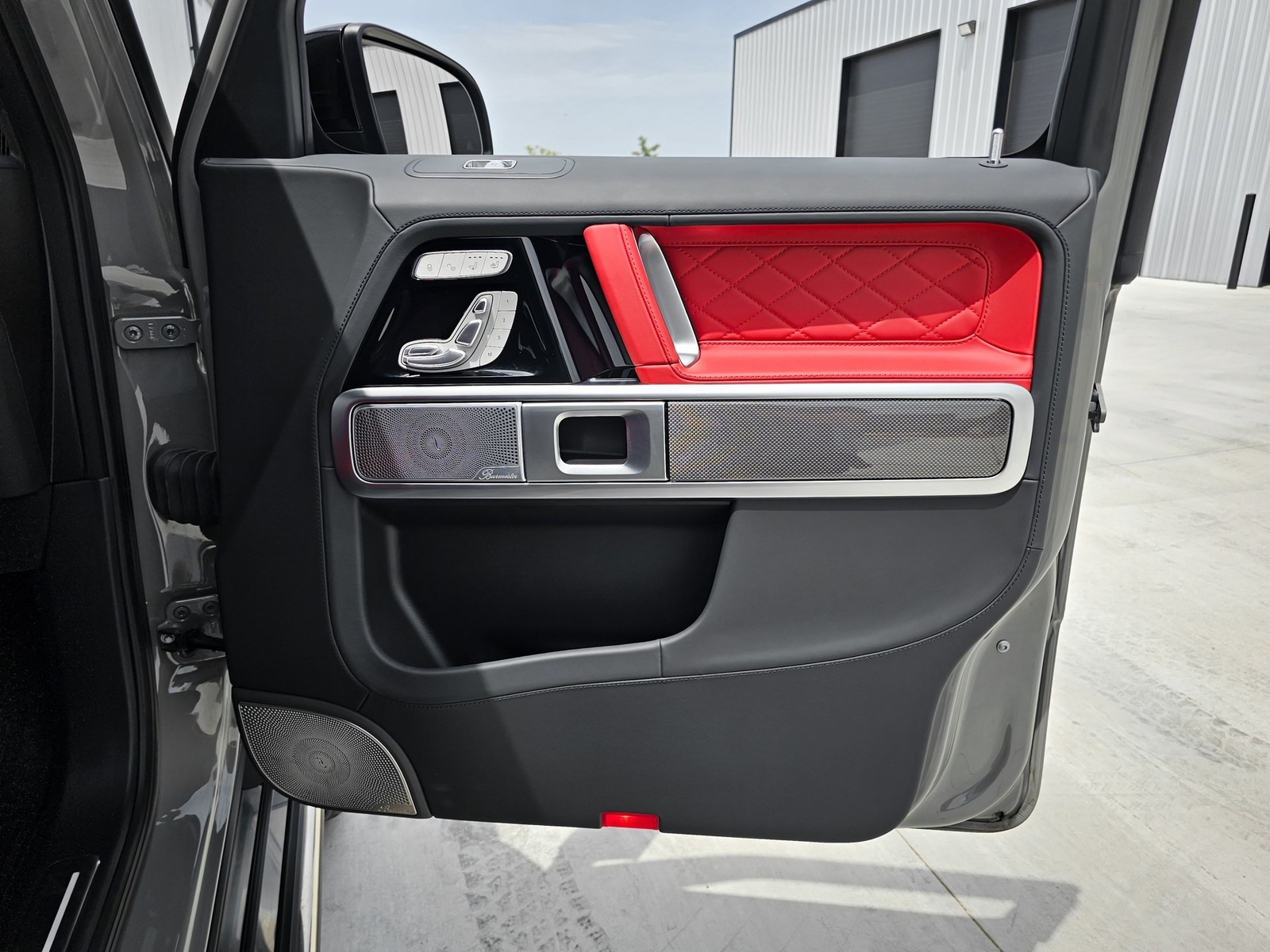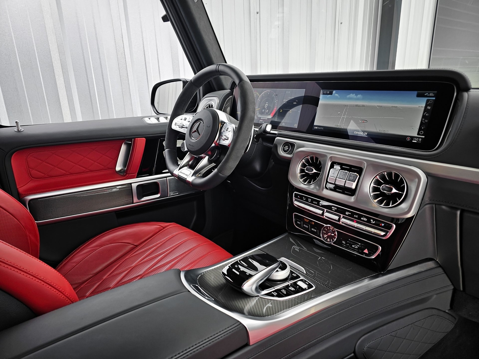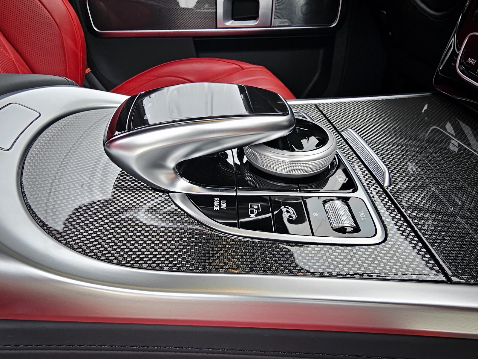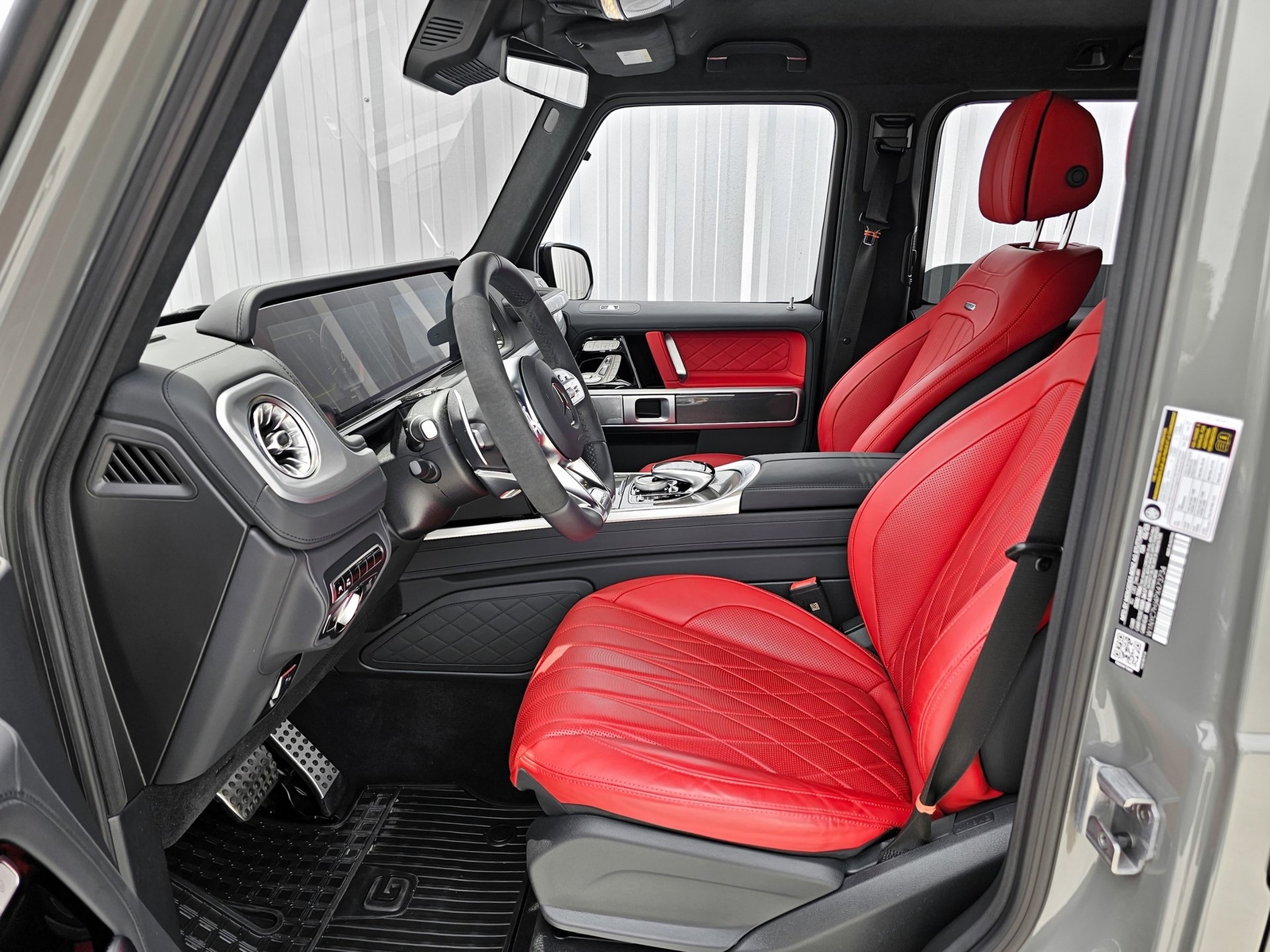 The 2023 G 63 AMG boasts a timeless, muscular design with its signature boxy shape, prominent grille, and AMG body styling. The bold exterior is complemented by 20-inch AMG wheels and striking LED lighting. Inside, youll find a meticulously crafted cabin featuring premium Nappa leather, carbon fiber accents, and cutting-edge technology. The spacious interior offers the perfect blend of comfort and functionality, with heated and ventilated seats, a Burmester surround sound system, and dual 12.3-inch displays for infotainment and driver information.