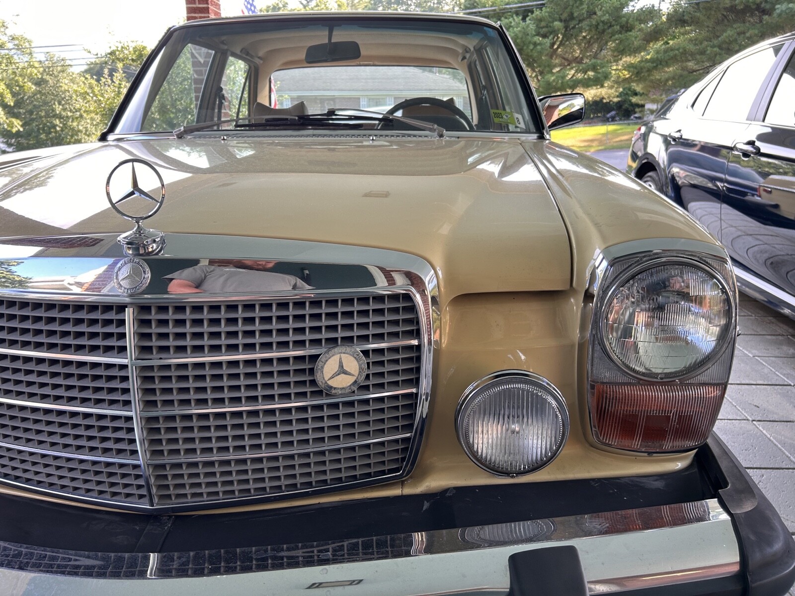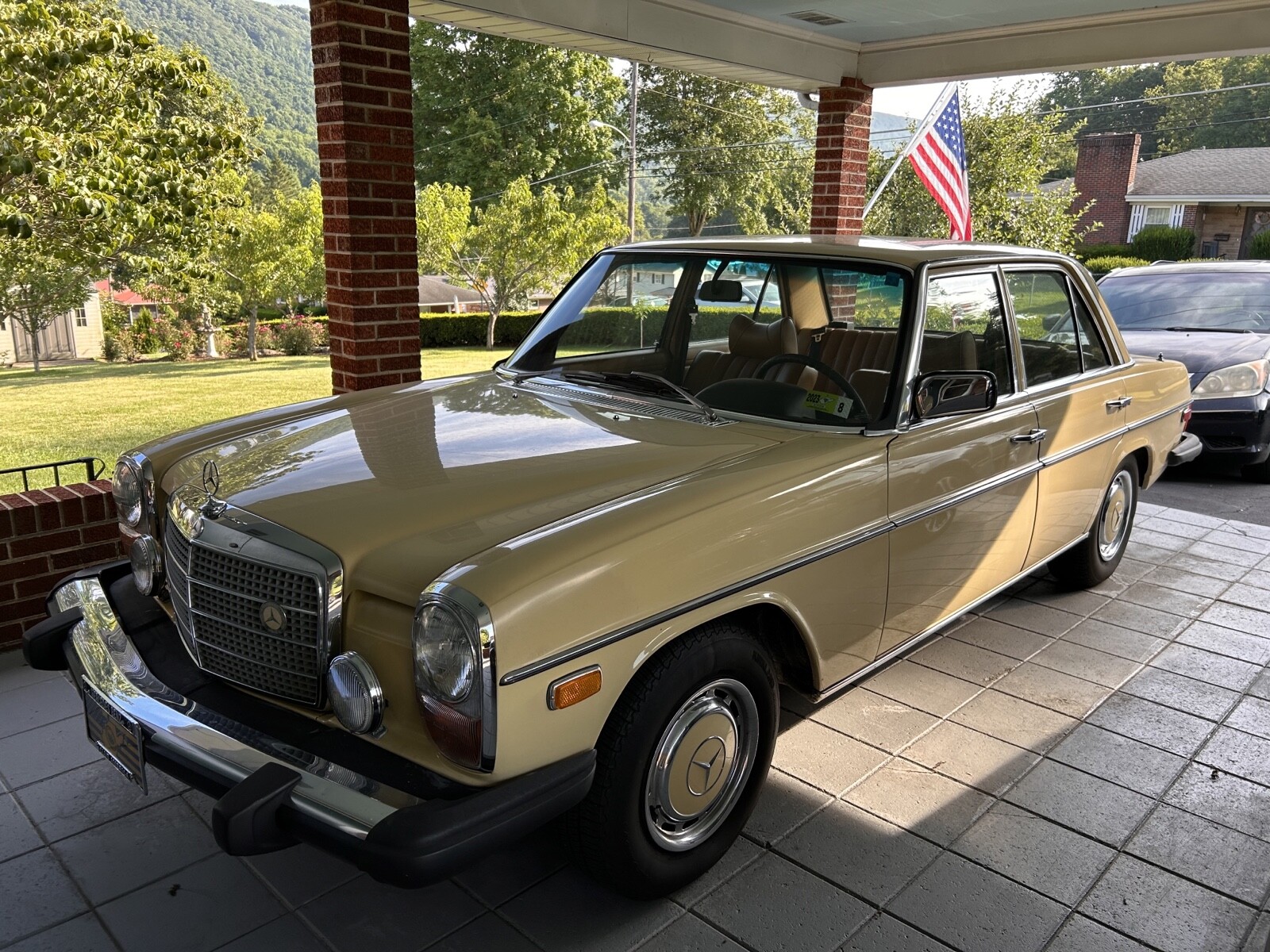 1975 w114 Mercedes 280 sedan in amazing original condition. Body has no rust with original maple yellow. Chrome is complete and looks new. Interior is beautiful in Bamboo Tex. Carpet and headliner near perfect. Two inch crack on dash and front speaker cover needs replacing. Two inch tear in back seat. Drivers door pocket is missing, but I have a replacement. Only 50,000 miles on odometer and car reflects that low mileage. Engine runs good; automatic transmission is strong. New tires, refurbished brakes, new starter, newly greased wheel bearings and axle grease. Car has new inspection sticker and runs good. Blower works good. My mechanic could not get air conditioner to work even though he replaced everything except the control knob. Everything works well except what I’ve mentioned. Would take very little to restore this pretty car. If interested text me at +1(304)960-1189