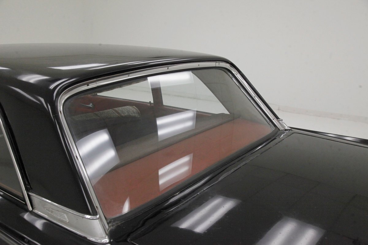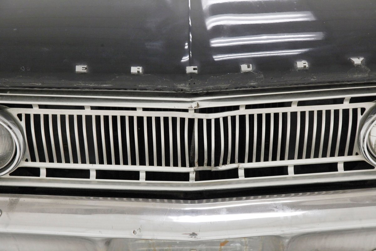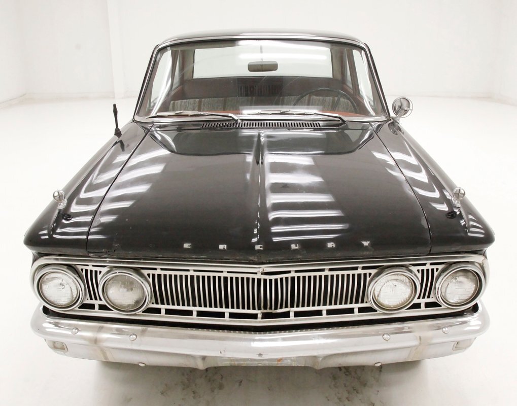 What could possibly be the original Presidential Black paint, we note some dull spotting in the finish along with chip offs, crazing and a few small areas of rust bubbling reserved for the lowers, but again these areas are small. Overall things remain amazingly original with good condition straight steel, all minding their gaps, and staying in line. Opening and closing the doors, this car literally has the Mercedes thud, with no after closing vibrating jiggle sounds, just a cold hard thud...which speaks to fit and finish on this 61 year old car. Noted is a nicely placed chrome trim spear going from fore to aft at the belt line and it attracts attention at just the right places for one's eye to follow the early 1960's line of this car. Plenty of other chromed trim work around all windows and drip moldings as well as highlighting the B pillar add some dress up. The grille sports a pattern that reminds us of an electric shaver and is flanked by dual headlights and some front fender toppings looking like mini fins. Standard turbine style dog dish wheel covers are wrapped by thin whites in 13-inch format, with good tread showing on all. In keeping up the traditional Mercury look the rear shows the "Dixie Cup" taillights and just minor fins protruding above on the rear quarters.