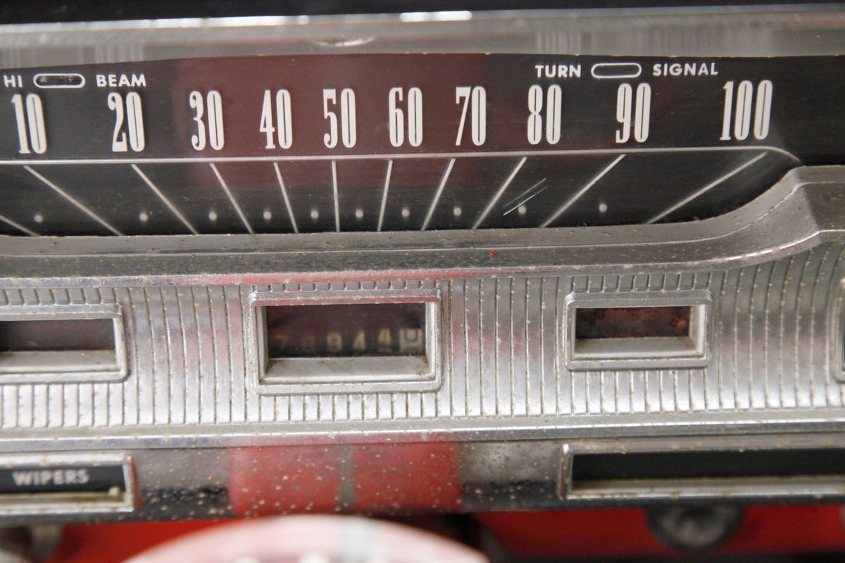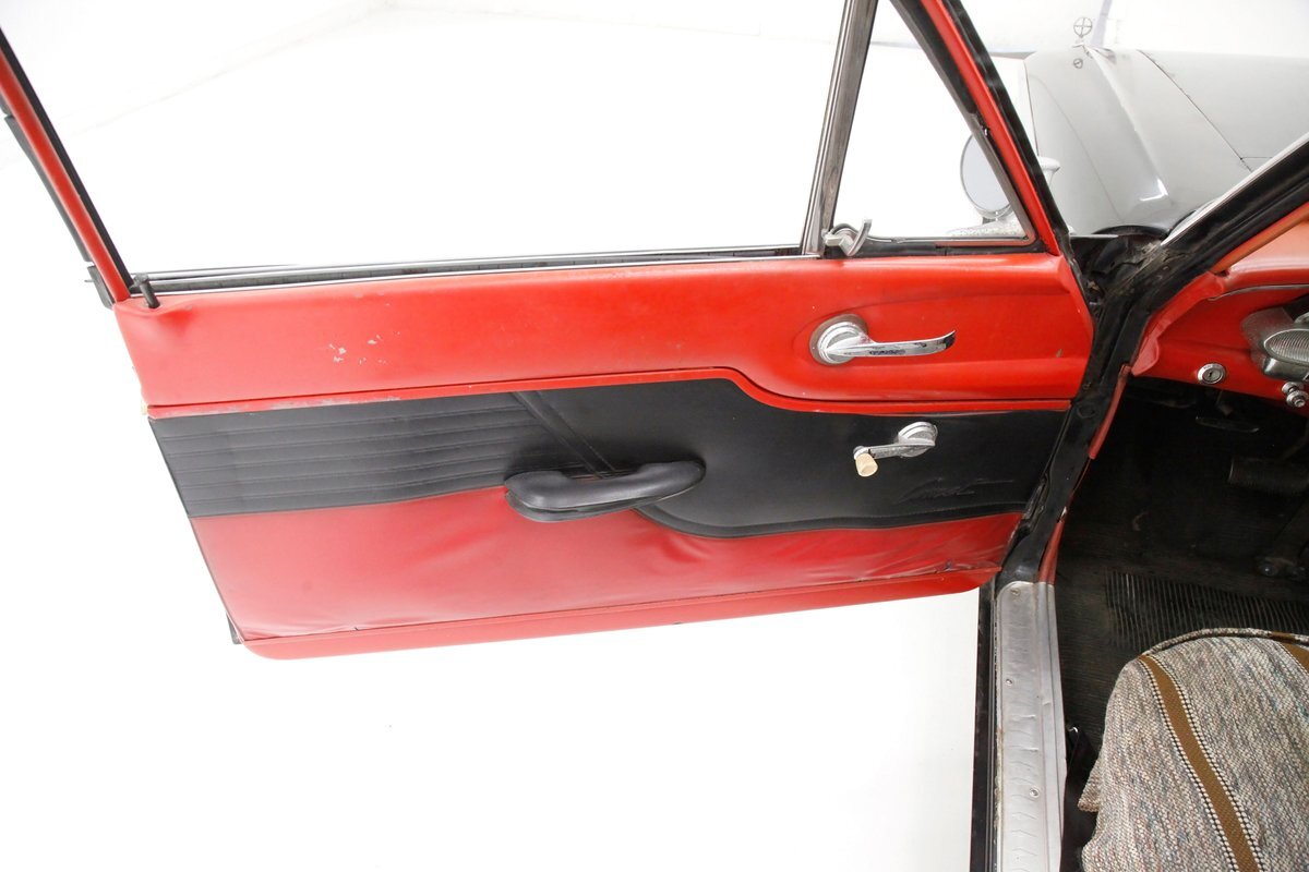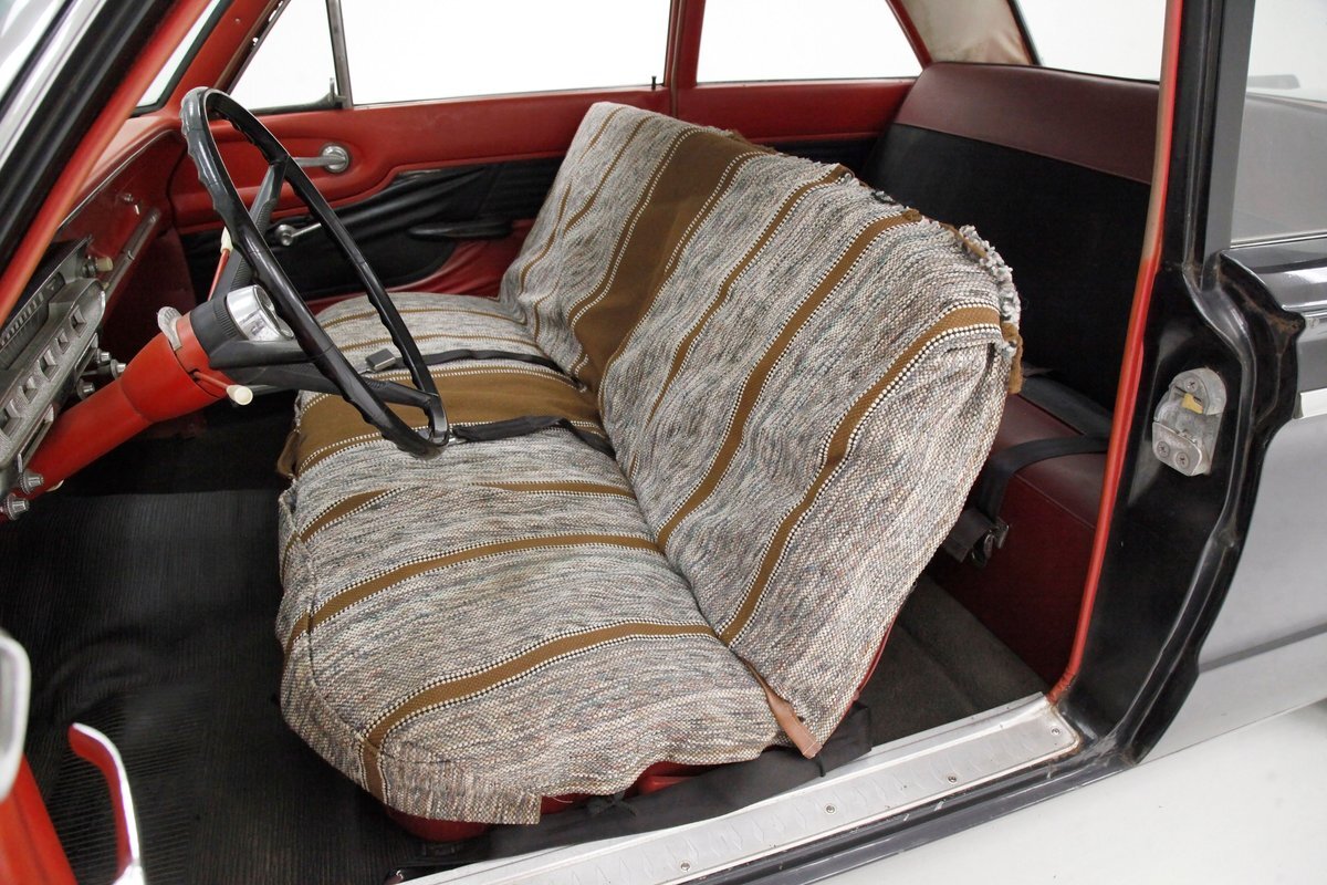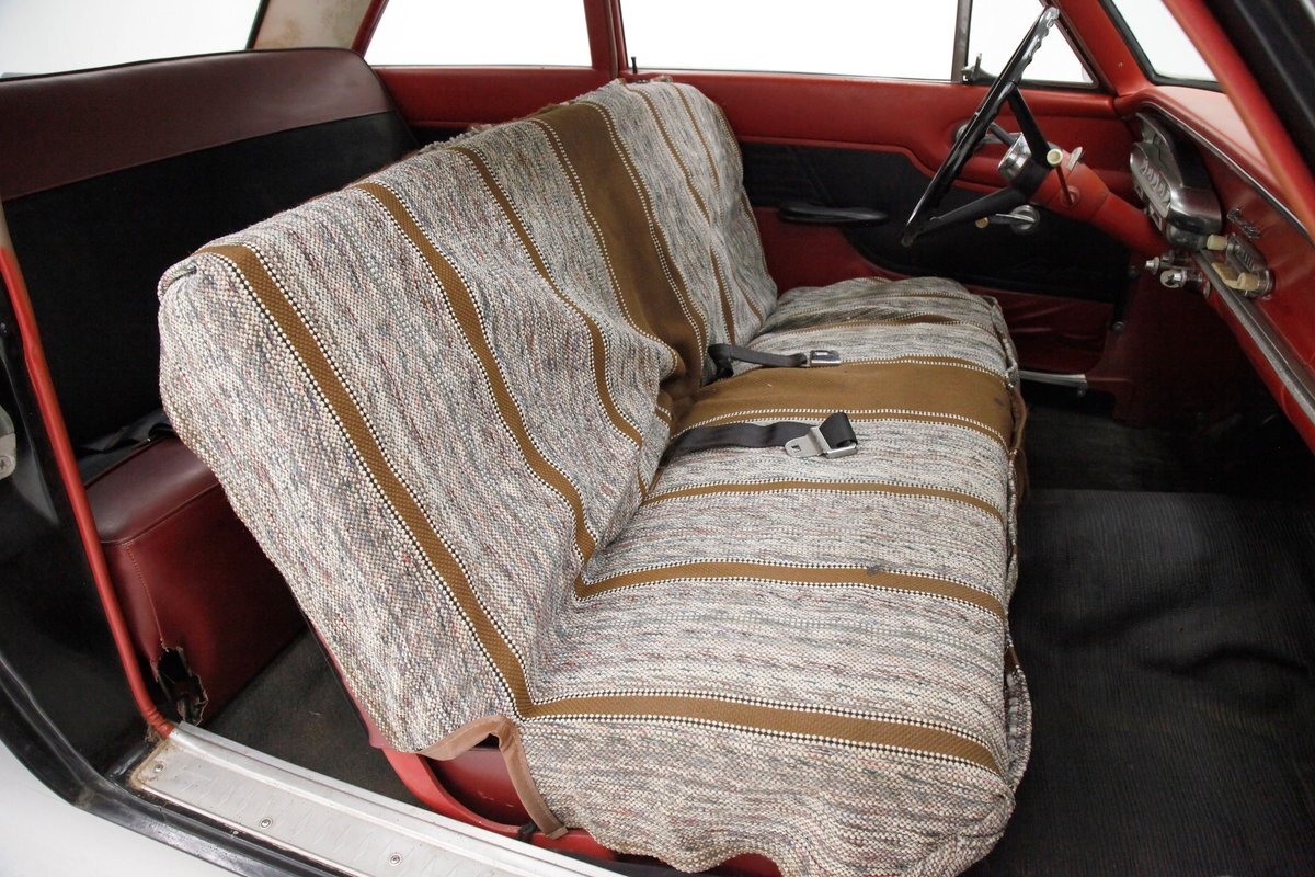 A swing of the doors and we can see the original door panels in red and black, and the vinyl has damage as well as the interior door pulls. The front split bench seat is covered, and it is assumed to be original underneath, but may have damaged covers, however they are in red and black, matching the door panels. The dash is original and shows some corrosion and damage on trim work. A large black plastic wheel fronts the chrome and silver trimmed gauge cluster and in the center of the dash is a Comet badge and the original AM radio. A band of bakelite knobs and pulls dress the bottom of the dash and black ribbed rubber flooring floats this Jet-Age interior. Above, the headliner is sagged and shows with a water staining in areas of the white vinyl.
