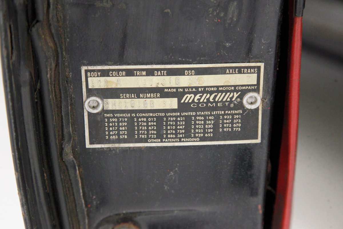 Not the most powerful optioned Comet in the offerings of 1962, but certainly a respectable grocery getter that remains in very original condition save for some replacement floor pans and toe boards. Recently removed from its slumber that started in 1998, this car is ready, willing, and able to serve you well, but is in need of a little TLC. A difficult at best car to find in this condition, and for some nostalgia, the build sheet is included, the keys were set on the cowl during its storage and have left their imprint in the paint, and it has unbelievably low 76,944 miles, however we cannot verify them as actual. From its bat-mobile-esque small tail fins, to its rocket cone like rear stop lights, lets usher in the very beginnings of the jet age, in style..."put some records on while I pour".