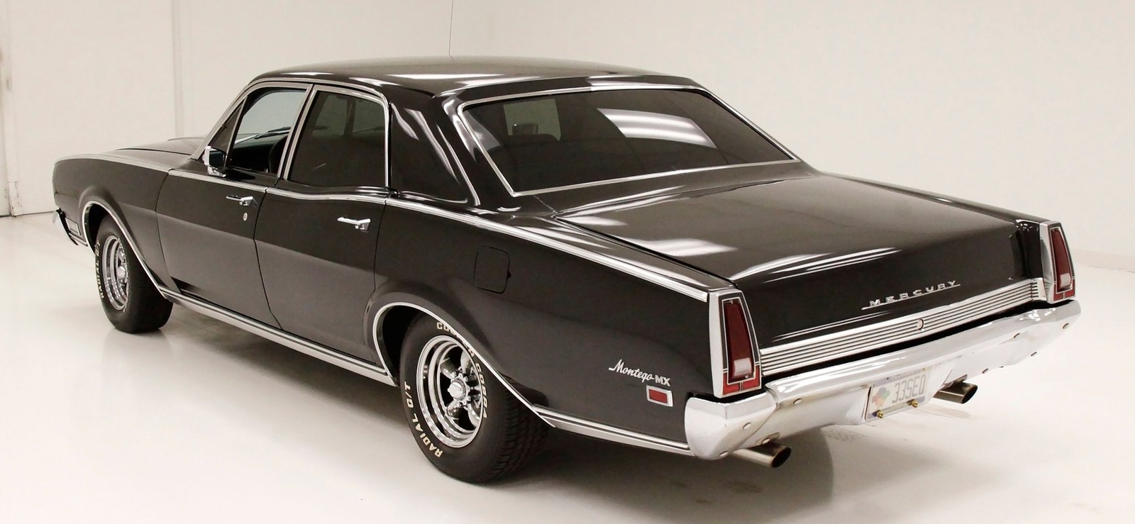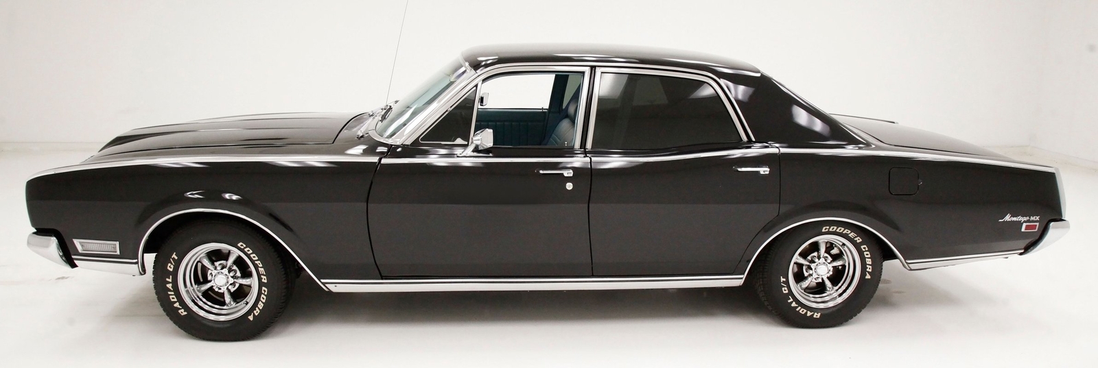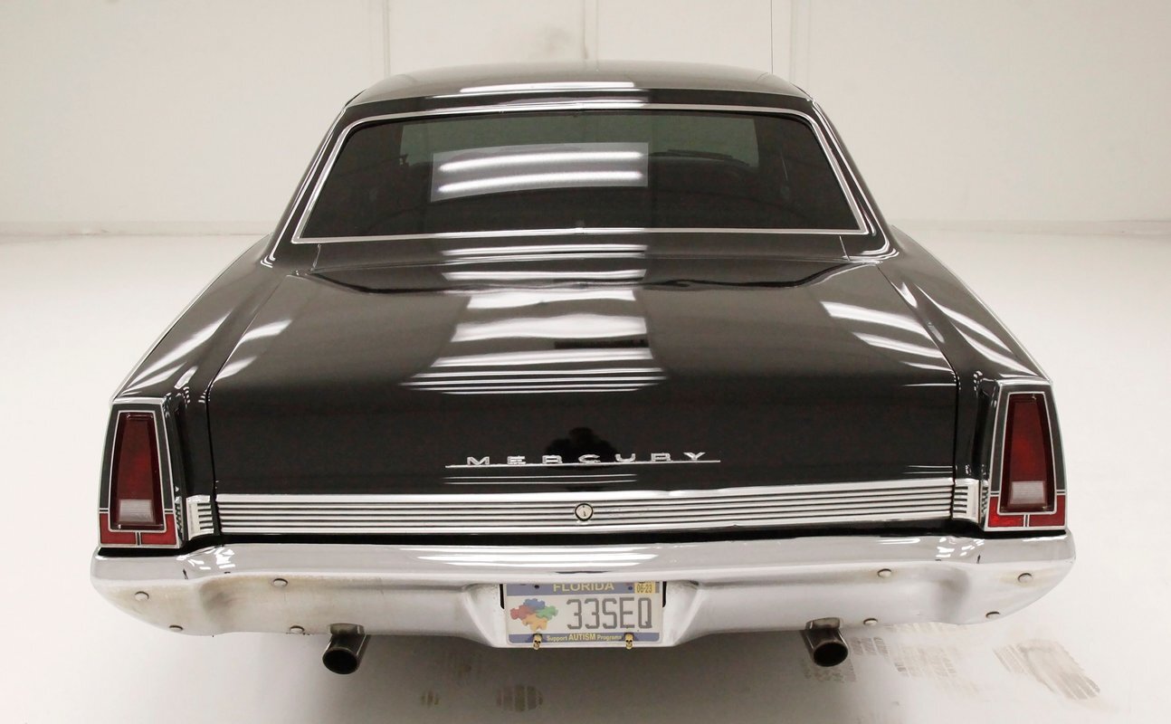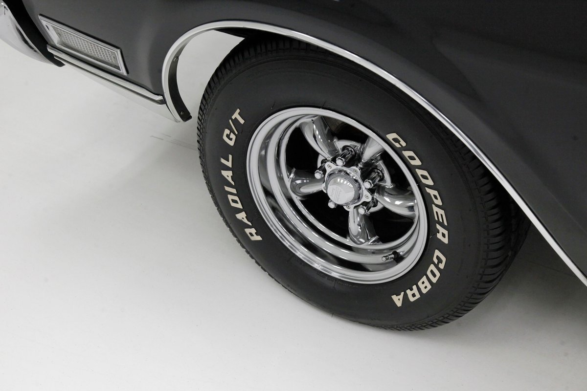 Plenty of shiny trimmings for this 69 Merc, especially upfront where the grill is the first to gleam and show up. It undulates inward and outward, and has dual headlights in each front corner. The center is a bump out grouping the open egg crate grille backgrounds in horizontal frame sections and a framed central horizontal badge. A matching shape bumper is below, and all presents in you'll need your sunglasses condition. A long hood sits within the front quarters and gaps are all well minded between the two. A Mercury badge is in the hood's driver's front corner. Chrome, chrome, and more chrome trimming tops of the quarters and running to the back of the car entirely along the sill line undulating with the shape of the car. Thinner chrome trimmings are with the edges of the wheel wells and a nice chromed wide rocker covering is on the bottom. The windows are all surrounded and have black tinted glass within these frames. The roofline is nice and straight with wide B-pillars diving towards the trunk. On the back, rear quarters end in a squared off design. Squared off triangular tail lighting frames either corner on back and these are kept together visually with a horizontal ribbed trimming running across the trunkline and a matching shaped shiny bumper below. Wide dual exhaust peek out of the bottom below this bumper. The paint is all very nicely applied and is smooth as silk with little to no inclusions or scratches. Pure black! Shiny 14-inch American Racing Torque Thrust 5 spoke wheels are wrapped in 225/70R14's all around sporting Cooper Cobra Radial G/T type in raised white letters.