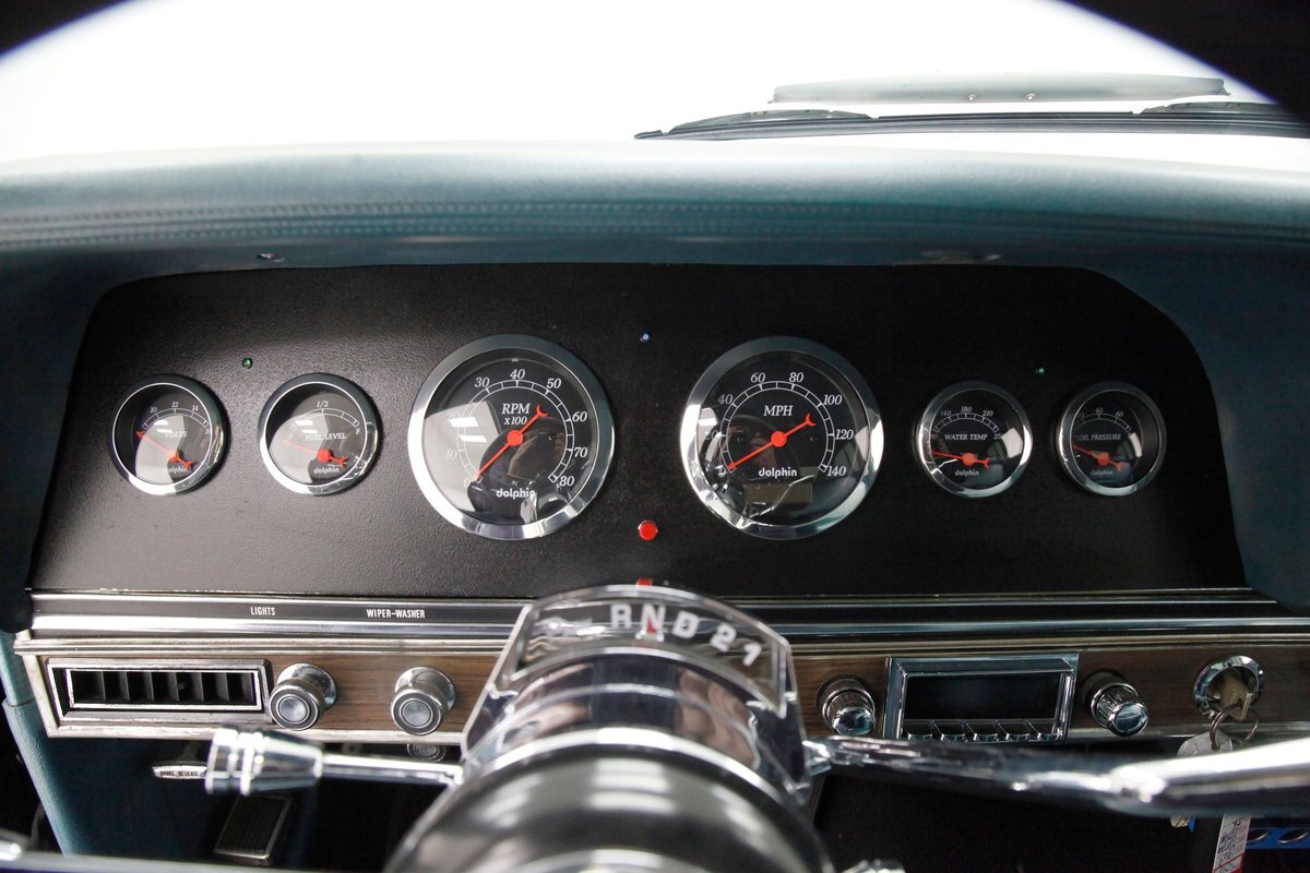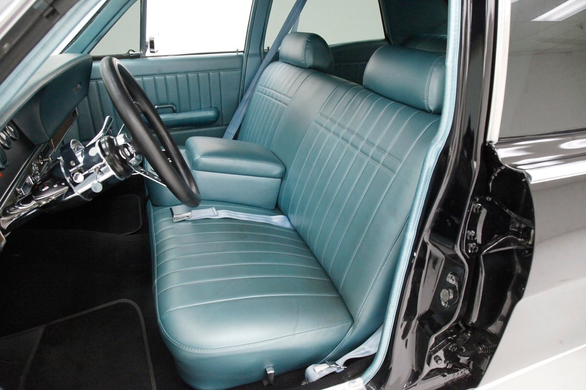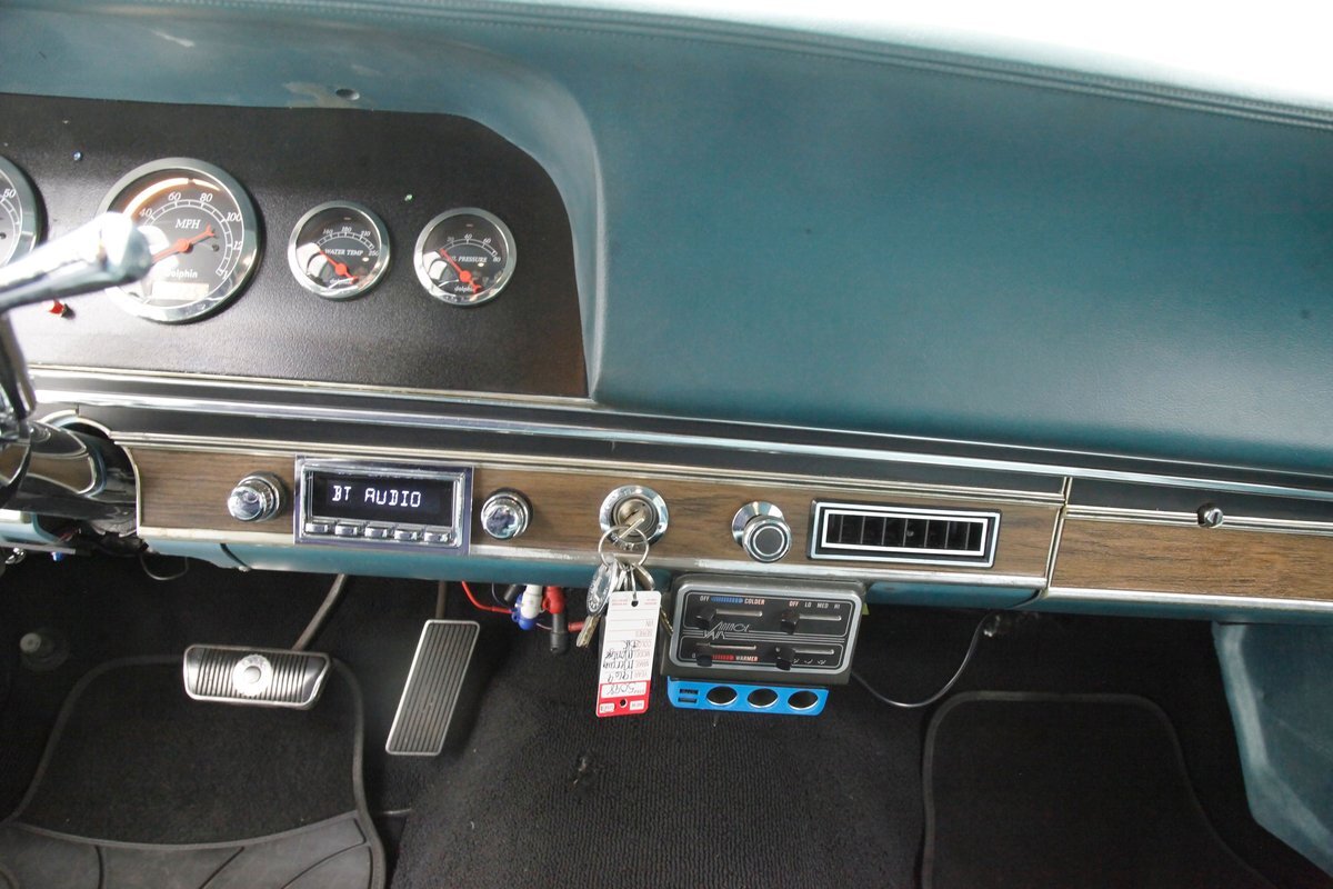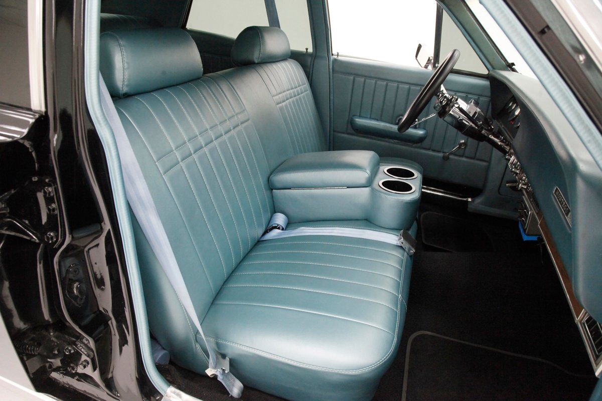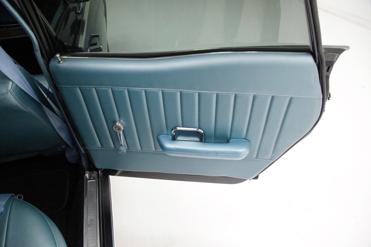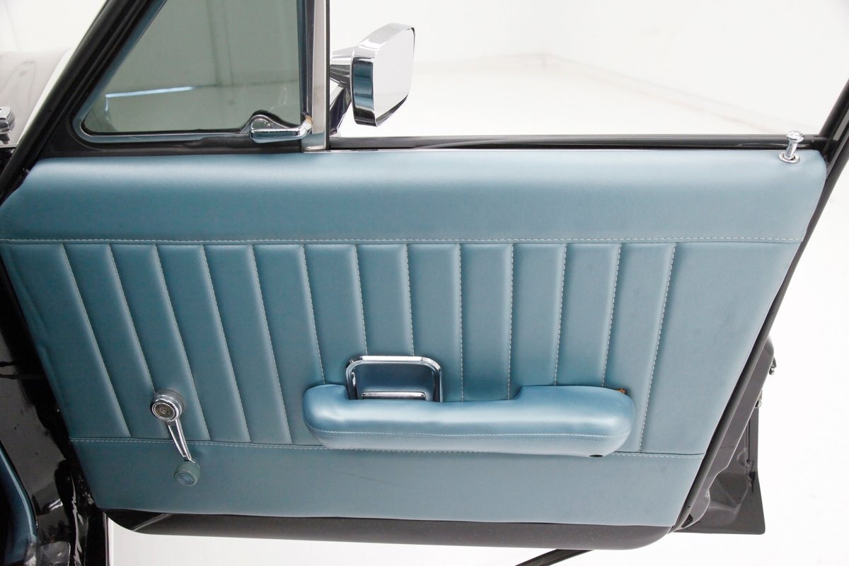 In contrast to the exterior black, I swing one of the 4 doors and they reveal fully restored aqua vinyl door panels. These have smooth sills and lowers and some vertical stitched tuck and roll panels are gracing the center. Factory actuators, handles, armrests, and cranks are in this field. Slipping inside, I perch myself on a long solid fixed back bench with a central armrest/dual cup holder that resides in the center. This bench is in excellent condition, like new, and is also in aqua not unlike the doors. In back is another full on bench also excellent and also in aqua. In front, a fully customized dash is now installed. It sports a lineup of chrome bezel black face and white letters Dolphin gauges in the round. These are in a nice flat black dash front field. In front is a drilled chromed 3 spoke rally padded steering wheel mounted atop a polished column. The aqua takes over on top in the form of padded dash topping and some of which dives downward after the instruments to make a padded dash form for the middle and passenger side. Just below is a horizontal wood applique panel that houses a modern digital radio, some extra knobs and pulls and ignition with some horizontal air vents. Just below the dash is a Vintage Air/heater control box and panel. Black carpeting is covering the floors and is very nice. Above is a nice and tight darker blue headliner.