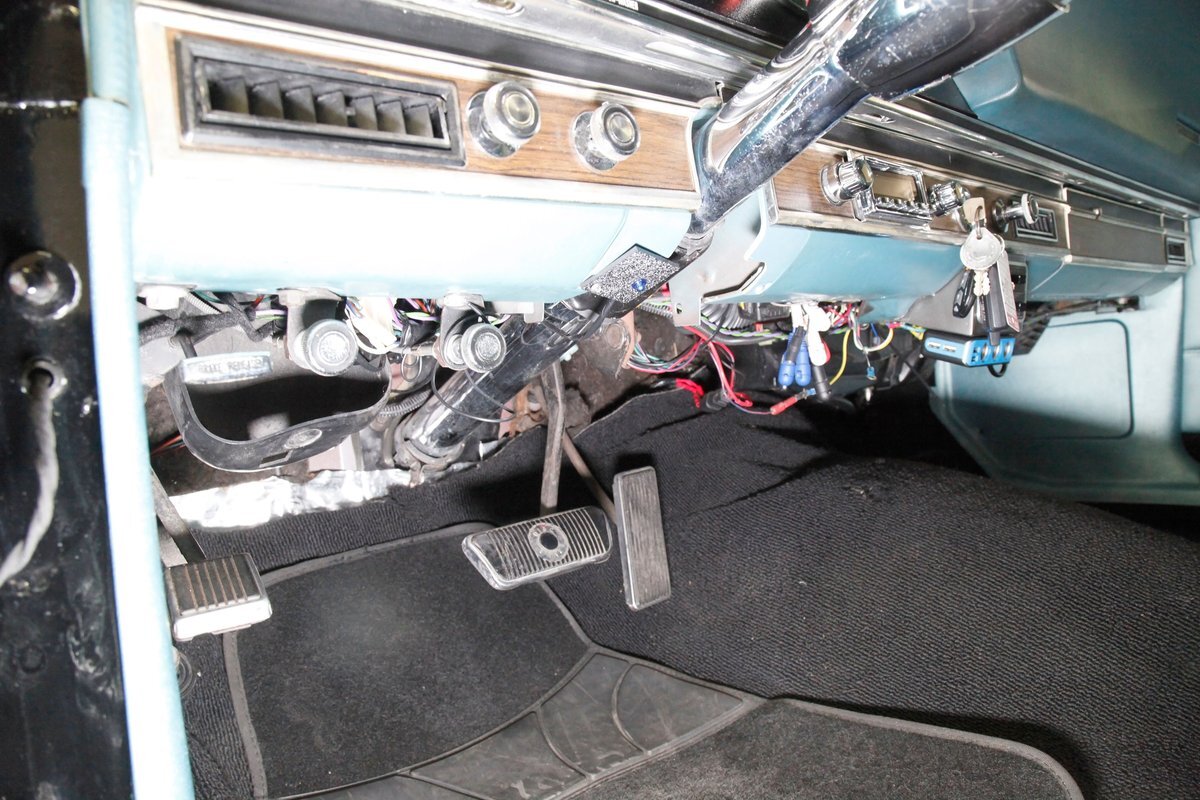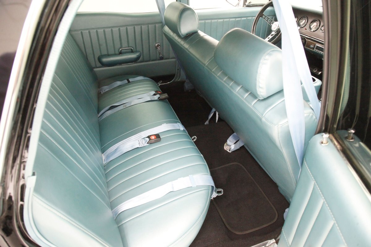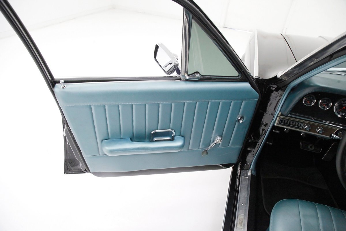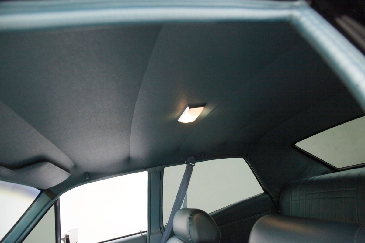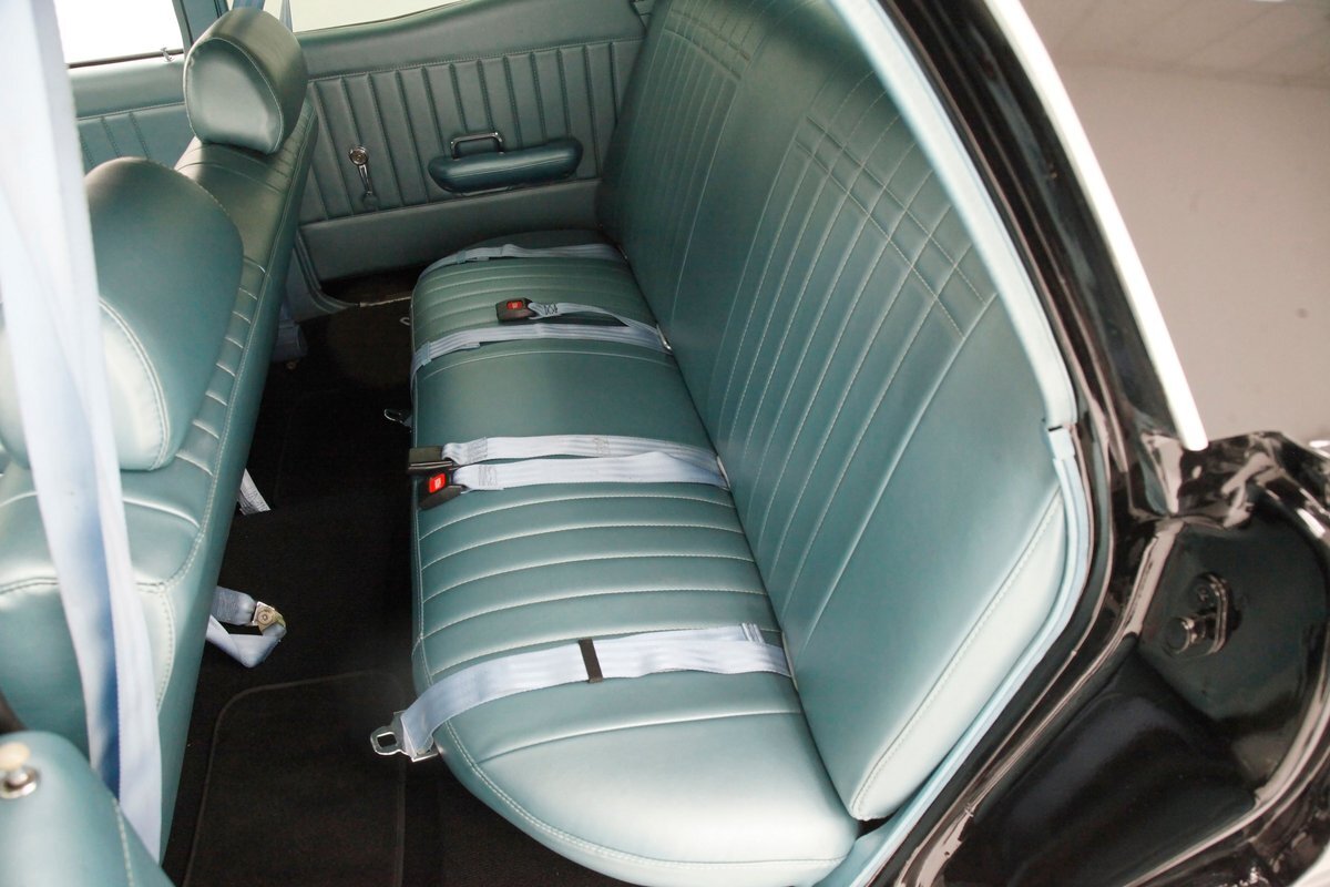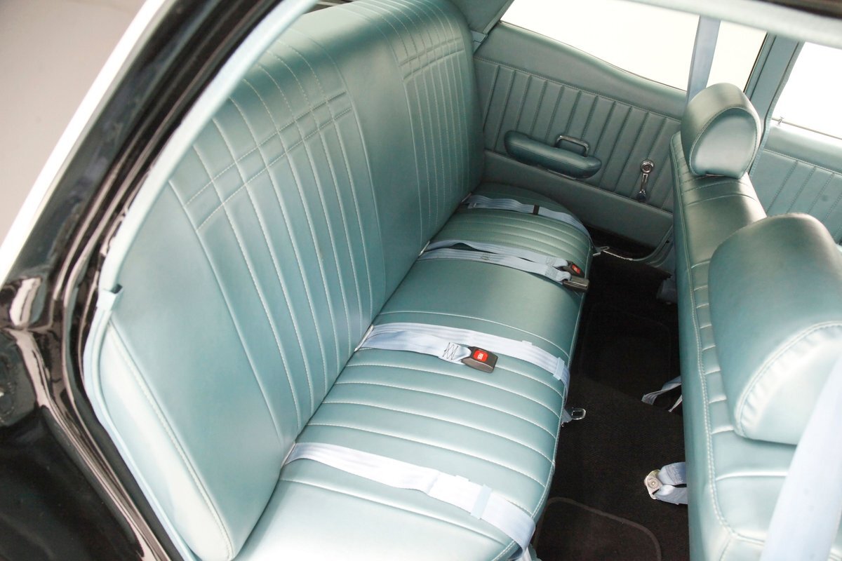 In contrast to the exterior black, I swing one of the 4 doors and they reveal fully restored aqua vinyl door panels. These have smooth sills and lowers and some vertical stitched tuck and roll panels are gracing the center. Factory actuators, handles, armrests, and cranks are in this field. Slipping inside, I perch myself on a long solid fixed back bench with a central armrest/dual cup holder that resides in the center. This bench is in excellent condition, like new, and is also in aqua not unlike the doors. In back is another full on bench also excellent and also in aqua. In front, a fully customized dash is now installed. It sports a lineup of chrome bezel black face and white letters Dolphin gauges in the round. These are in a nice flat black dash front field. In front is a drilled chromed 3 spoke rally padded steering wheel mounted atop a polished column. The aqua takes over on top in the form of padded dash topping and some of which dives downward after the instruments to make a padded dash form for the middle and passenger side. Just below is a horizontal wood applique panel that houses a modern digital radio, some extra knobs and pulls and ignition with some horizontal air vents. Just below the dash is a Vintage Air/heater control box and panel. Black carpeting is covering the floors and is very nice. Above is a nice and tight darker blue headliner.