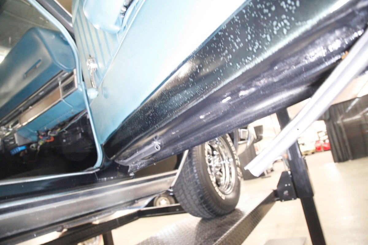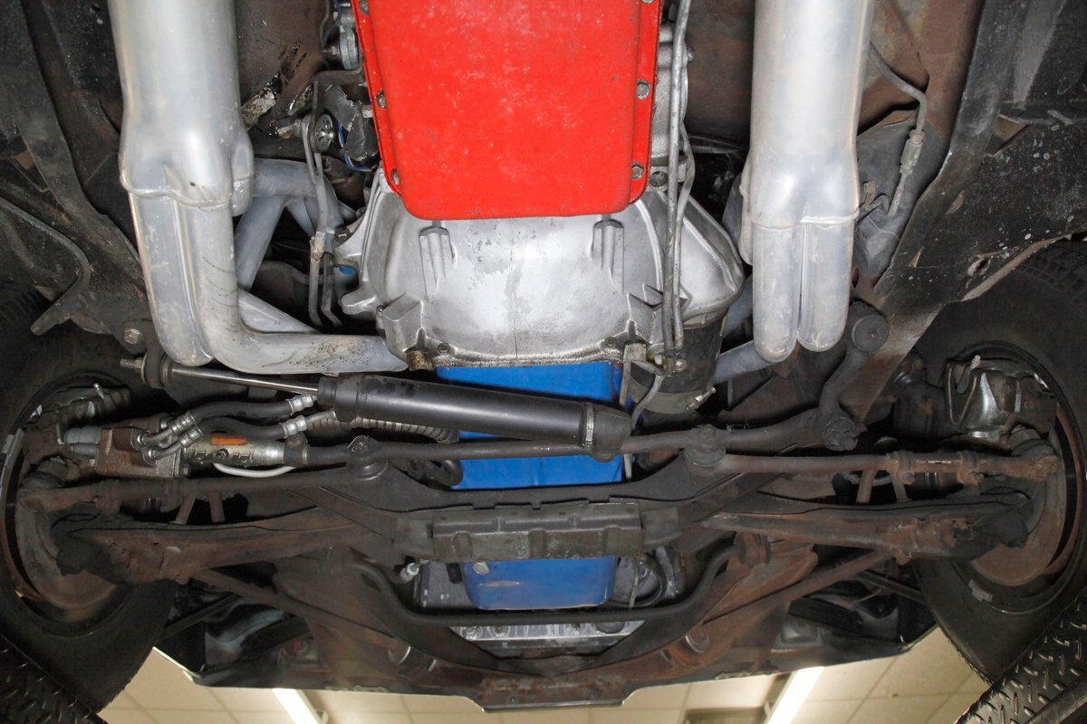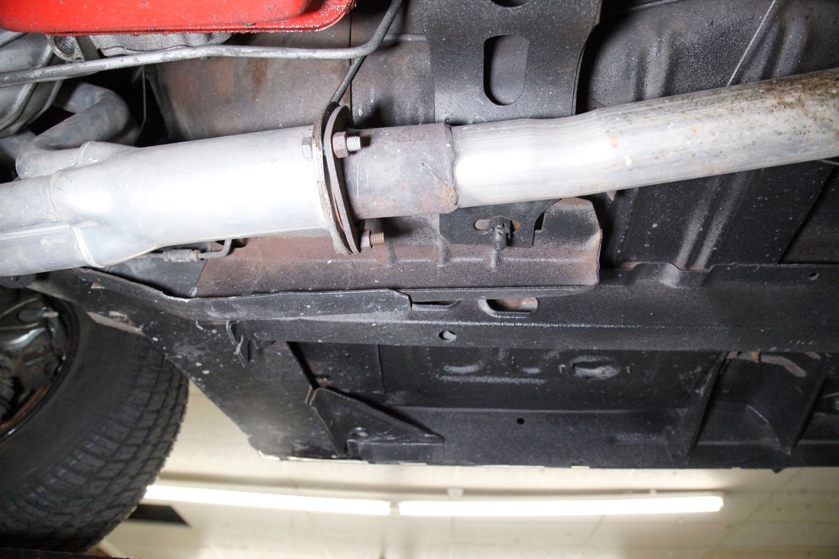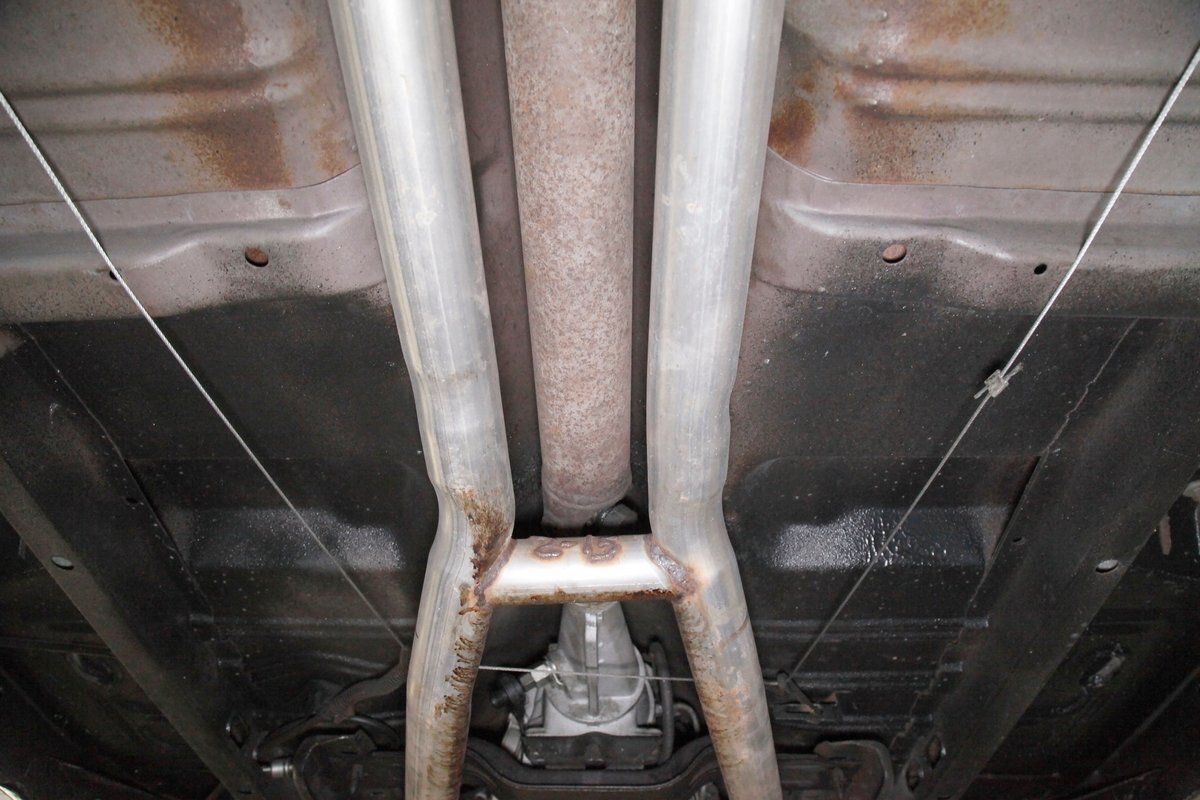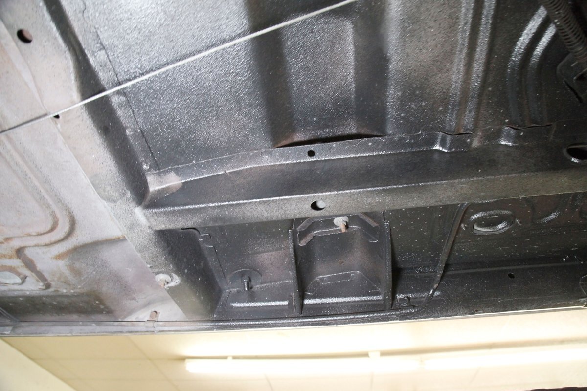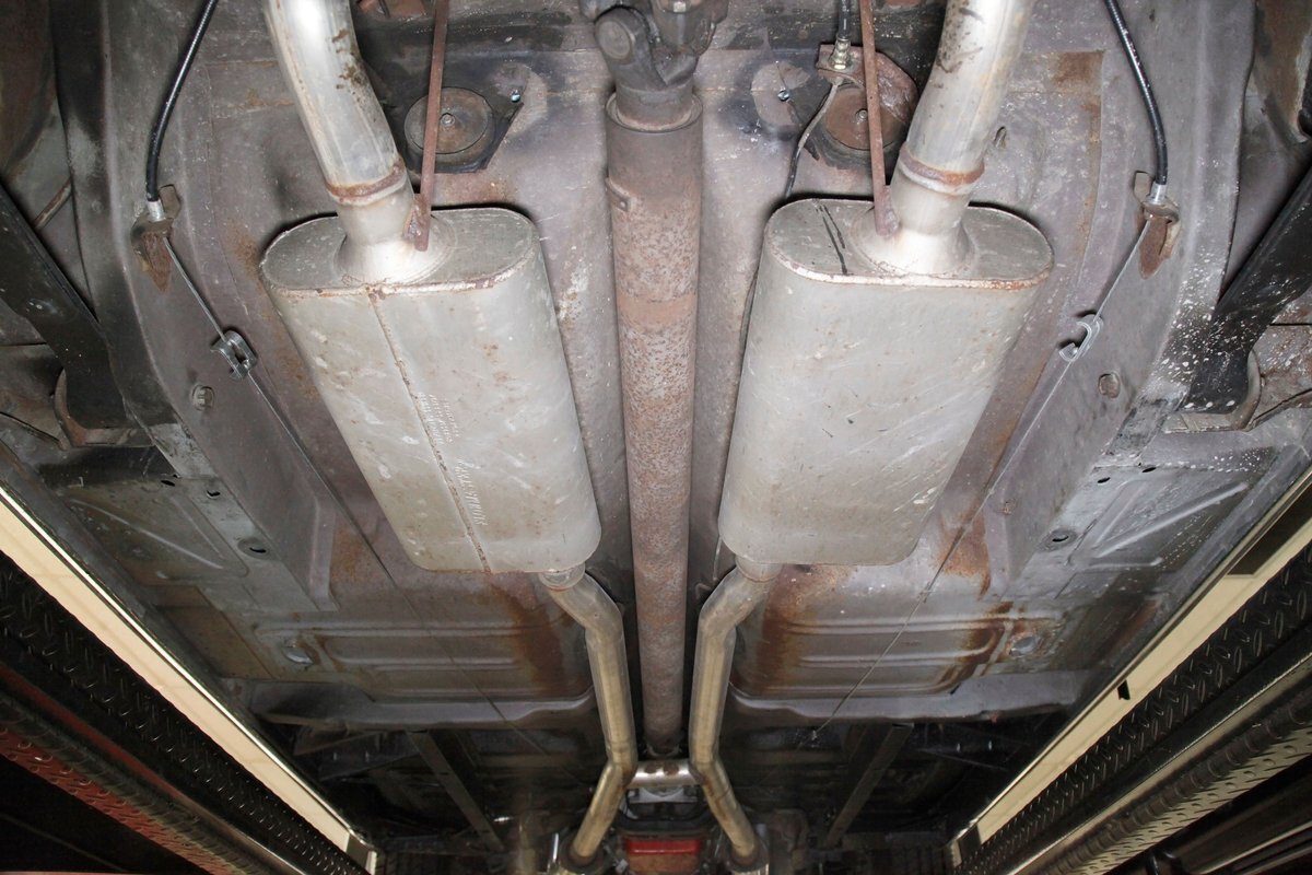 A bit of very light surface rust pan the floor pans and inner fenders but certainly structurally sound. We see dual exhaust making its way rearward, independent coil springs suspension in front, and leaf springs for the back. Power disc braking is on all 4 corners and new shocks have been added to this very clean environment underneath.