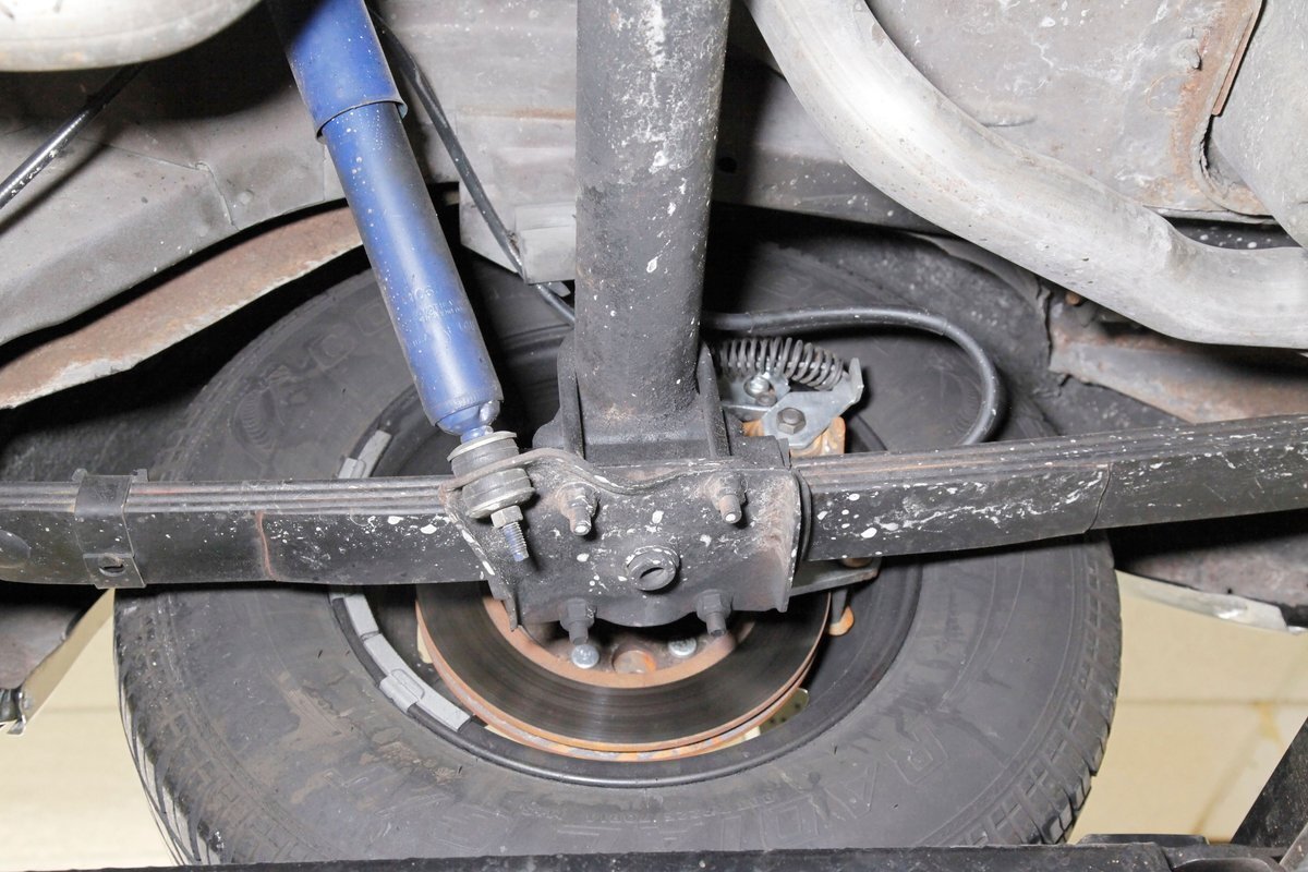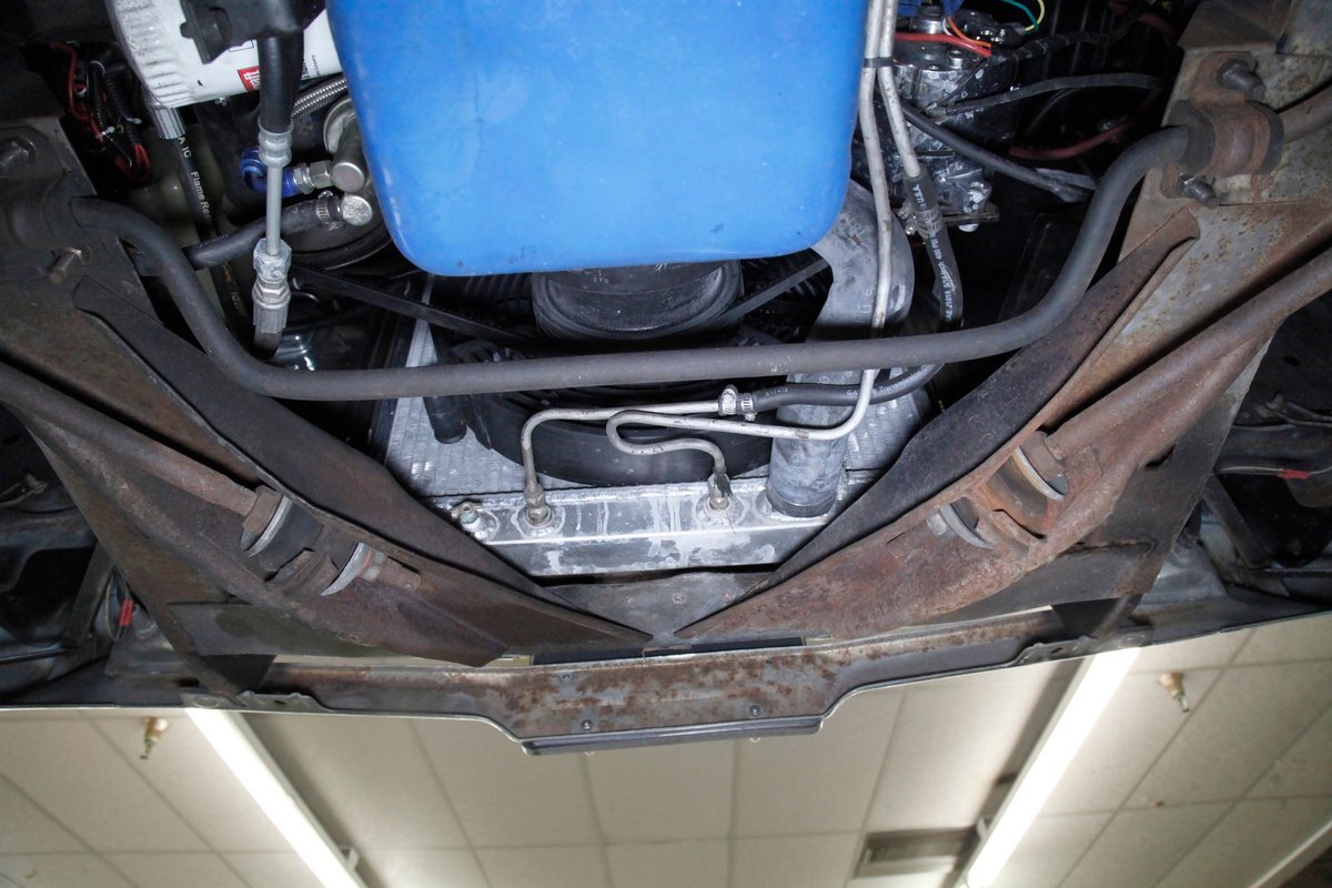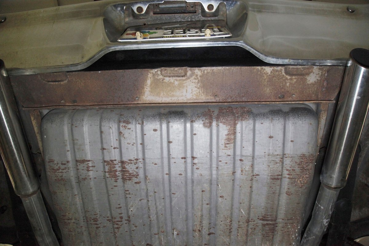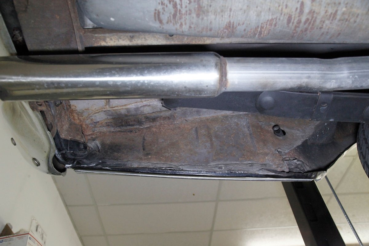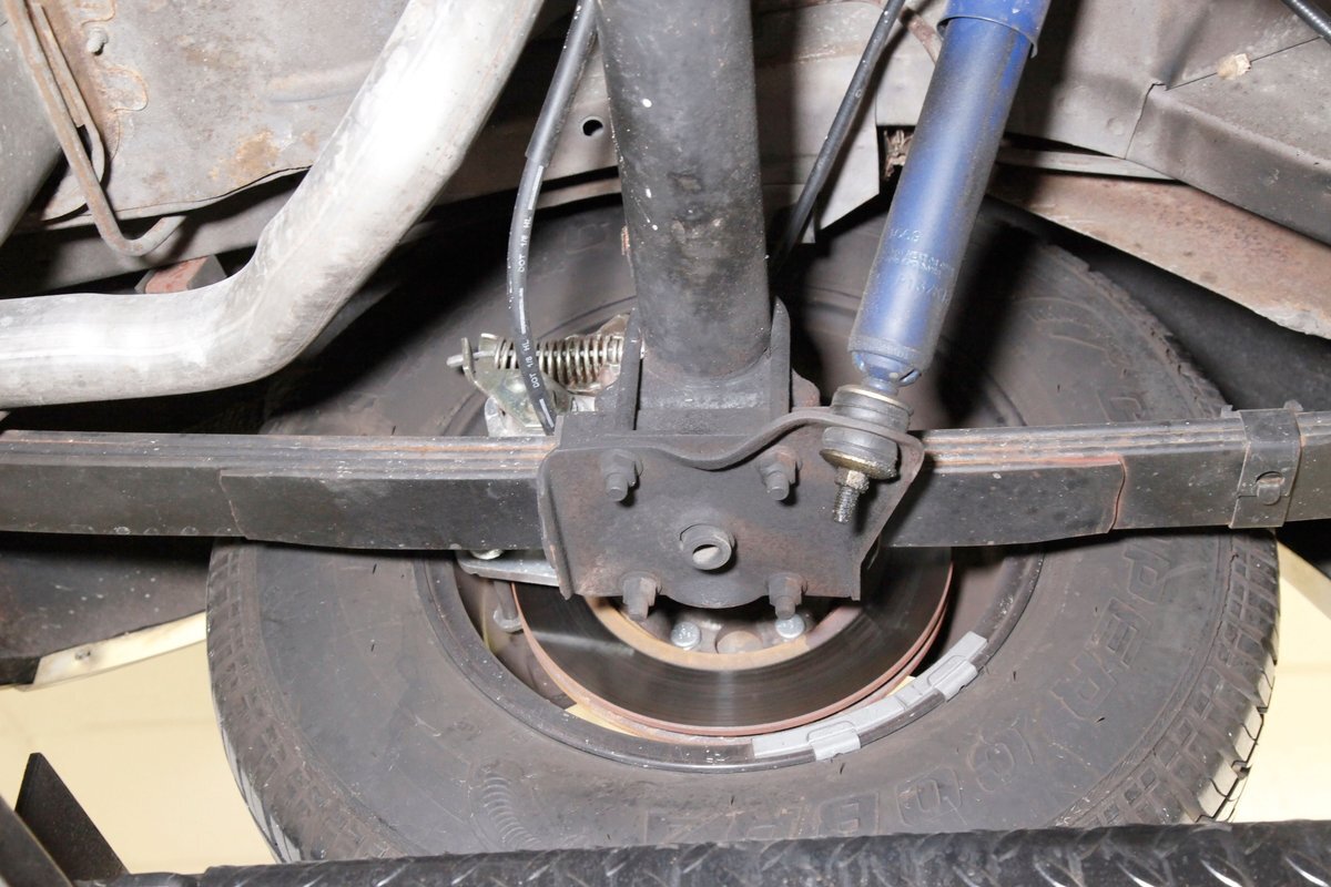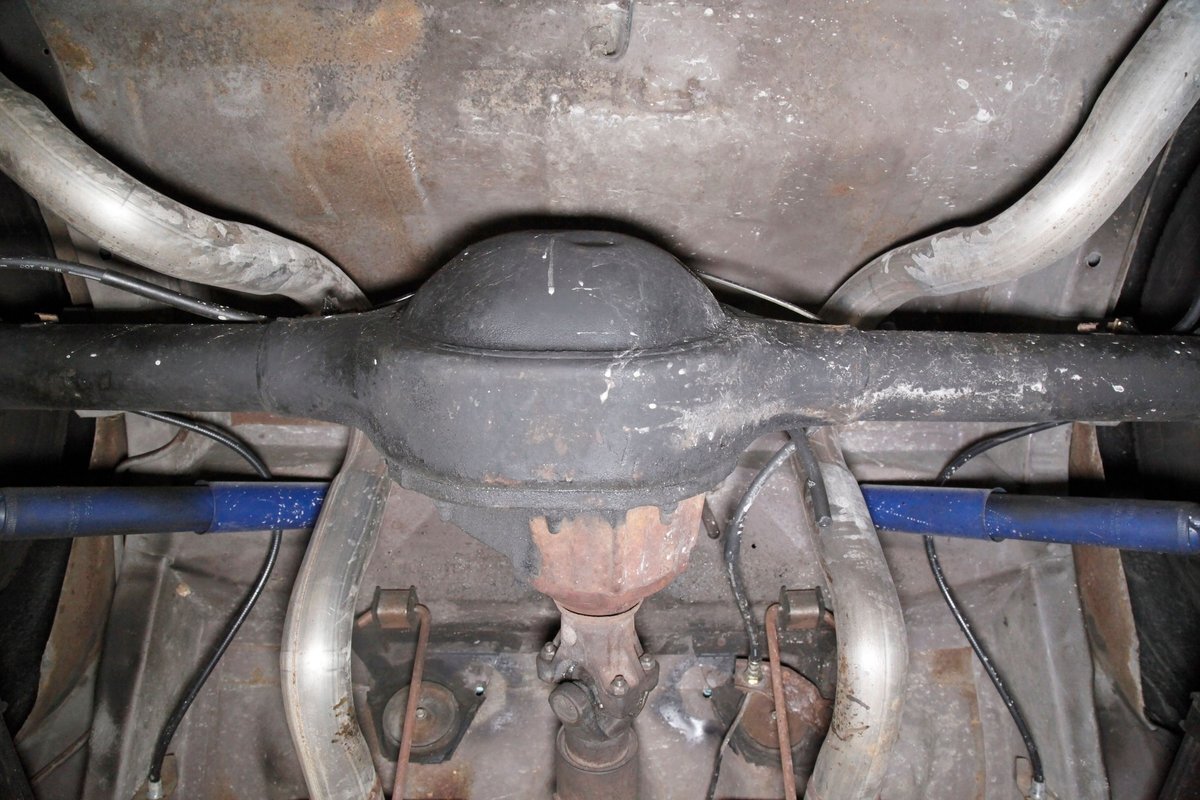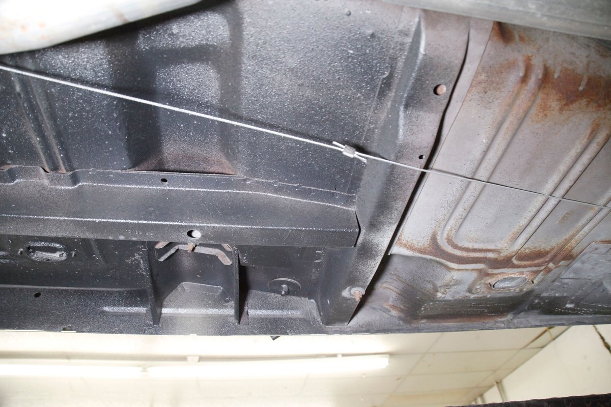 A bit of very light surface rust pan the floor pans and inner fenders but certainly structurally sound. We see dual exhaust making its way rearward, independent coil springs suspension in front, and leaf springs for the back. Power disc braking is on all 4 corners and new shocks have been added to this very clean environment underneath.