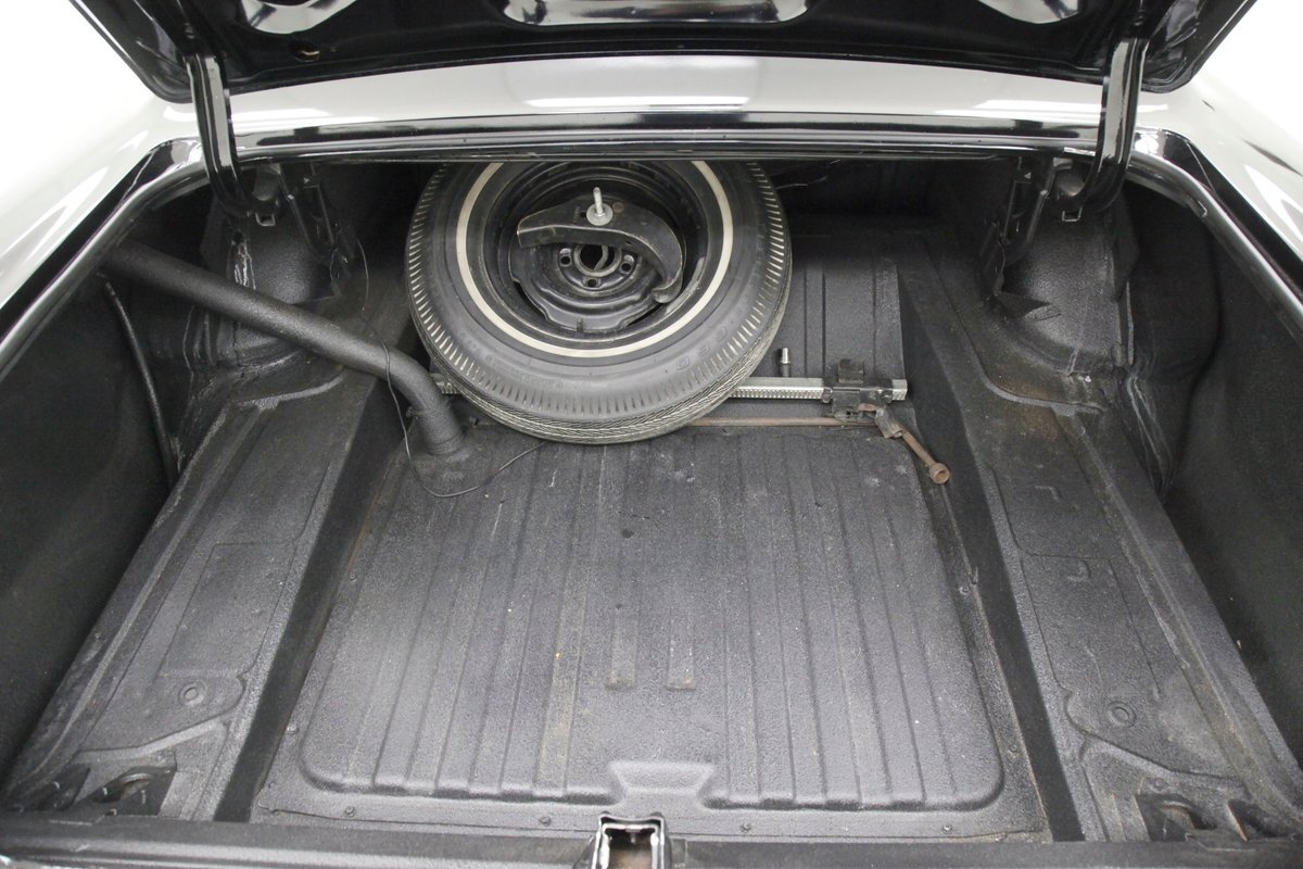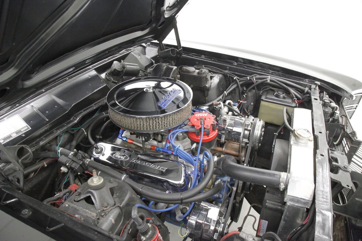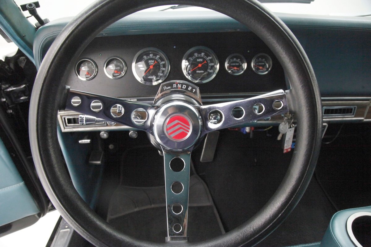 Under the hood in the completely restored engine bay all in semi gloss black I see the newer 331ci V8. It all looks very factory but it's far from that in a much better muscular way. Inside it sports a 281R hydraulic roller cam, a new oil pump and a billet aluminum timing gear set. It has Edelbrock E-Street aluminum heads and roller rockers. On top is a Holley 600cfm 4-barrel carb and on back is a FTI 2800 Stall converter connected to a new 3-speed C4 automatic. On the back to spin the tires is a Ford 8 inch 2.79 rear axle. All looking great with an aluminum radiator, and corrosion free parts attached to the mill including headers and a Flowmaster exhaust.