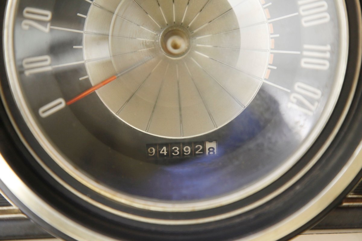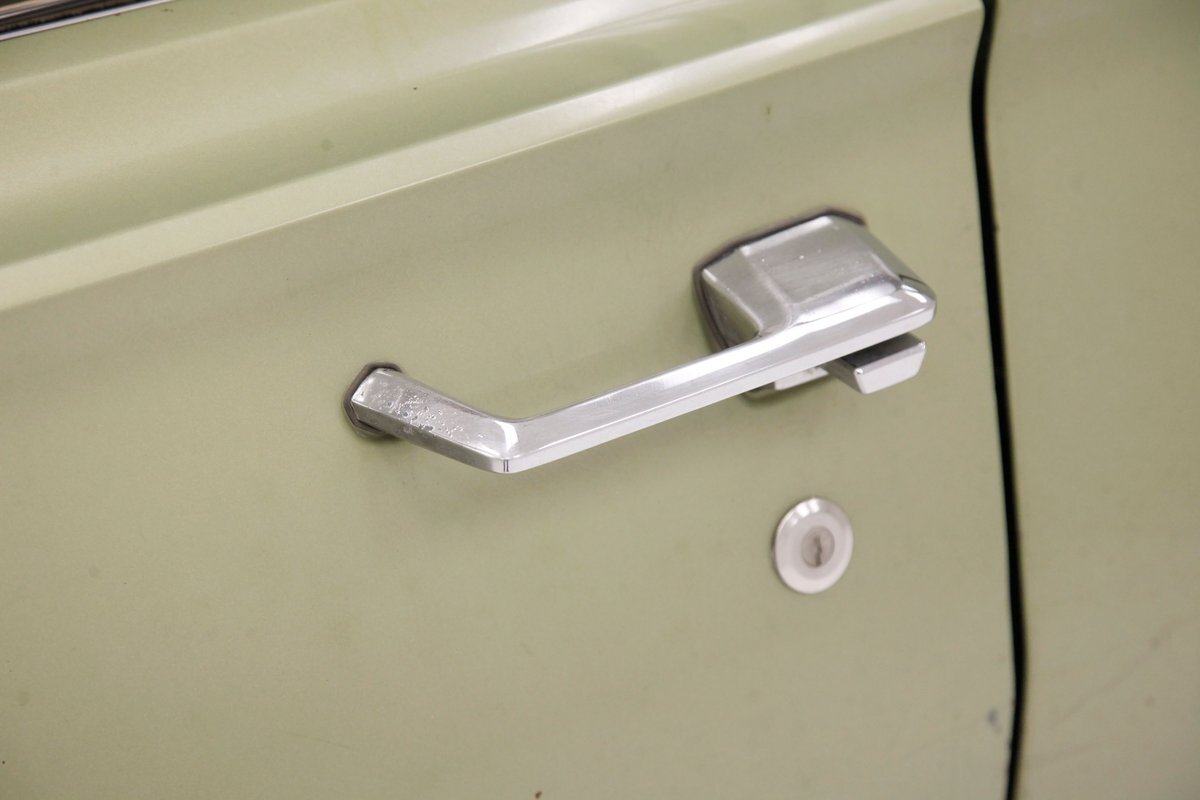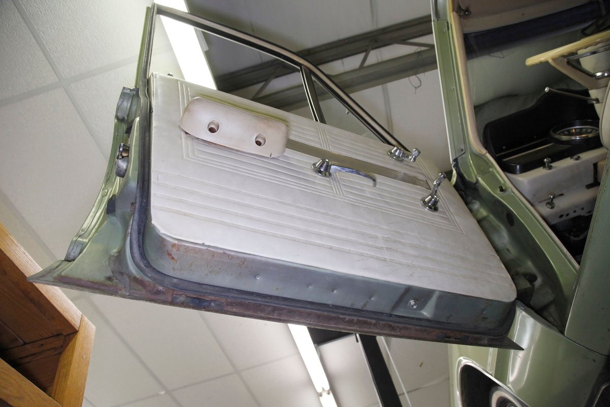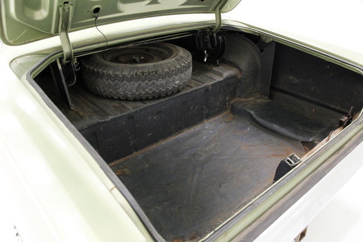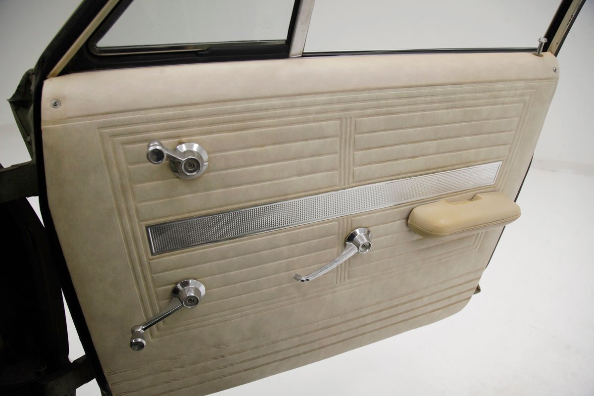 A swing of any of the well-balanced doors reveal parchment vinyl panels with eye catching embossments and a nice faux mesh insert. Each panel has varying degrees of wear and soiling but no tears. The original cut and sewn faded black carpet flood the floors and is protected by a black rubber mat. The bench seat up front shows smooth parchment vinyl boosters and nice cloth inserts, and the rear bench follows suit. All seating areas show soiling and water staining, particularly in the cloth insert areas. The black and chrome ribbed dash is in nice condition and houses all the essentials. An aftermarket AM/FM/Cassette stereo has been added and a crack free black padded topper completes the dash. Even in the trunk all is factory appearing with minimal rust.