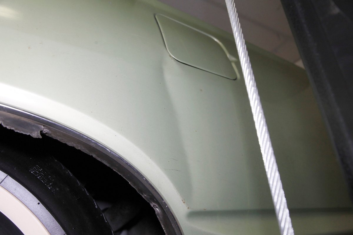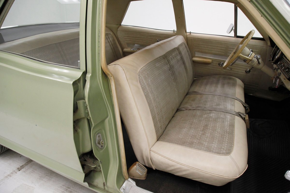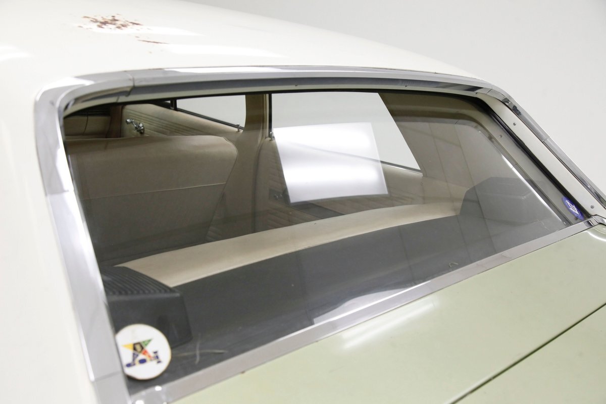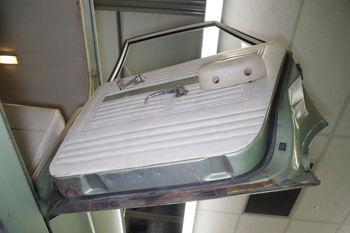 A swing of any of the well-balanced doors reveal parchment vinyl panels with eye catching embossments and a nice faux mesh insert. Each panel has varying degrees of wear and soiling but no tears. The original cut and sewn faded black carpet flood the floors and is protected by a black rubber mat. The bench seat up front shows smooth parchment vinyl boosters and nice cloth inserts, and the rear bench follows suit. All seating areas show soiling and water staining, particularly in the cloth insert areas. The black and chrome ribbed dash is in nice condition and houses all the essentials. An aftermarket AM/FM/Cassette stereo has been added and a crack free black padded topper completes the dash. Even in the trunk all is factory appearing with minimal rust.