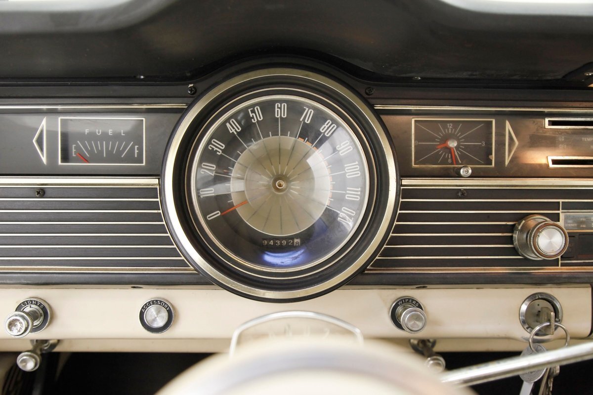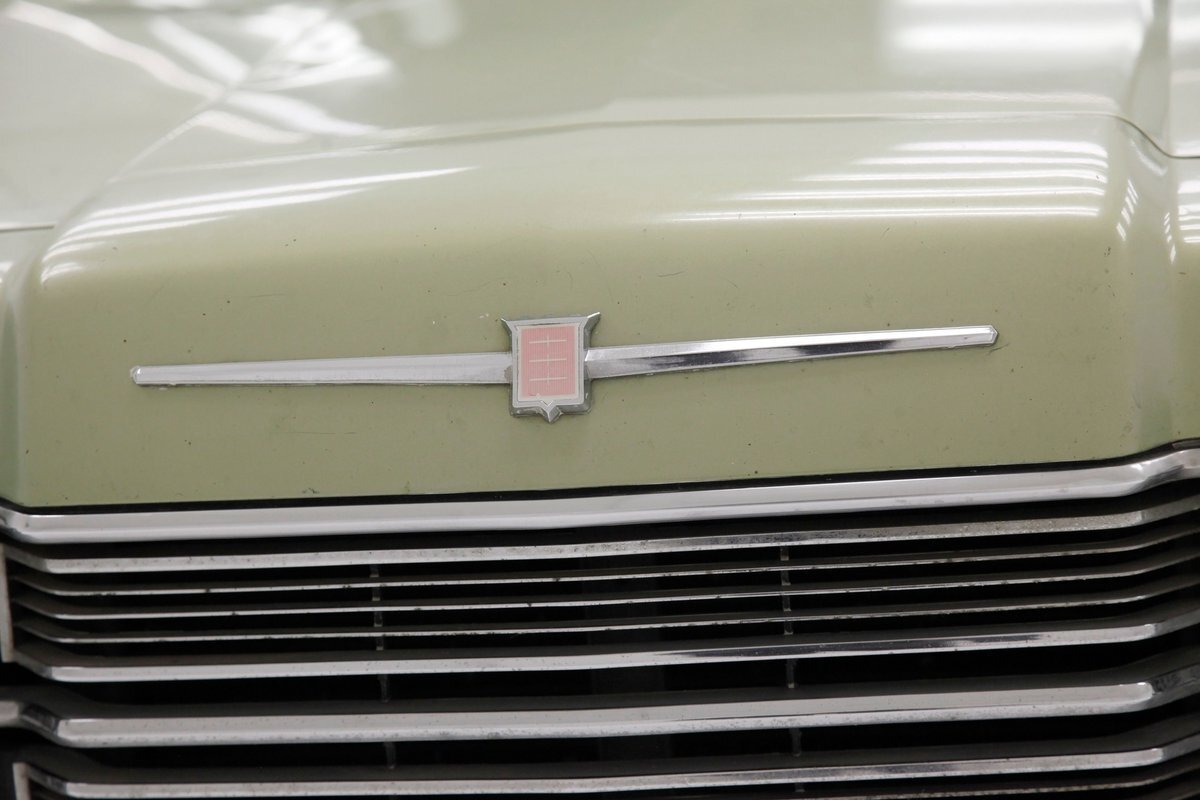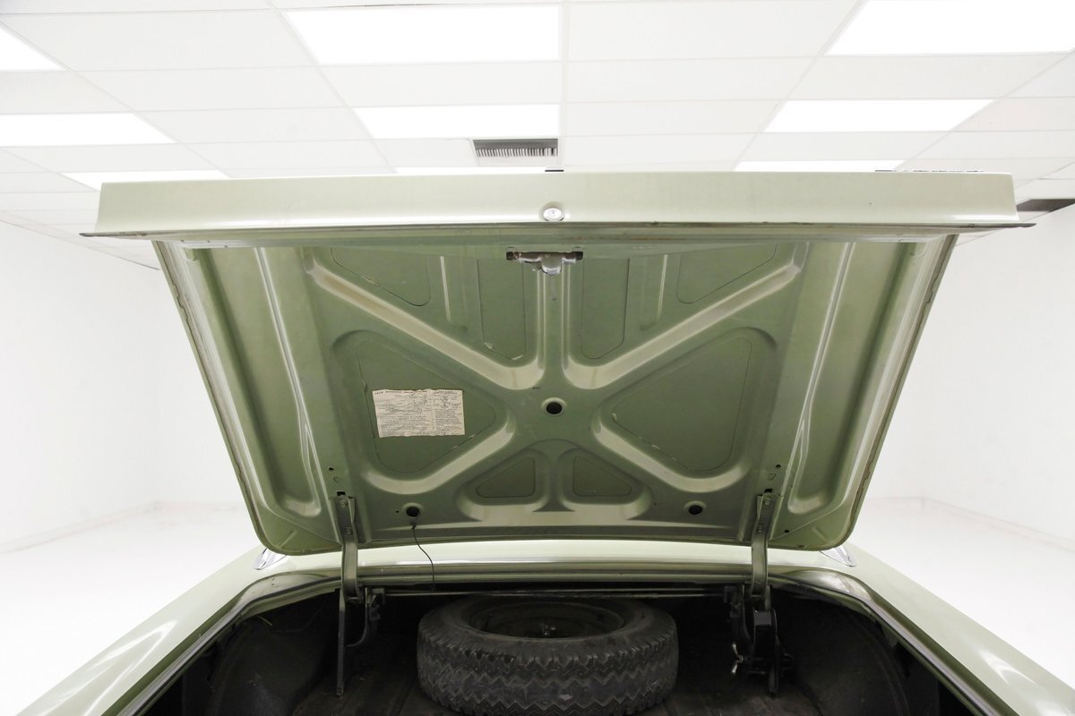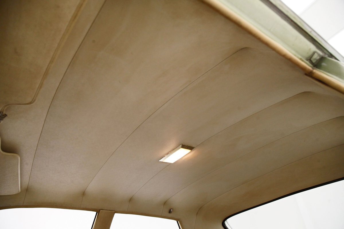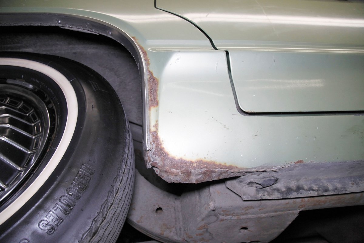 A swing of any of the well-balanced doors reveal parchment vinyl panels with eye catching embossments and a nice faux mesh insert. Each panel has varying degrees of wear and soiling but no tears. The original cut and sewn faded black carpet flood the floors and is protected by a black rubber mat. The bench seat up front shows smooth parchment vinyl boosters and nice cloth inserts, and the rear bench follows suit. All seating areas show soiling and water staining, particularly in the cloth insert areas. The black and chrome ribbed dash is in nice condition and houses all the essentials. An aftermarket AM/FM/Cassette stereo has been added and a crack free black padded topper completes the dash. Even in the trunk all is factory appearing with minimal rust.