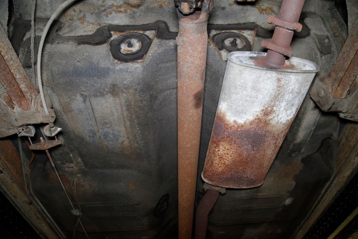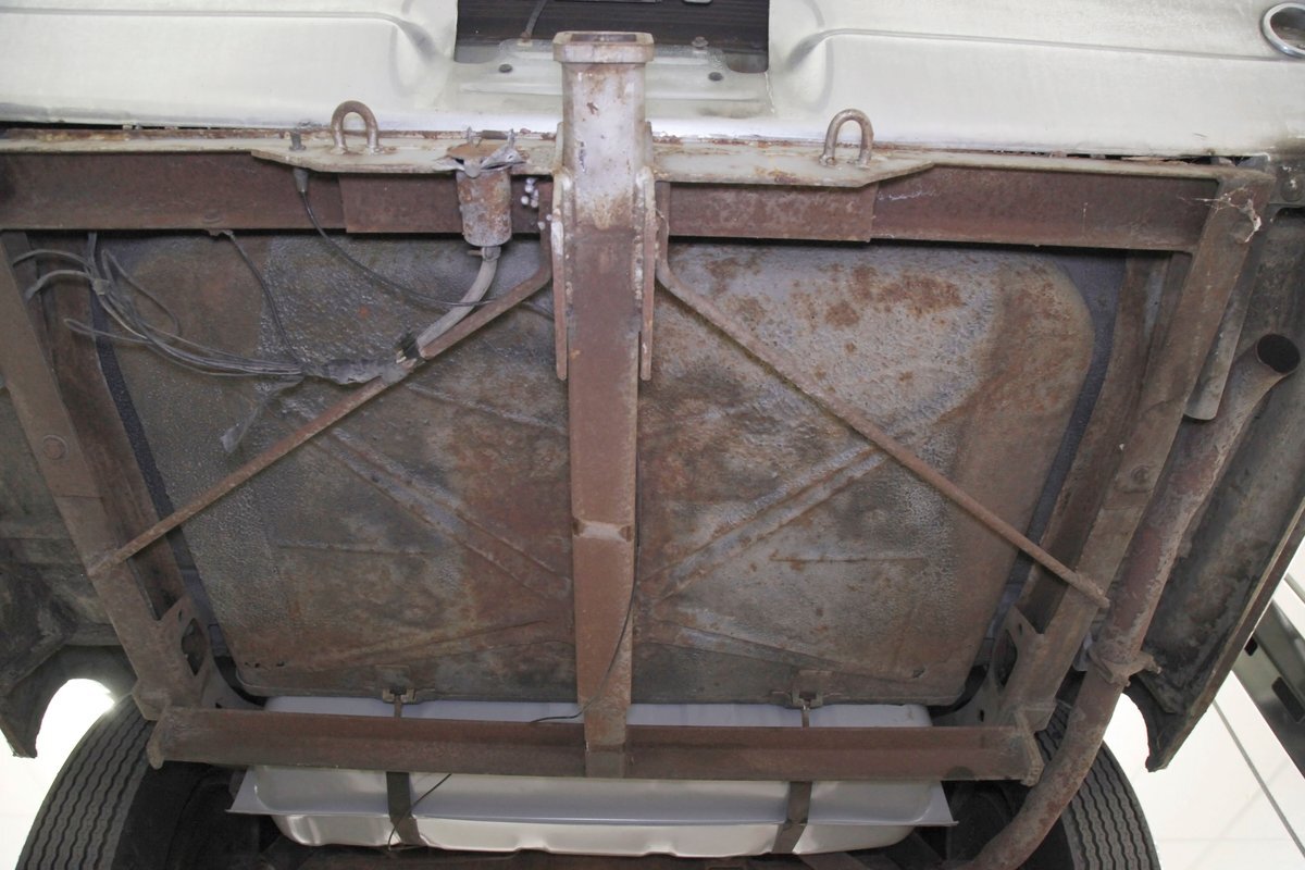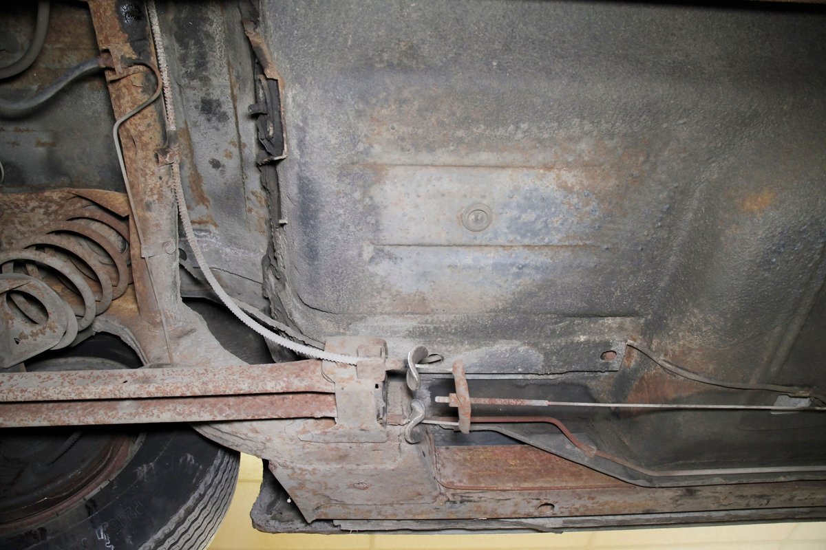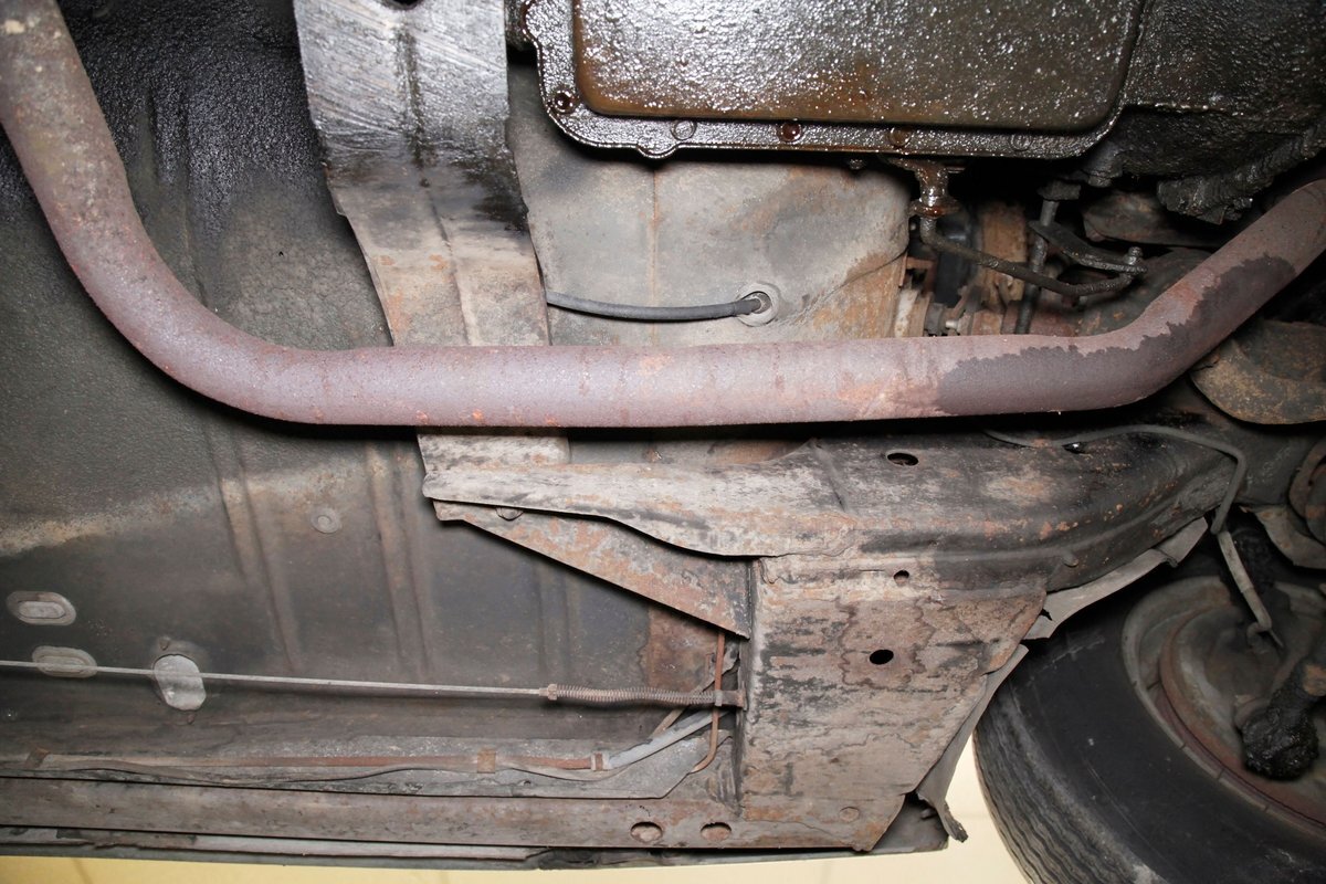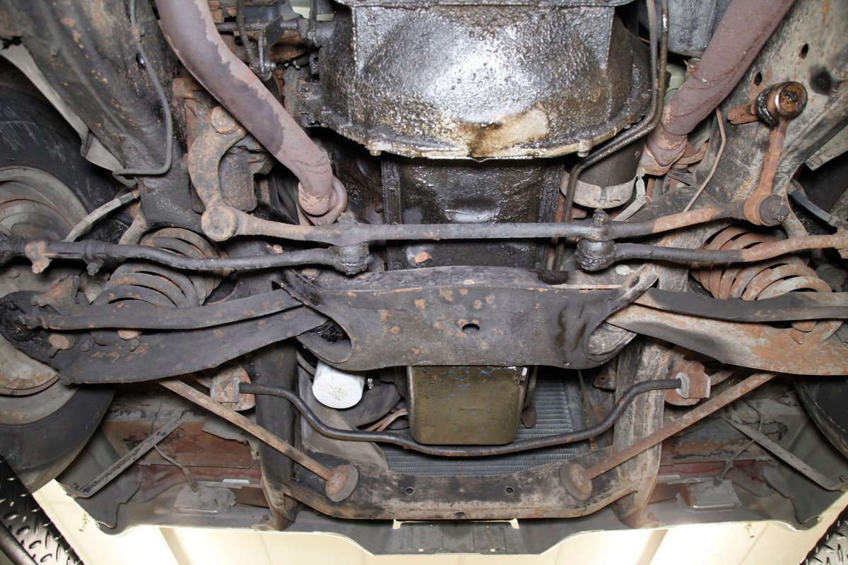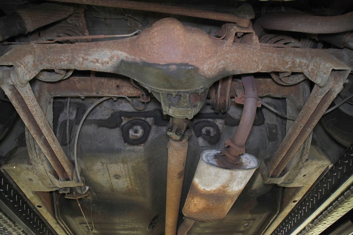 Some surface rust coats the undercarriage, but it remains structurally sound and invasive rust free. A trailer hitch and wiring have been added to the back of the frame for all your hauling needs. Independent coil springs for the front and a 4 link with coil springs for the back along with power drum brakes on all 4 corners can be seen underneath. A single exhaust system with a stock style muffler is in charge of expelling spent fumes and shows with surface rust throughout.