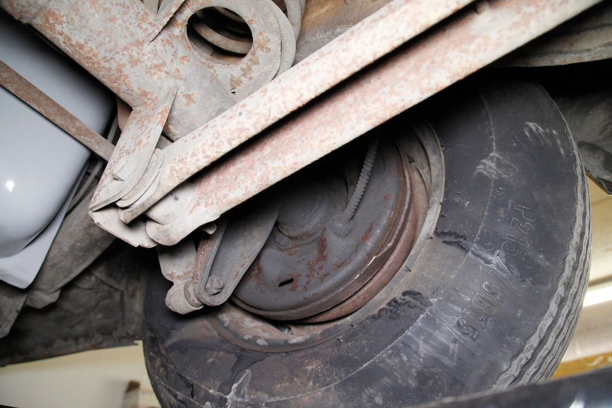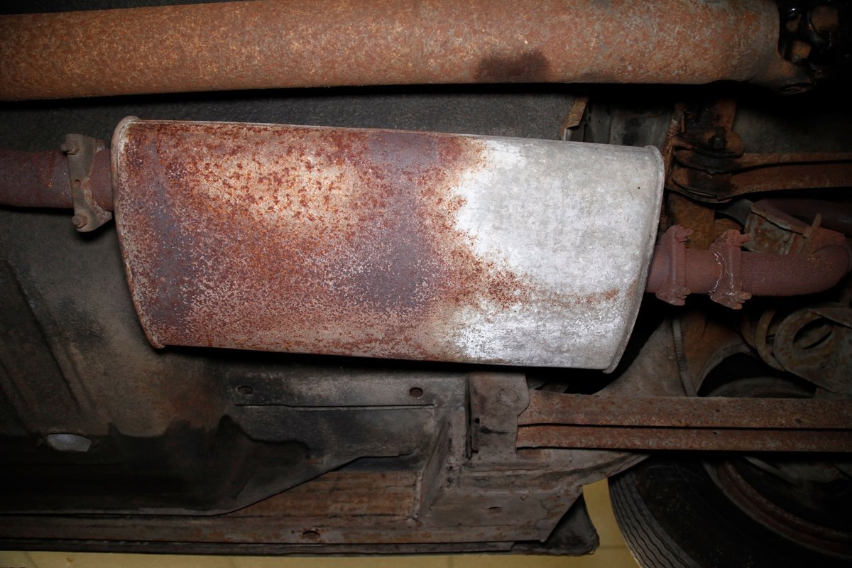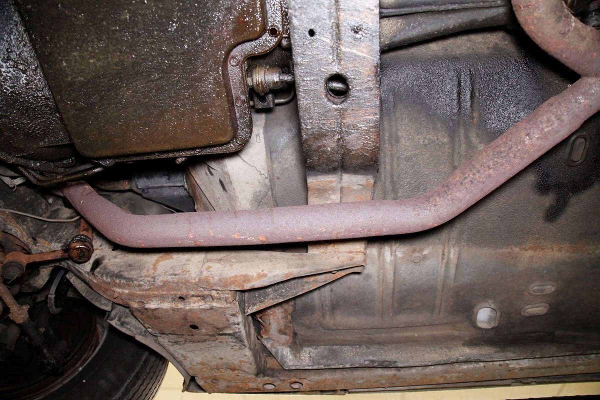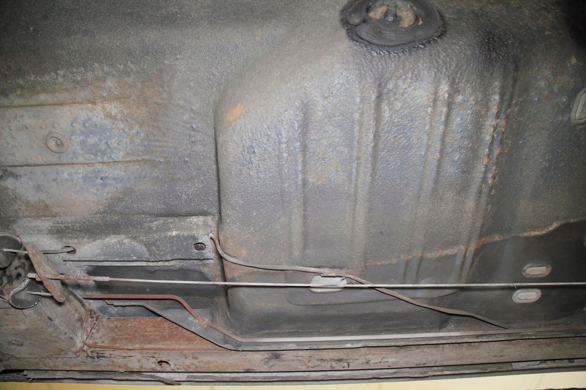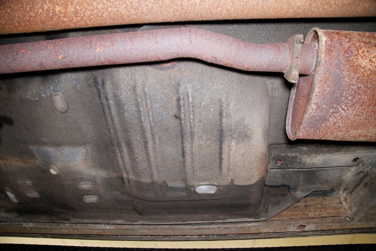 Some surface rust coats the undercarriage, but it remains structurally sound and invasive rust free. A trailer hitch and wiring have been added to the back of the frame for all your hauling needs. Independent coil springs for the front and a 4 link with coil springs for the back along with power drum brakes on all 4 corners can be seen underneath. A single exhaust system with a stock style muffler is in charge of expelling spent fumes and shows with surface rust throughout.