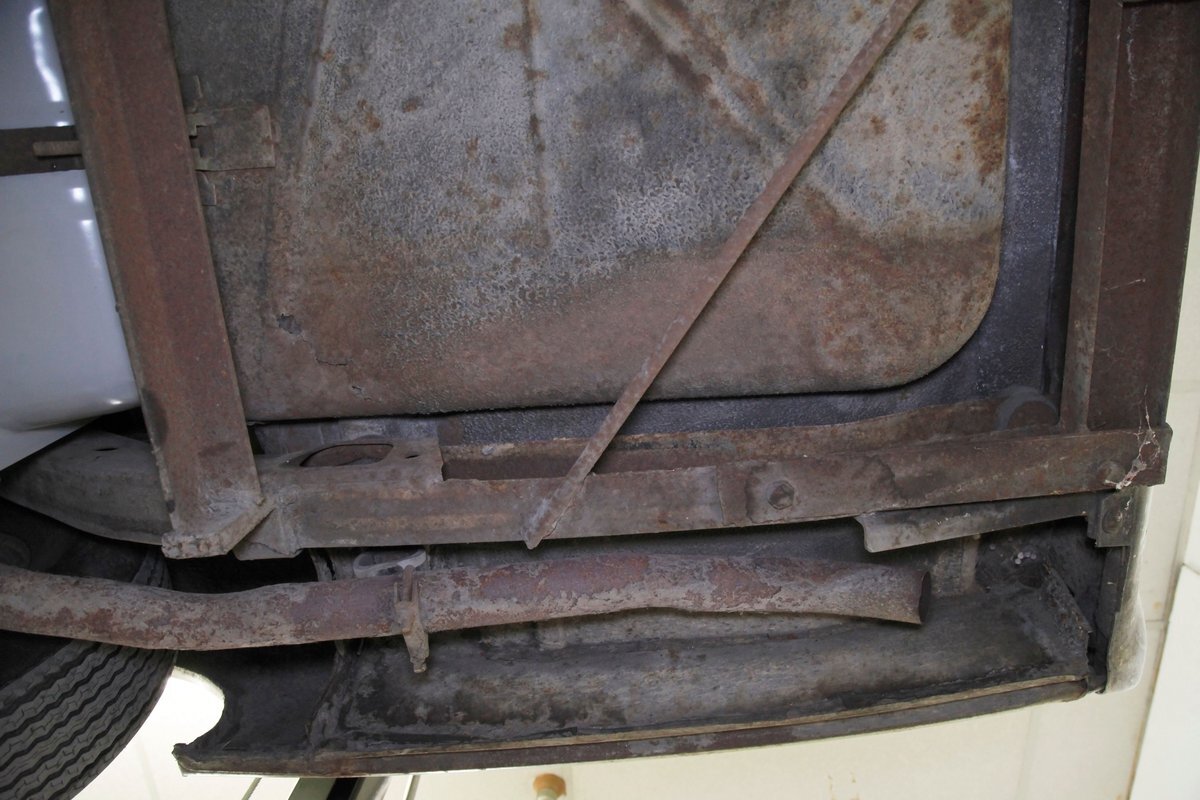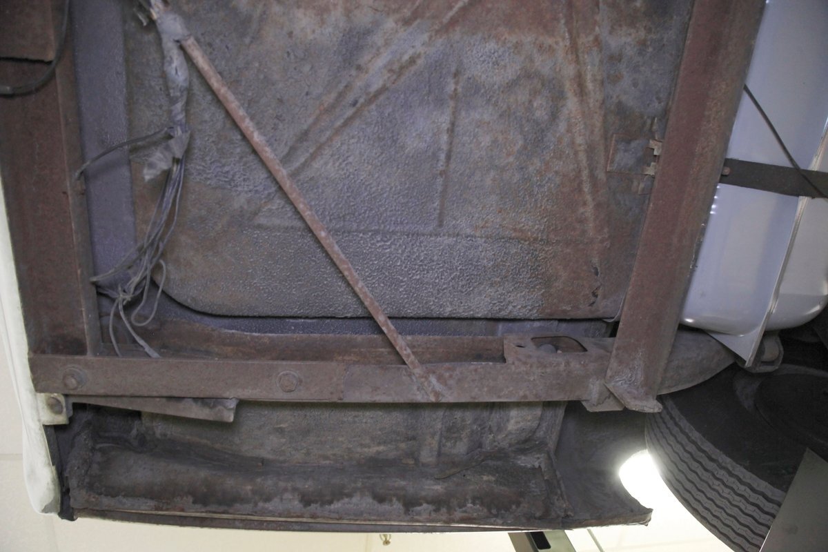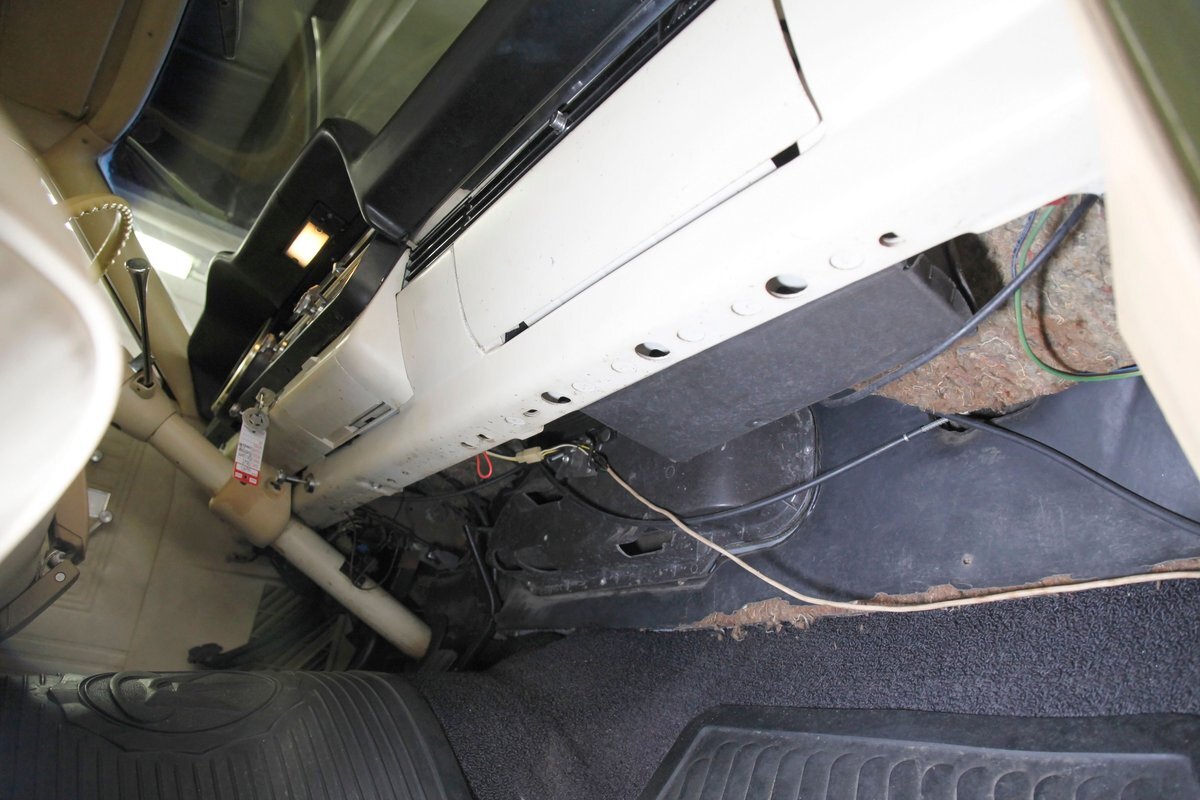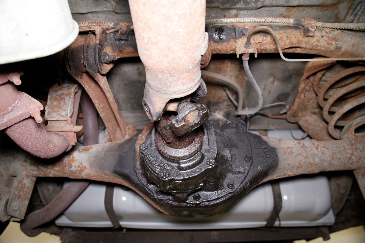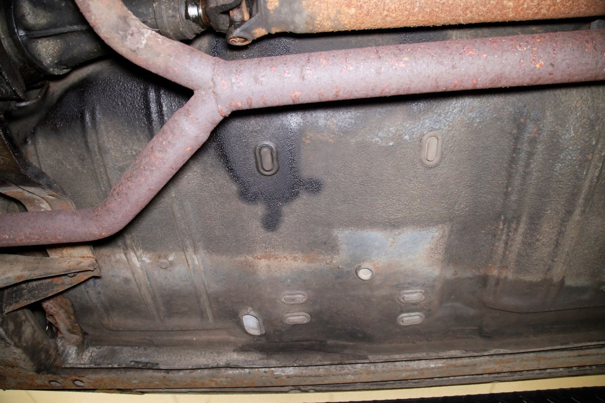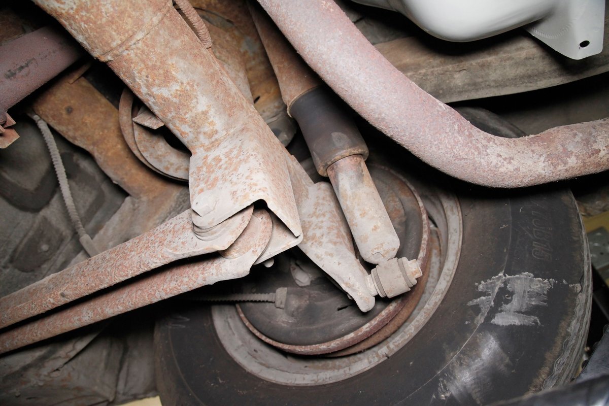 Some surface rust coats the undercarriage, but it remains structurally sound and invasive rust free. A trailer hitch and wiring have been added to the back of the frame for all your hauling needs. Independent coil springs for the front and a 4 link with coil springs for the back along with power drum brakes on all 4 corners can be seen underneath. A single exhaust system with a stock style muffler is in charge of expelling spent fumes and shows with surface rust throughout.
