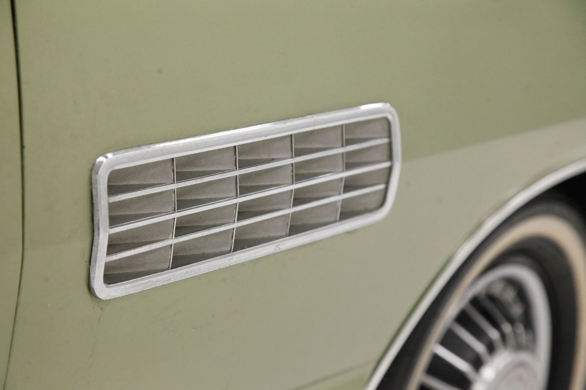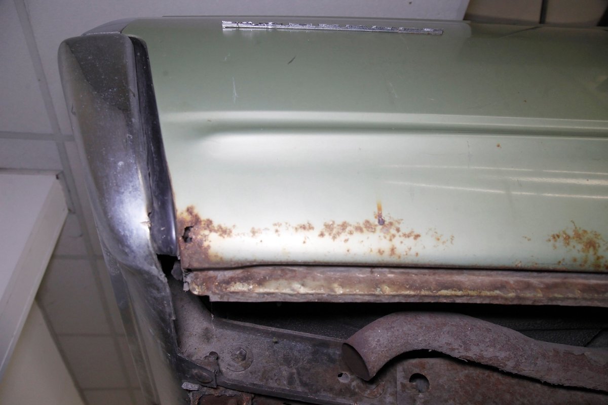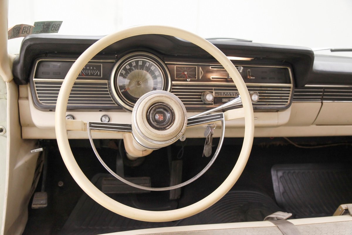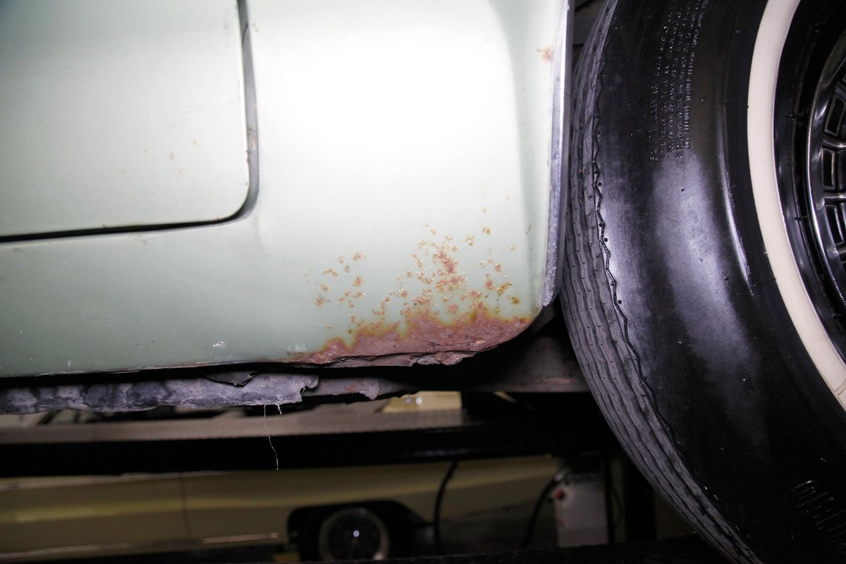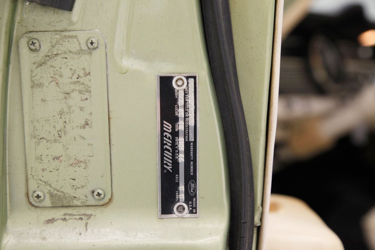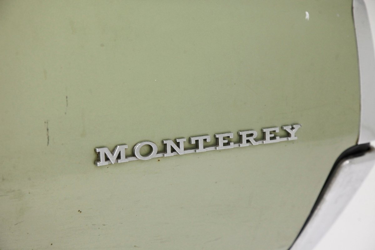 Lime Metallic, in worn condition showing chips, dings, nicks and some rust but retains some of its original shine, is the paint color for the lower body of this Monterey. A white painted top is on and shines well but does have some rust staining, particularly toward the rear of the roof. The chrome bumpers are nice and straight but suffer from some tarnish and staining. All brightwork, correct badging, and exterior lighting are in good condition. Gaps are a bit funky at places but overall, within acceptable tolerances just not perfect alignment. A sizable dent is noted just in front of the fuel filler door and invasive rust is starting both fore and aft of each rear wheel. Elongated diamond shaped vertical tail lighting, which is iconic to this car, is seen on the back and integrates with the rear bumper. Turbine style wheel covers with a central Mercury badge are on all 4 corners and are wrapped in thin whitewall bias ply tires.