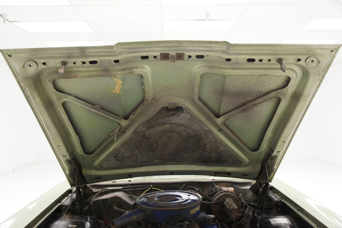 Bright blue valve coverings and an air cleaner assembly grace the 390ci V8 with a 2bbl carburetor is perched on top. This engine rests within an unrestored patina riddled engine bay. Bolted to the back is a C6 3-speed automatic transmission and putting the power to the ground is a Ford 9" rear axle weighing in with a 2.75 ratio.