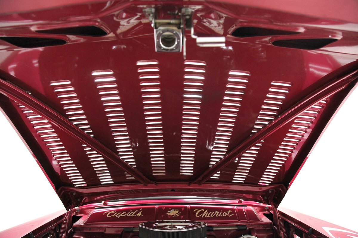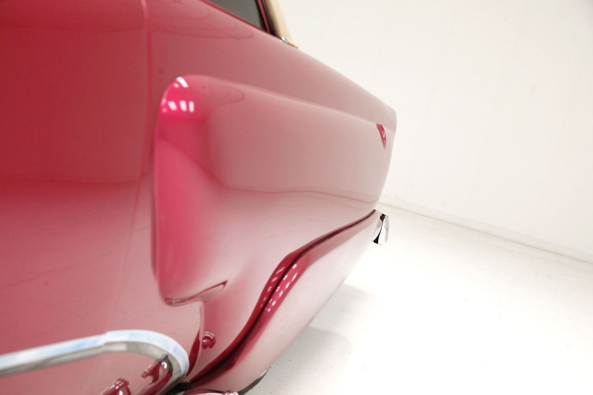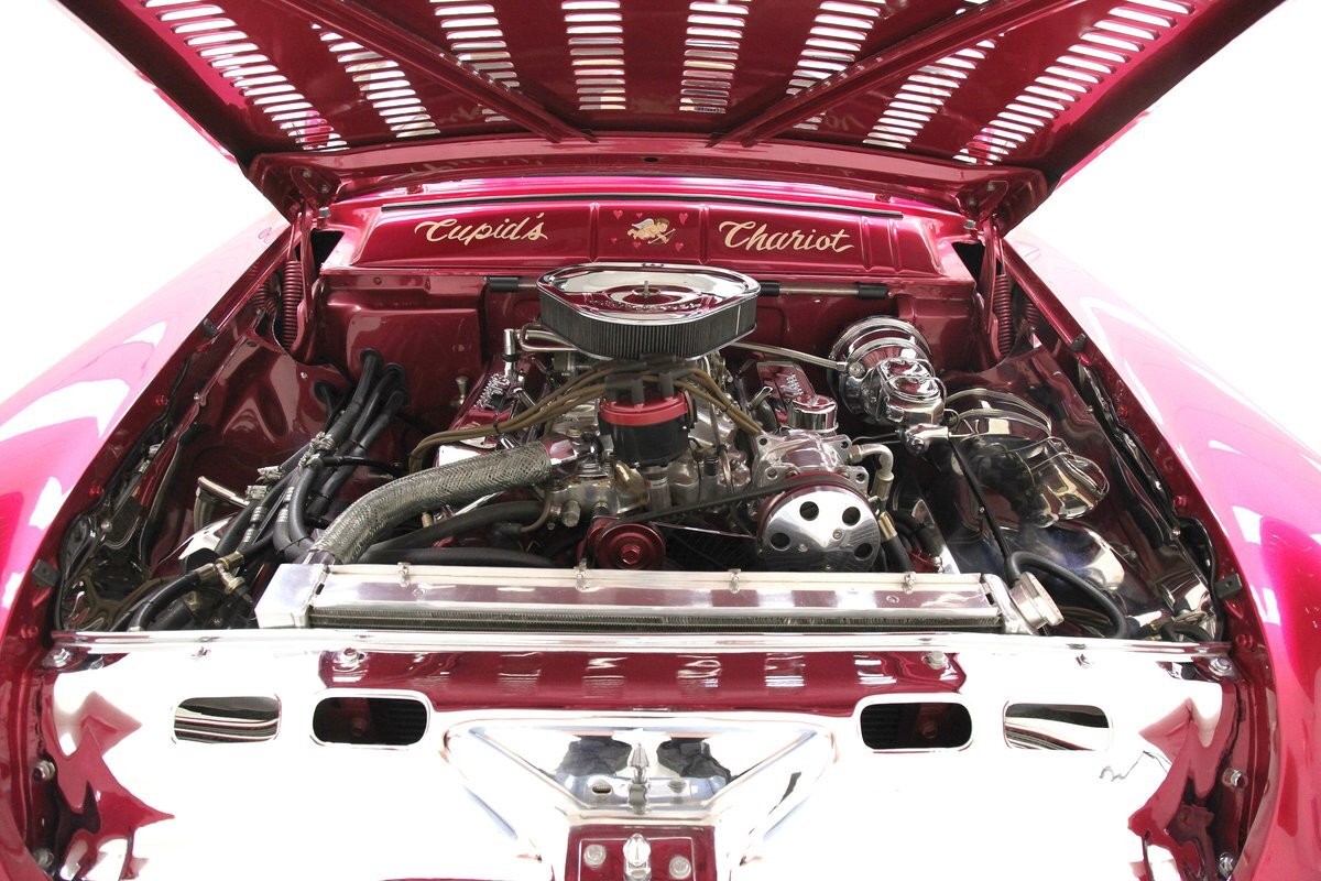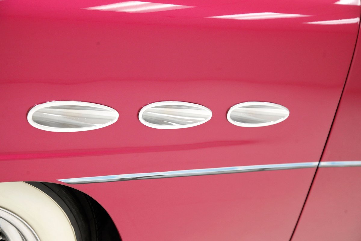 From the custom tube grille to the Packard taillights and continental rear bumper, this consignment oozes cool, and is in the dictionary as an example picture under the word cruiser. Shades of the Batmobile for the custom headlights which are visored and a great beginning to the wonderful Buick porthole styled front quarter. Chromed rods are halved by a large shiny bumper, and below more candy for the chin panel. The hood has been shaved of any badging and has been totally louvered in lieu of a hood scoop. Looking down either side its 50's solid gold design with a chromed diving swoop trim spear, the trio of oval Buick porthole vents just aft of the wheel well. On the back a body bump out replaces what was chrome trimmings and a custom integrated fender skirt seamlessly melts into the rear bumper. The bottom of the rockers are framed with lake pipes, old skool kewl fer sur. All these big steel panels are bathed in custom PPG raspberry or what this writer would lovingly refer to from now on as Flamingo! The top has been chopped and refitted neatly around the wrap-around windshield and it is covered perfectly with Mercedes Benz Natural, (beige), canvas. All trimmings for the glass are in the Flamingo save for the rear glass which came off of a 48 Chevy has weatherstripping. Door handles are shaved, and have teardrop mirrors, and dummy spotlights attached. Looking to the back of course the Continental rear bumper which sports a custom airbrushed artwork of "Cupid's Chariot" which is certainly aptly named because I'm already in love! Frenched taillights are like a 55 Chevy on steroids which have been willingly donated from a Packard. Glistening on all 4 corners are chromed wire wheels with flame motif knockoff hubs. These are wrapped by wide whites and are stunningly beautiful not unlike the rest of the above exterior!